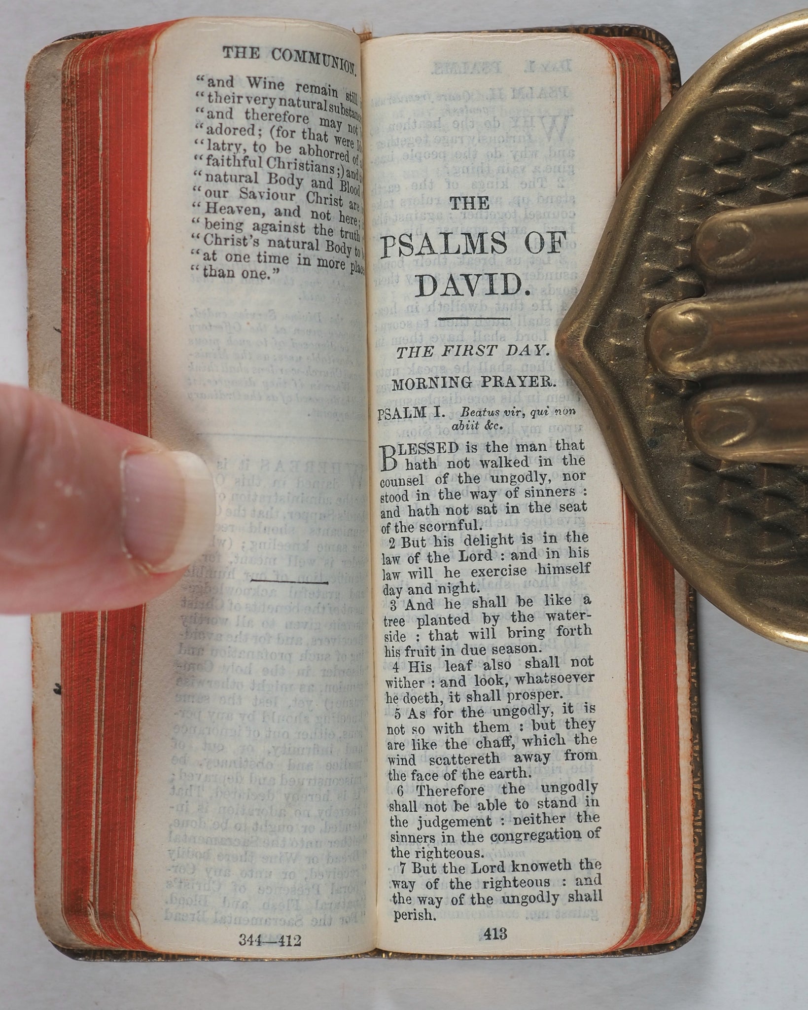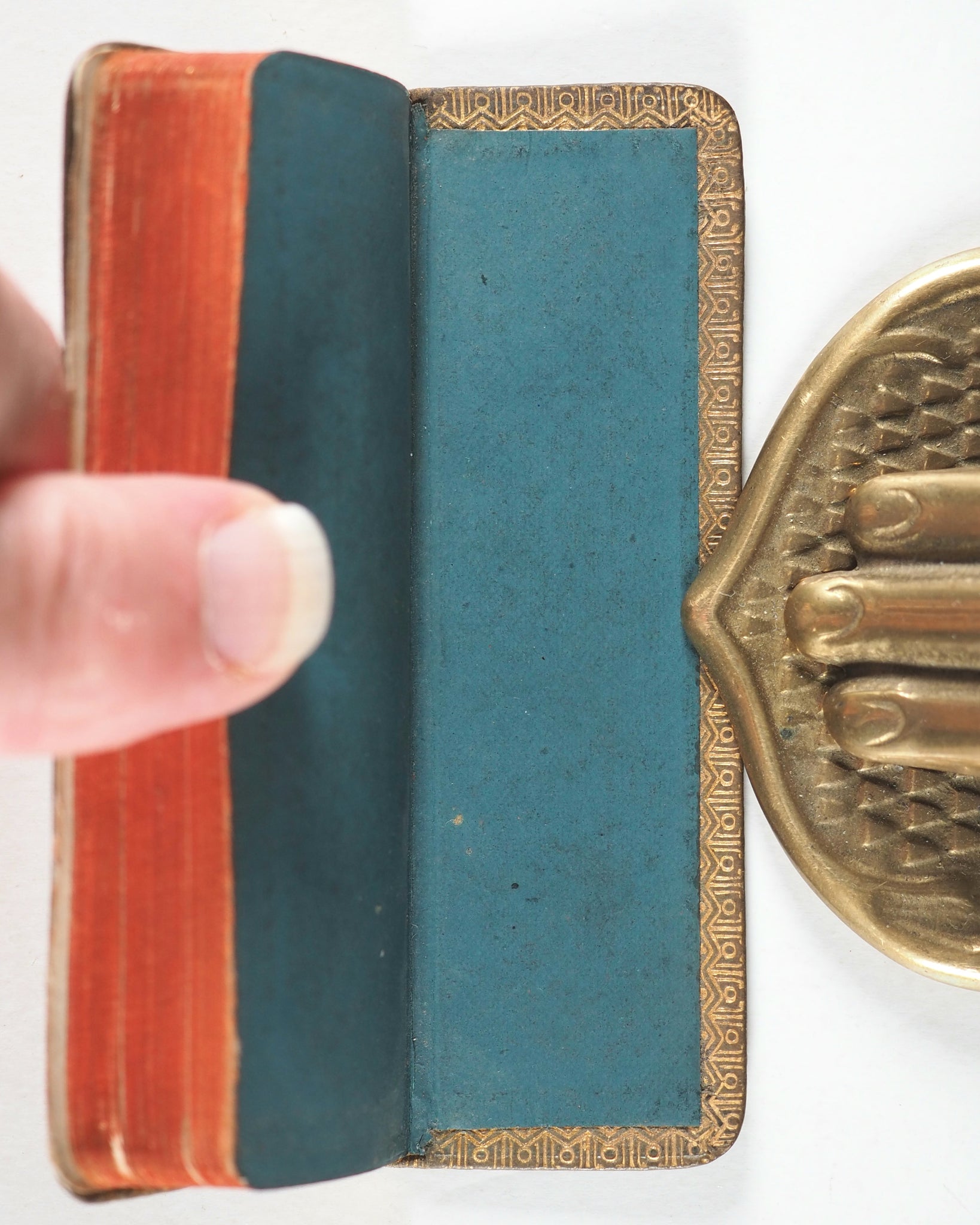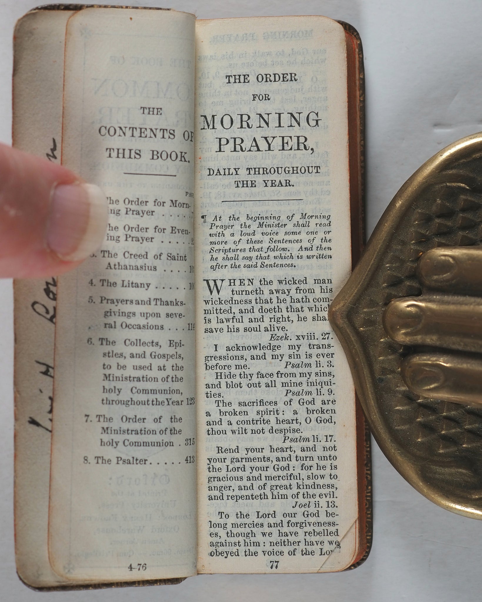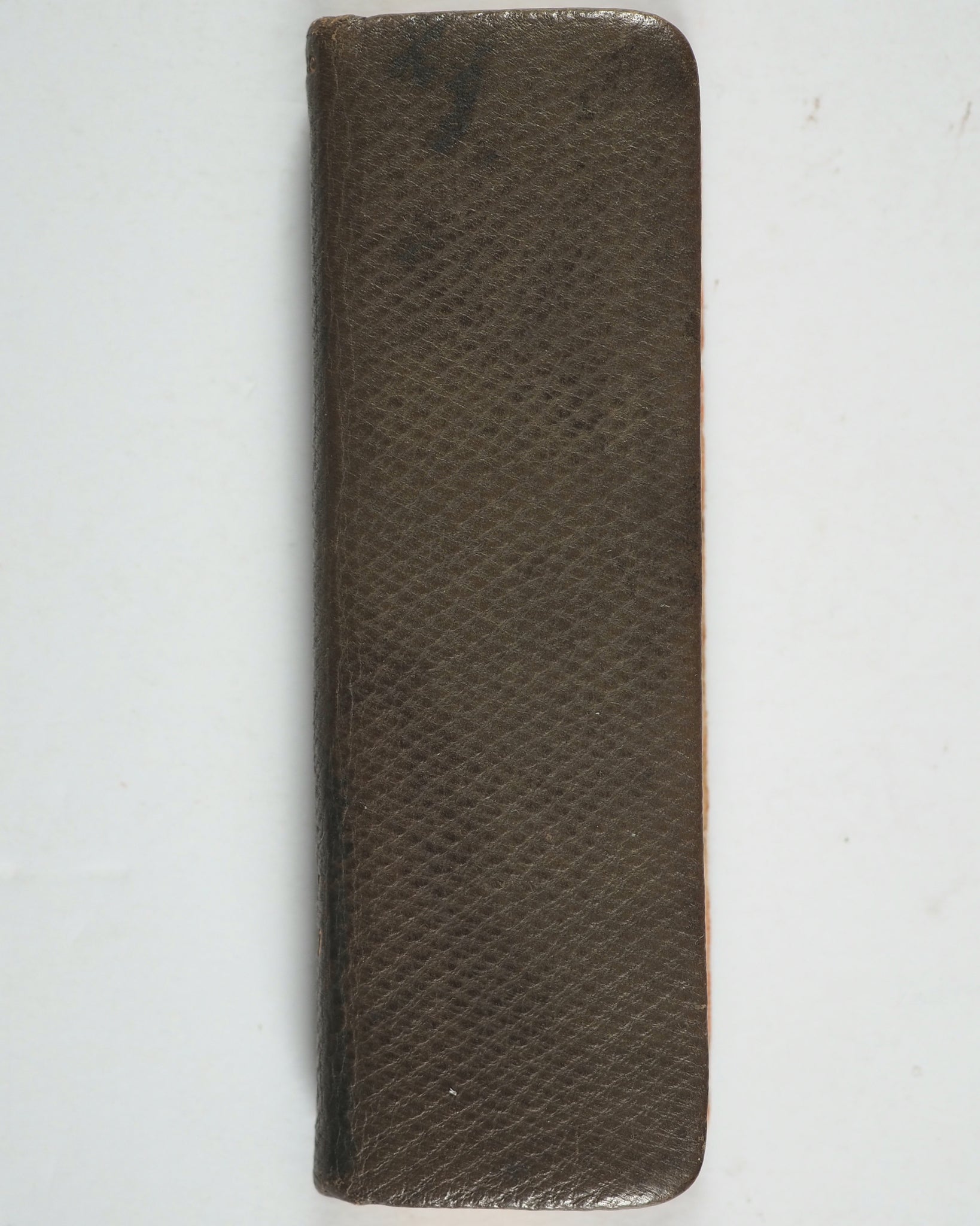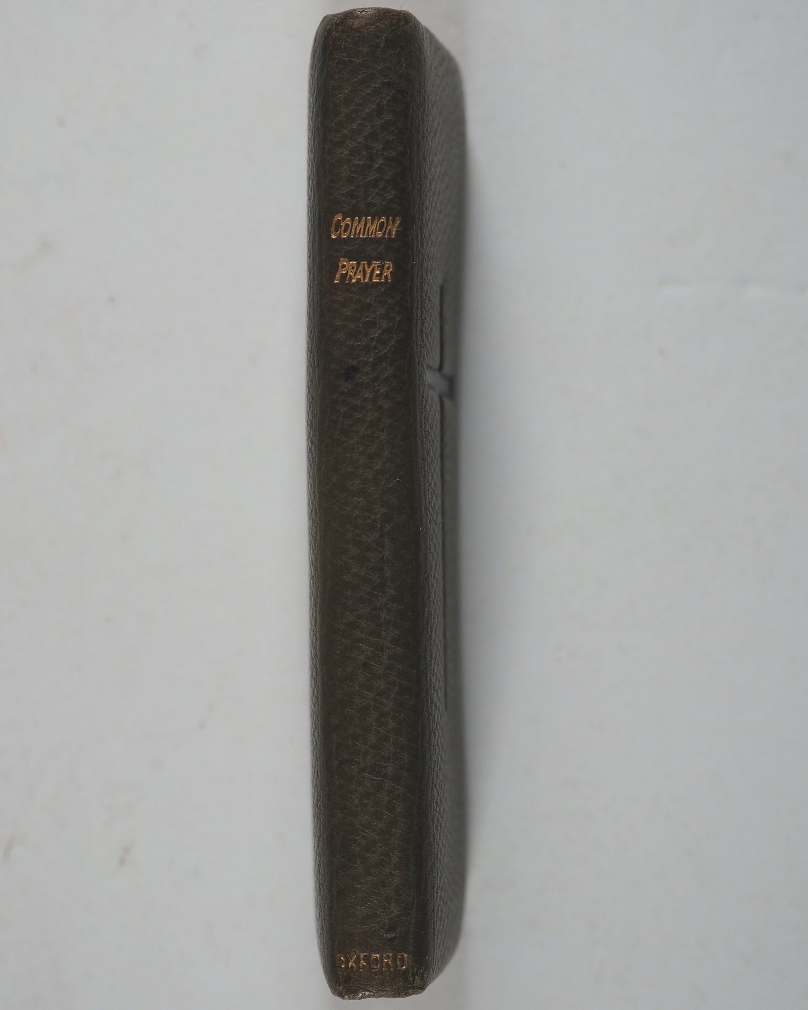 7. The order of the ministration of the holy Communion. 8. The Psalter. Lacks half-title. Rounded corners. Inner gilt dentelles. All edges gilt over red. Original teal endpapers. Ink ownership inscription on verso of front free endpaper, dated 1944. 28 x 92mm. Original and uncommon full olive morocco binding. Gilt titling and 'Oxford' on spine. Front cover embossed with black cross. Very slightly rubbed and a few minuscule black spots. Bondy, 131. Spielmann, 154A. Welsh, 1855. OCLC 1016654958. WorldCat locates one worldwide (Boston Public Library).