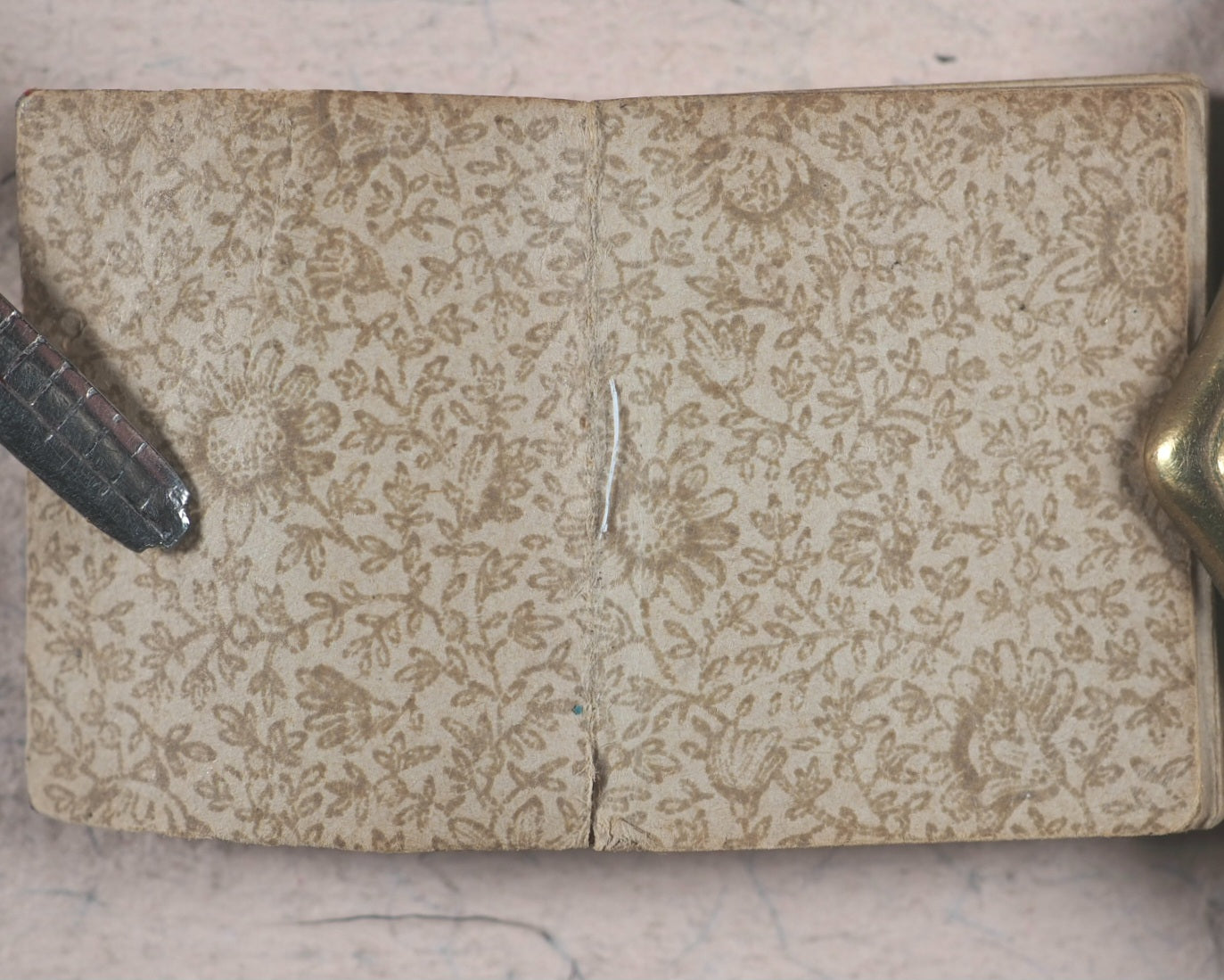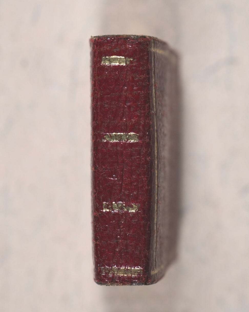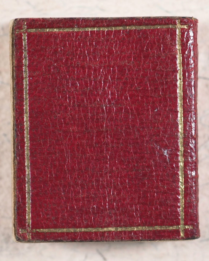 Last - 34th -edition of around 1860 (?). All edges gilt. 128 unnumbered printed pages. 5-point. Printed by Spottiswoode & Co. All edges gilt. Original floral endpapers. 27 x 32 mm. Original black roan. Gilt ruled borders and horizontal double ruled gilt lines on the spine. According to Bondy, this title "belongs to the best-loved miniature books, and was obviously much treasured by our Victorian ancestors." At least 34 editions were published in England, making it the most common miniature book of the first half of the 19th Century. The earlier editions are less commonly found today, and so is the final Spottiswoode edition. Bondy, 127. Spielmann, 466 - for 5th, 10th, and 17th editions. Welsh, 6440. No OCLC number. WorldCat locates no copies of this edition worldwide.