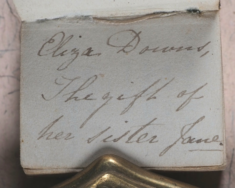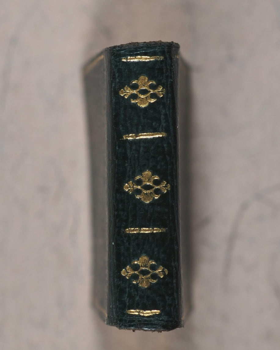 First edition. All edges gilt. 128 printed pages. Printed by Charles Whittingham, Chiswick Press. Contemporary ink inscription on front free endpaper. Provenance: Eliza and Jane Downs. 5-point. All edges gilt. Original cream endpapers. 27 x 32 mm. Original green roan. Gilt ruled borders and horizontal ruled gilt lines and floral tooling on the spine. According to Bondy, this title "belongs to the best-loved miniature books, and was obviously much treasured by our Victorian ancestors." At least 34 editions were published in England, making it the most common miniature book of the first half of the 19th Century. The earlier editions are less commonly found today. Bondy, 127. Spielmann, 466 - for 5th, 10th, and 17th editions. Welsh, 6417. No OCLC number. WorldCat locates no copies of this edition worldwide.