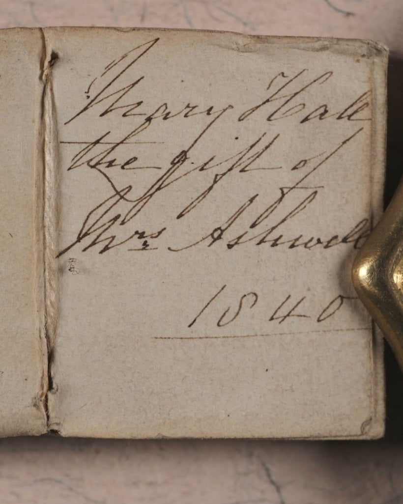 Fifteenth edition. 128 pages. Finely printed by Charles Whittinghamat the Chiswick Press, using 5-point type. All edges gilt. Original cream endpapers. Contemporary ink inscription on front free endpaper, dated 1840. Provenance: Mary Hall. Last seven leaves lower corners defective to margins, only one or two letters of print lacking. 27 x 32 mm. Original red roan. Gilt ruled borders and gilt floral decoration with horizontal ruled gilt lines on the spine. Edges and corners very slightly rubbed. These short Bible extracts, one for each day of the year, were highly appreciated by the Victorians and so they went into about 40 editions from about 1830. According to Bondy, this title "belongs to the best-loved miniature books, and was obviously much treasured by our Victorian ancestors." At least 34 editions were published in England, making it the most common miniature book of the first half of the 19th Century. The earlier editions are less commonly found today. Bondy, 127. Spielmann, 466 - for 5th, 10th, and 17th editions. Welsh, 6429. No OCLC number. WorldCat locates no copies of this edition worldwide.