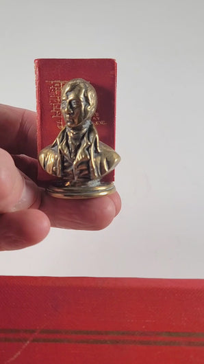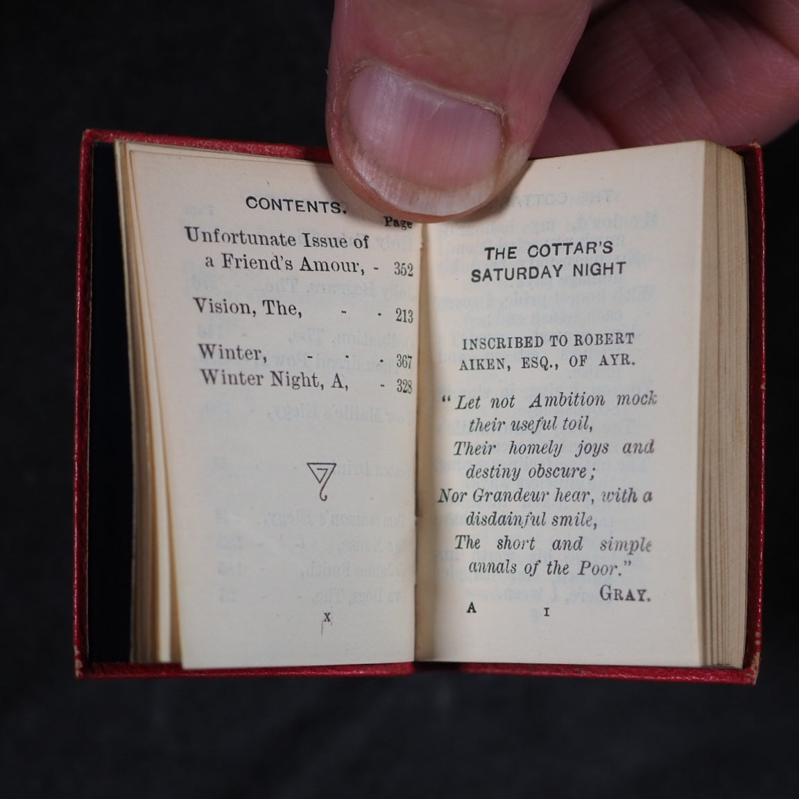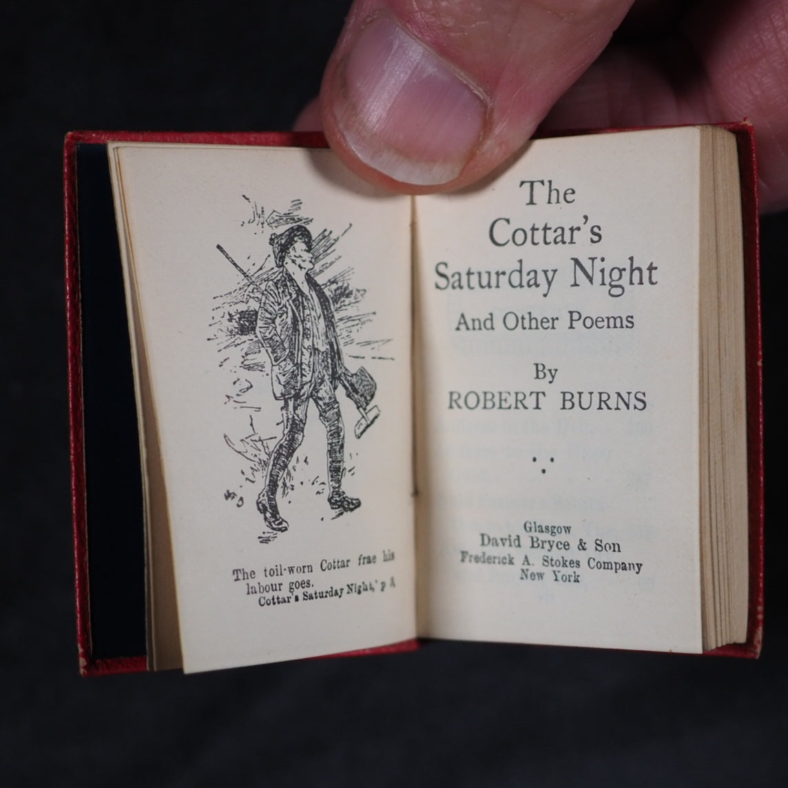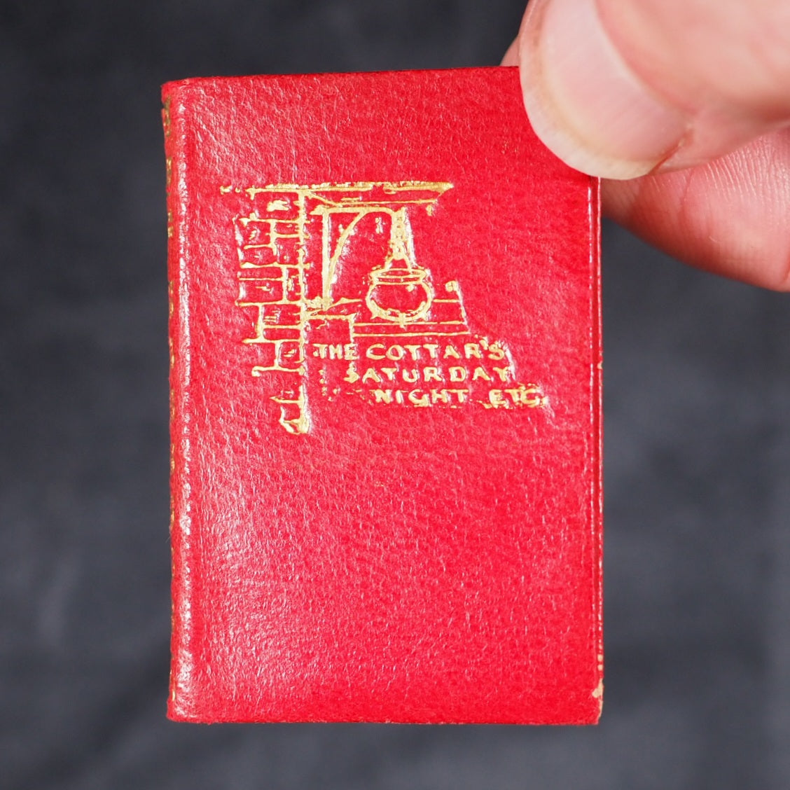 Burns, Robert. Cottar's Saturday Night and other poems. Bryce, David & Son. Glasgow. 1907. x, 372 printed pages. Line illustrations. More frequently found with Andersons imprint. With original brass book holder bust of Burns in very good condition. 1.75 x 2" Original full red calf; spine with gilt titling and repeated pattern of thistles in gilt; front cover has gilt titling below a stylised hearth and cooking pot in gilt (minuscule rubbing to head of spine and corners). Unusual original leather binding (similar to the Bryce edition of 'Napoleon's Book of Fate'). One of the titles in Queen Mary's Doll's House. This book and holder are rare survivors in this very good original state. Bondy, 116. Garbett, 39. Welsh, 1533. OCLC, 20137731. WorldCat locates 6 copies worldwide.