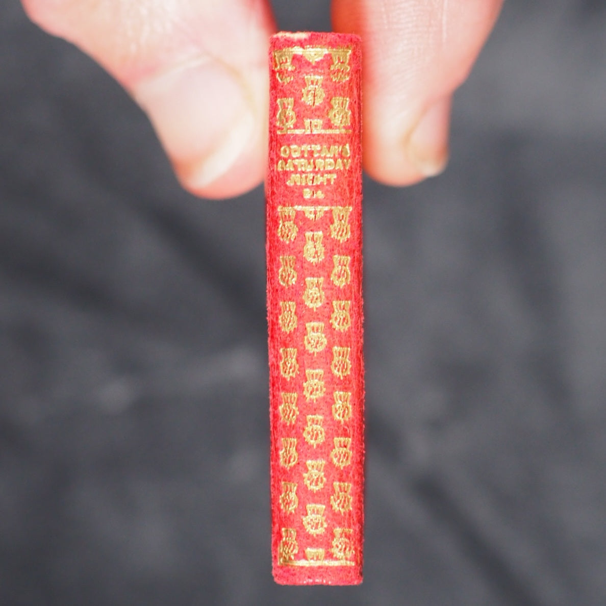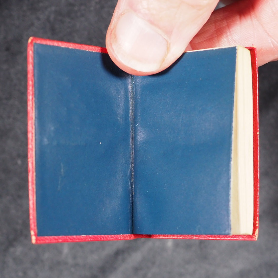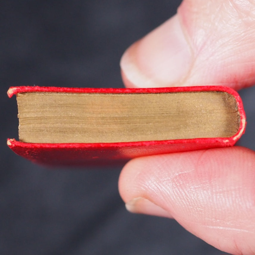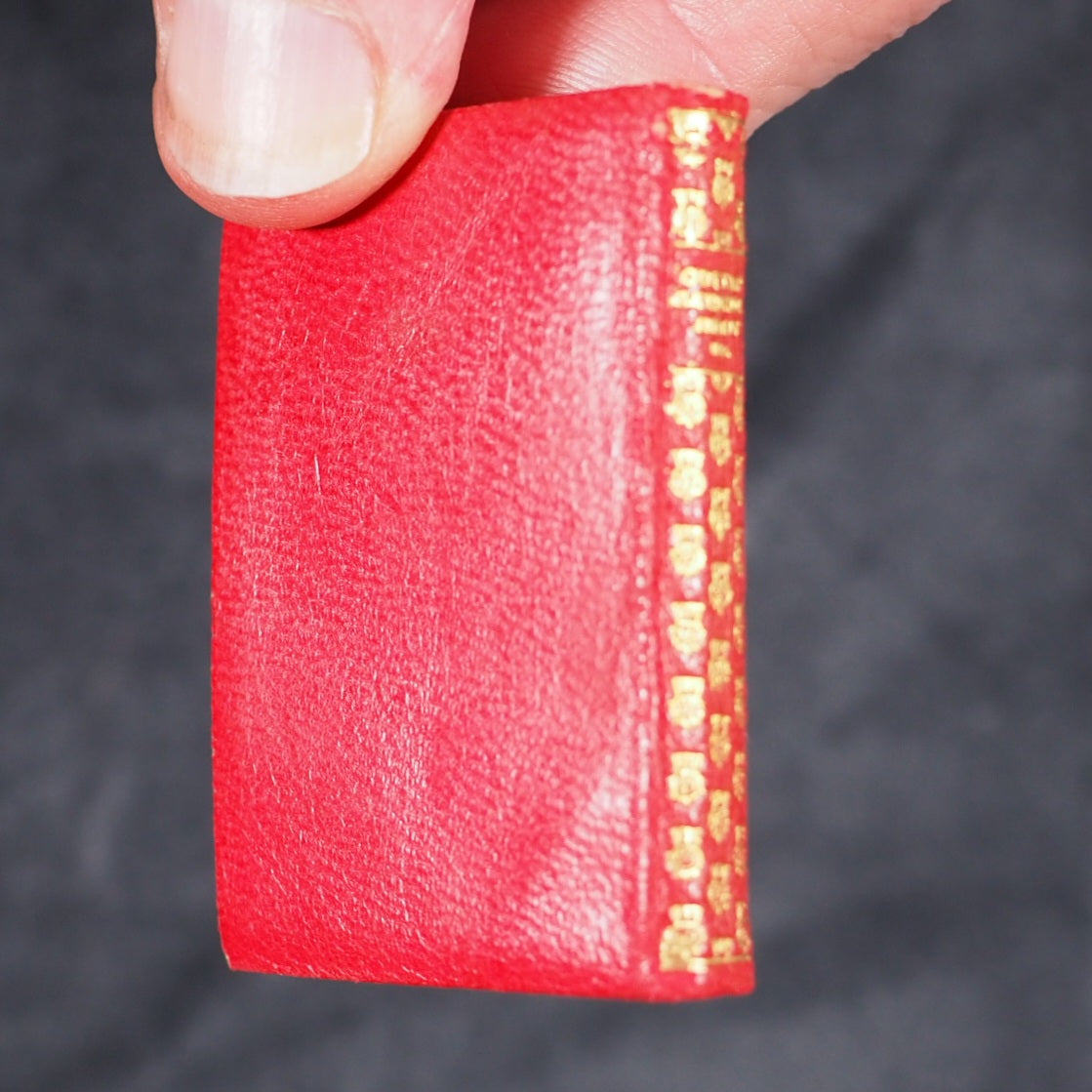 Burns, Robert. Cottar's Saturday Night and other poems. Bryce, David & Son. Glasgow. 1907. x, 372 printed pages. Line illustrations. More frequently found with Andersons imprint. With original brass book holder bust of Burns in very good condition. 1.75 x 2" Original full red calf; spine with gilt titling and repeated pattern of thistles in gilt; front cover has gilt titling below a stylised hearth and cooking pot in gilt (minuscule rubbing to head of spine and corners). Unusual original leather binding (similar to the Bryce edition of 'Napoleon's Book of Fate'). One of the titles in Queen Mary's Doll's House. This book and holder are rare survivors in this very good original state. Bondy, 116. Garbett, 39. Welsh, 1533. OCLC, 20137731. WorldCat locates 6 copies worldwide.