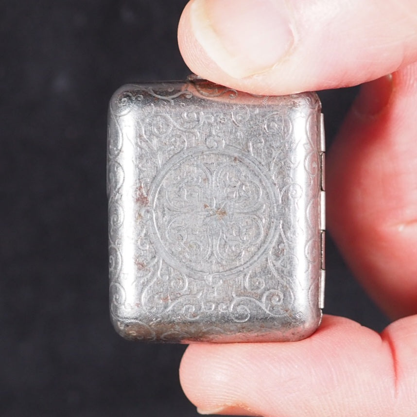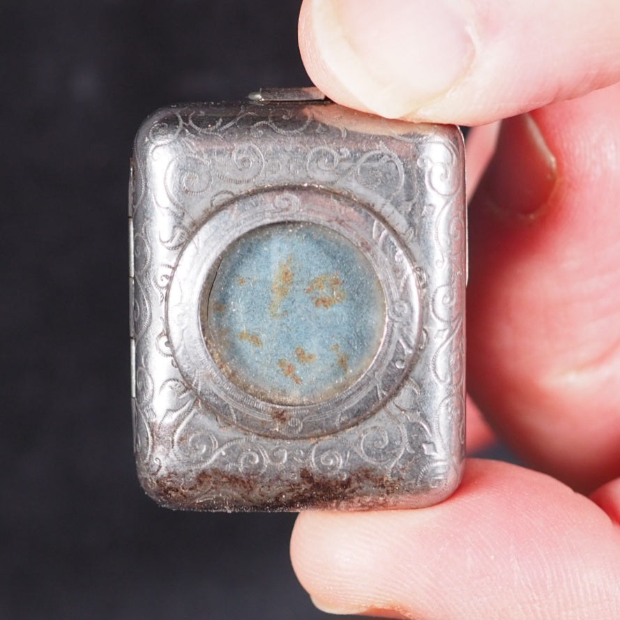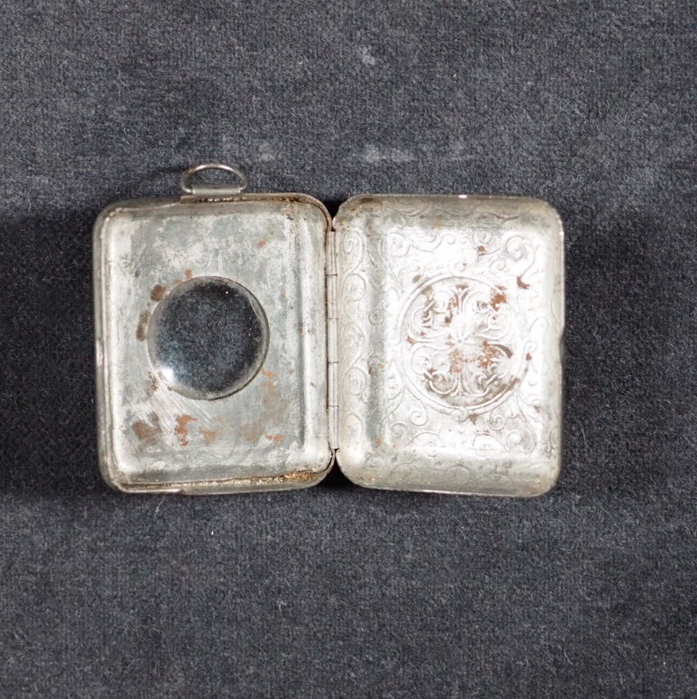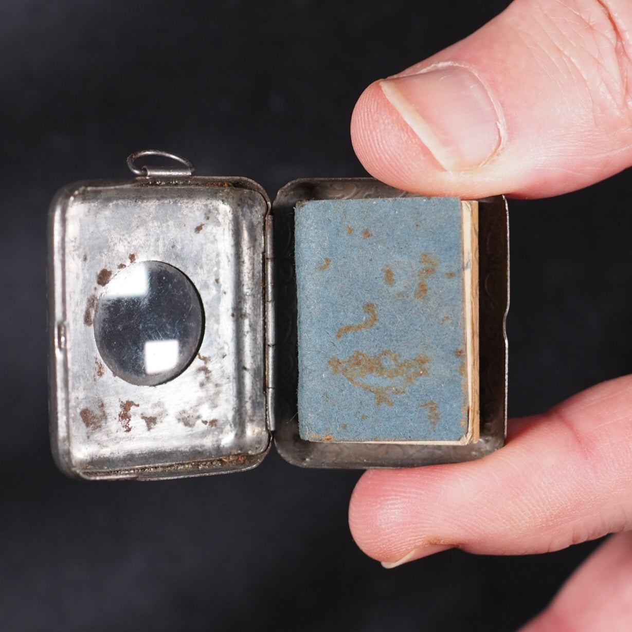 Usually offered by the publisher in oblong tin, brass or silver lockets with hinged door and inset magnifier. Occasionally issued as one of a twelve-volume set in a metal shelved glass case with the heading "Midget Library," accompanied by separate miniature magnifying glass; case then fits into an angled wooden stand. Many copies with lockets were supplied to Indian and other Muslim soldiers fighting for the British in the Second Boer War and later World War I, where they were worn as pendants and objects of fascination that carried talismanic properties, as well as serving as functional Qur'ans for reading with the help of the magnifying glass .