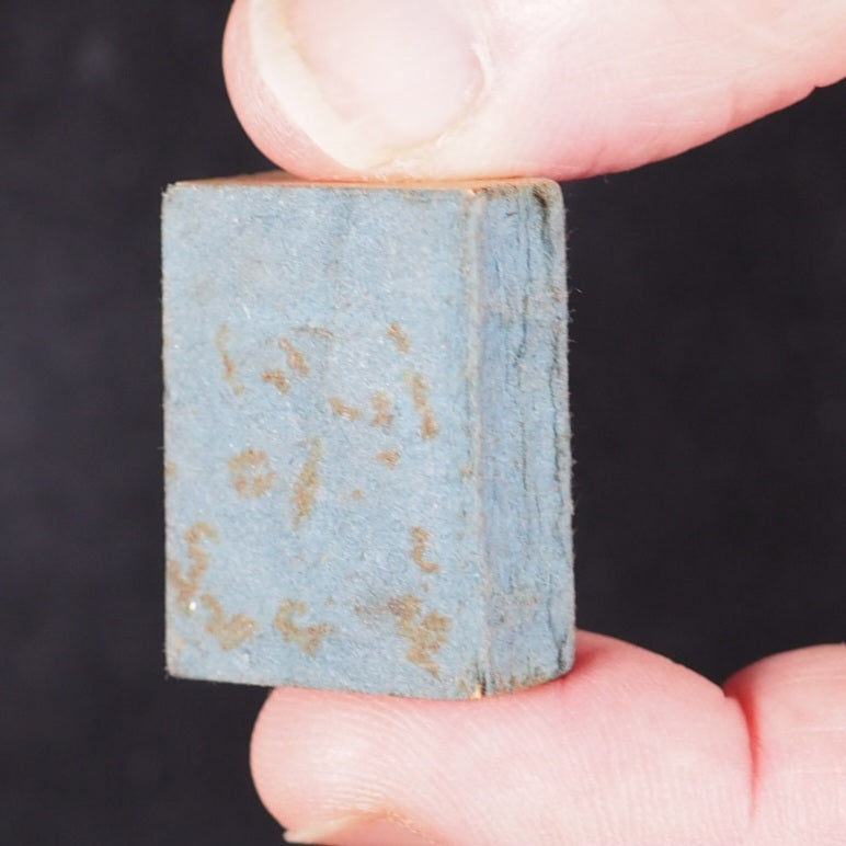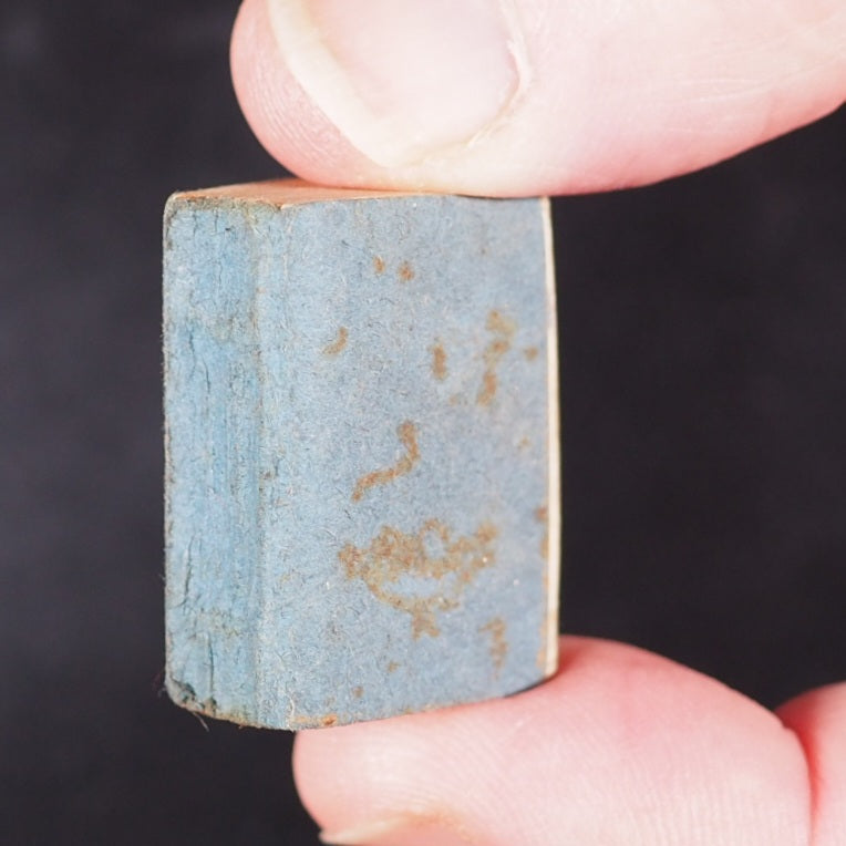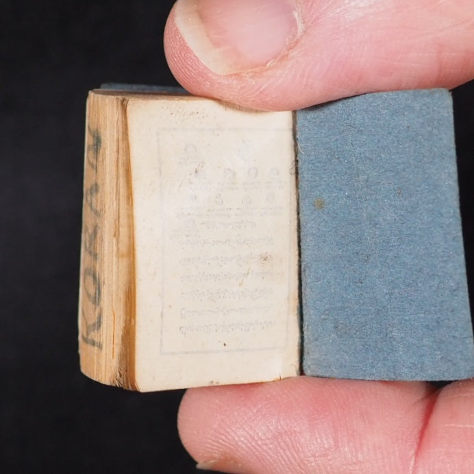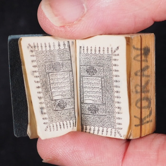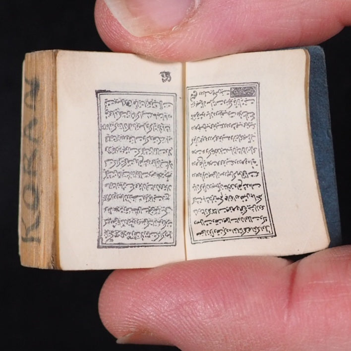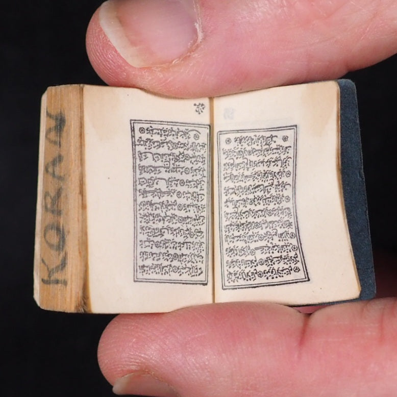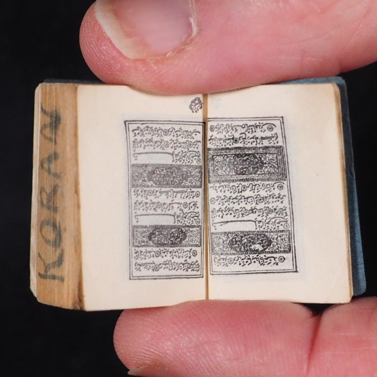 Koran, Qur'an. Bryce, David & Son. Glasgow. Circa 1907. Circa 800 printed pages in Arabic (a couple of leaves minutely frayed at the edges). Fine India paper, supplied by Henry Frowde. Lithographed text and marginal decoration, printed in Arabic within ruled borders (minuscule marginal tear in gutter of title page) . Lacks endpapers. Marked 'Koran' in ink on text block. Near contemporary ink inscription on final blank page "Koran in Arabic, E.L.A.R. 1920".1906 date suggested by D.V. Welsh. But Myrvold and Parmenter state that the Korans were first published in 1896, with reprints in 1899 and 1907. 19 x 26 mm.  Original plain blue stiff wrappers (the outer wrappers have some historic small marks from the tarnishing of the inside of the locket). Original pressed silvered metal locket with a loop at the top, and a magnifier on the front. The plain stiff wrappers are less commonly found binding than the red leather examples -they were deemed more disposable and less of a treasured item over the last hundred years.