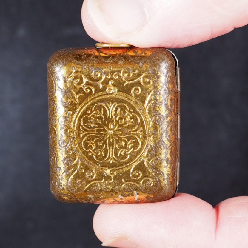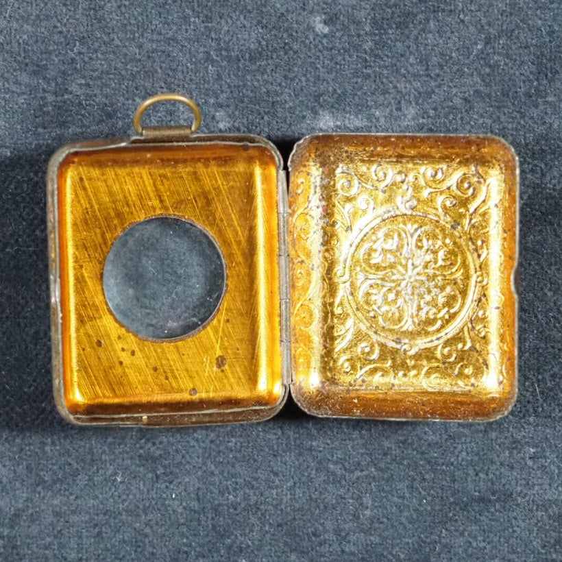 Usually offered by the publisher in oblong tin, brass or silver lockets with hinged door and inset magnifier. Occasionally issued as one of a twelve-volume set in a metal shelved glass case with the heading "Midget Library," accompanied by separate miniature magnifying glass; case then fits into an angled wooden stand. Many copies with lockets were supplied to Indian and other Muslim soldiers fighting for the British in the Second Boer War and later World War I, where they were worn as pendants and objects of fascination that carried talismanic properties, as well as serving as functional Qur'ans for reading with the help of the magnifying glass .