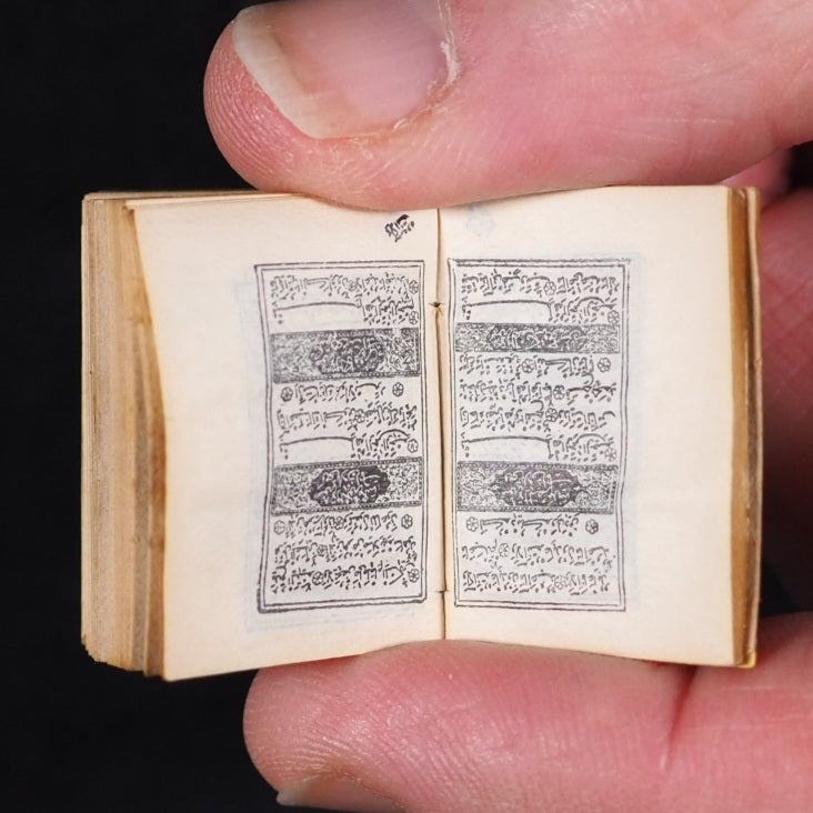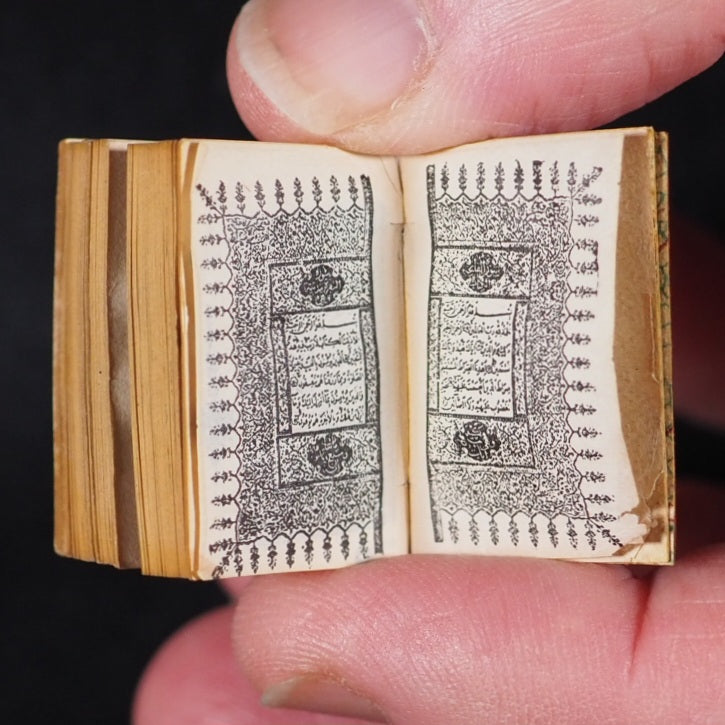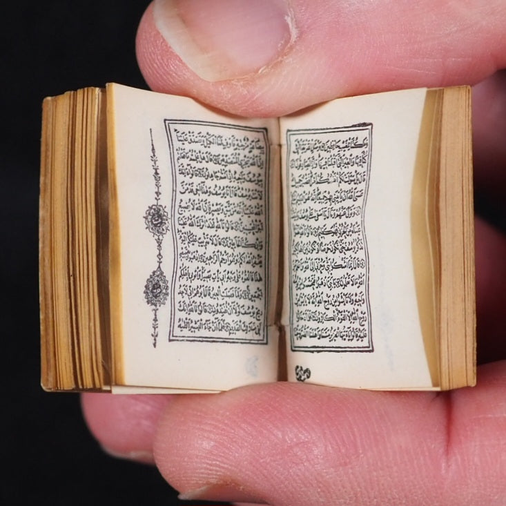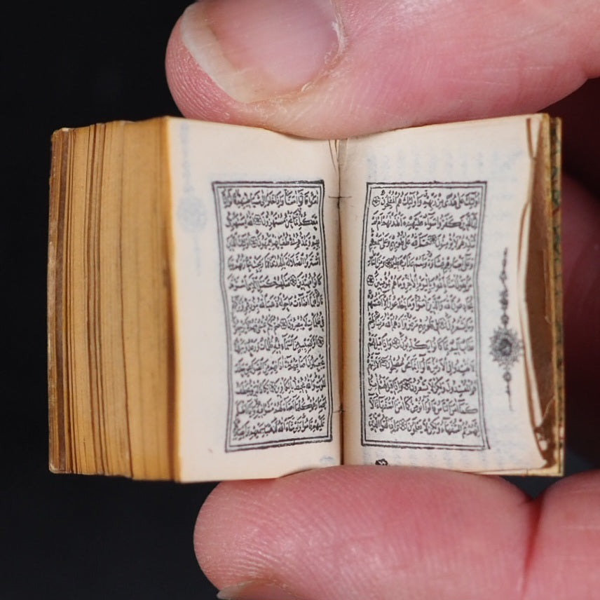 Koran or Qu'ran. David Bryce & Son. Glasgow. 1896. Circa 800 printed pages. Fine India paper, supplied by Henry Frowde. Lithographed text and marginal decoration, printed in Arabic within ruled borders (minuscule marginal closed tear to one corner of title page) . Original marbled endpapers.1906 date suggested by D.V. Welsh. But Myrvold and Parmenter state that the Korans were first published in 1896, with reprints in 1899 and 1907.19 x 26 mm. Original red and elaborately stamped gilt morocco with lotus motifs, and scrolling curlicue decoration. Original pressed gilded metal locket with a loop at the top, and a magnifier on the front (tin very slightly rubbed and tarnished).