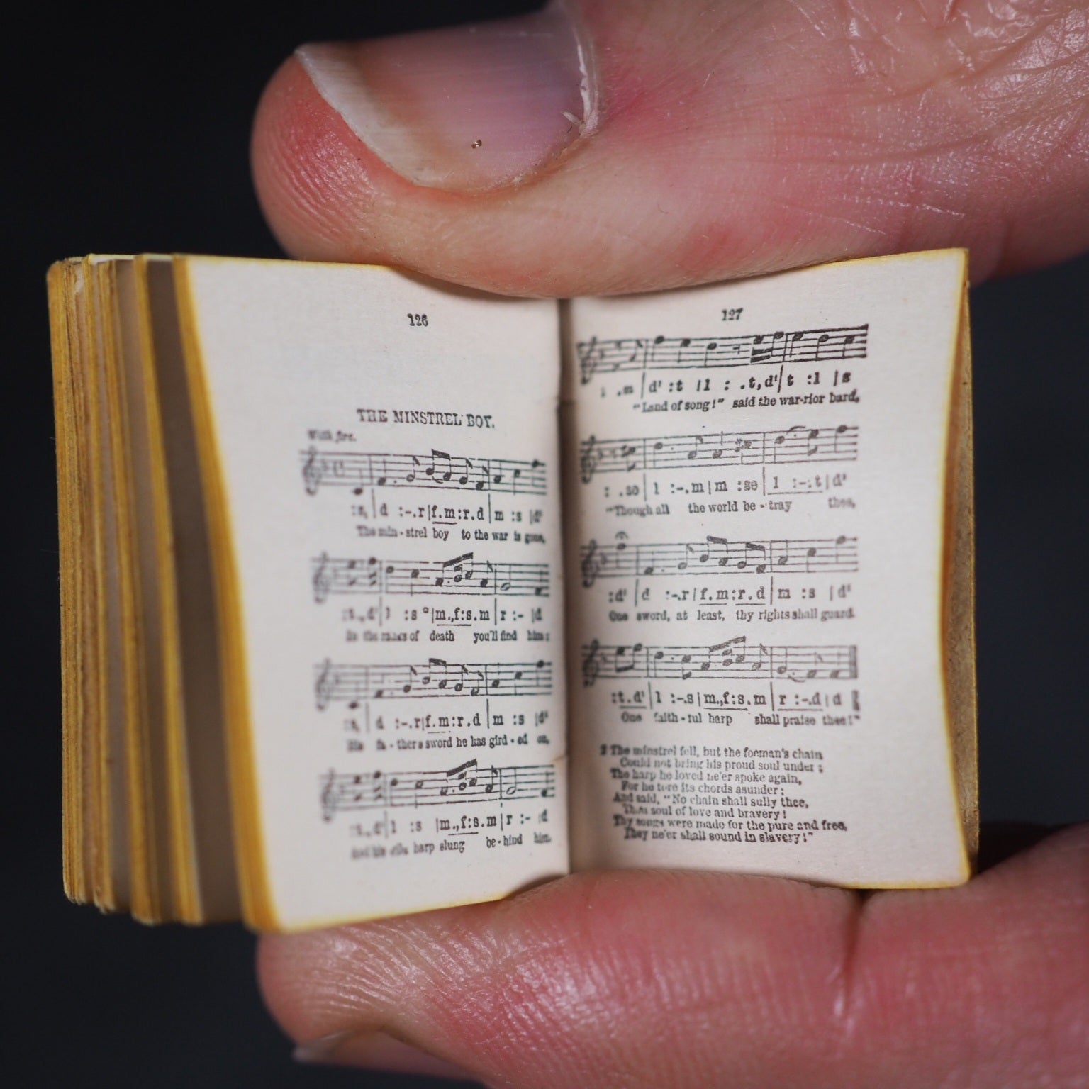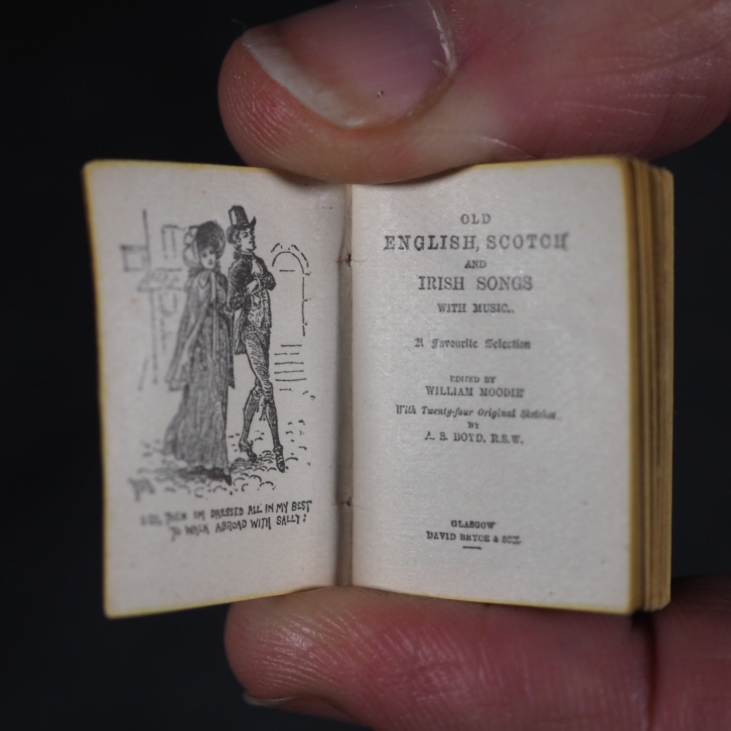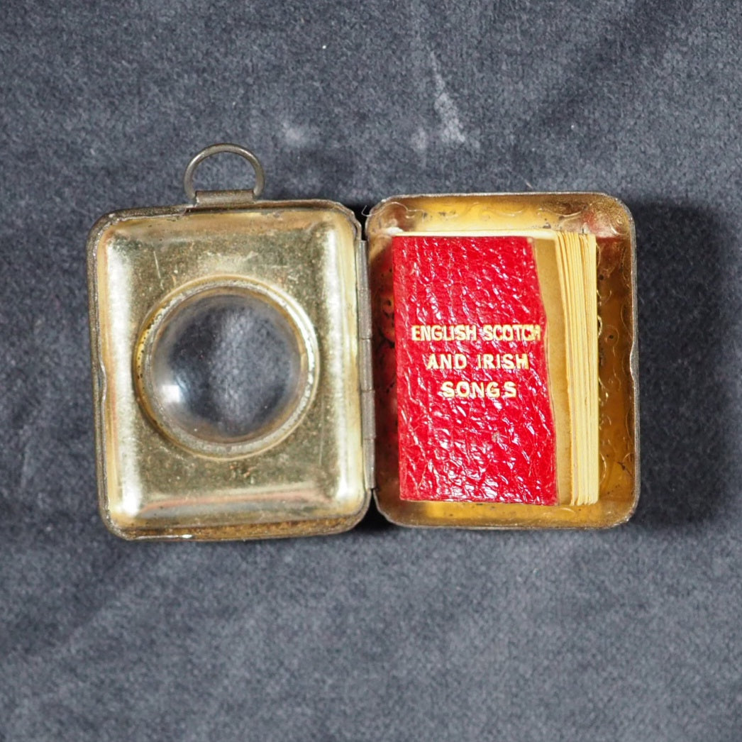 Moodie, William, editor. Old English, Scotch and Irish songs with music : a favourite selection with 24 sketches by A.S.Boyd. Bryce, David & Son. Glasgow. 1895. Complete with original locket with loop on top and magnifier in front (slightly tarnished on the outside). Original cream endpapers. All edges yellow. 16 x 28mm. Original red morocco binding; 'Songs' in gilt on spine; 'English, Scotch and Irish Songs' in gilt on front cover. Bondy, 113. Garbett, 27. Pistner, B233:3. Spielmann, 377. Welsh, 5113. OCLC, 270900229. WorldCat locates 5 copies worldwide. 150 firsts2024