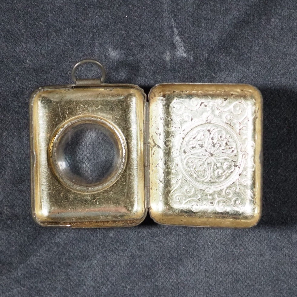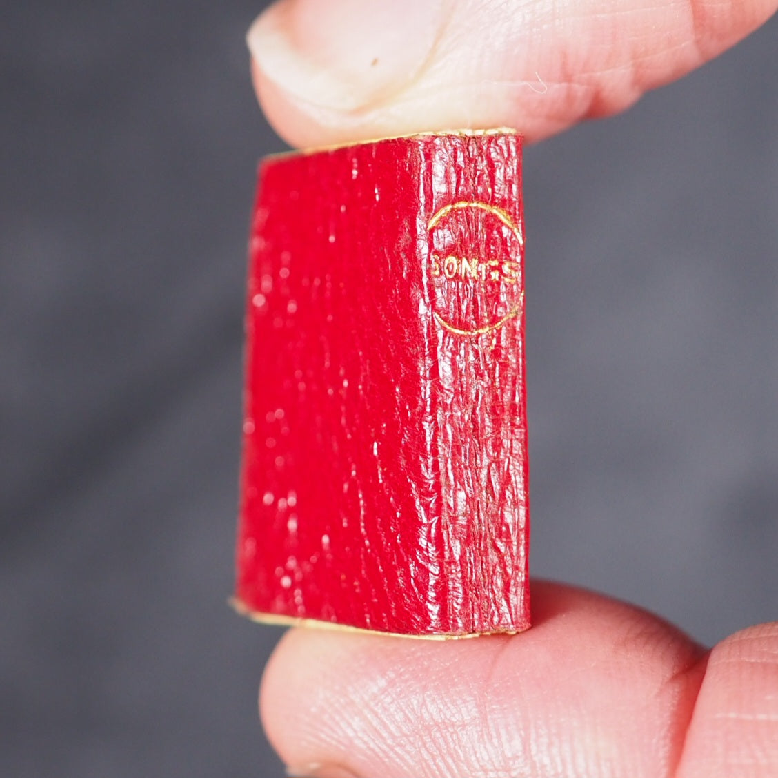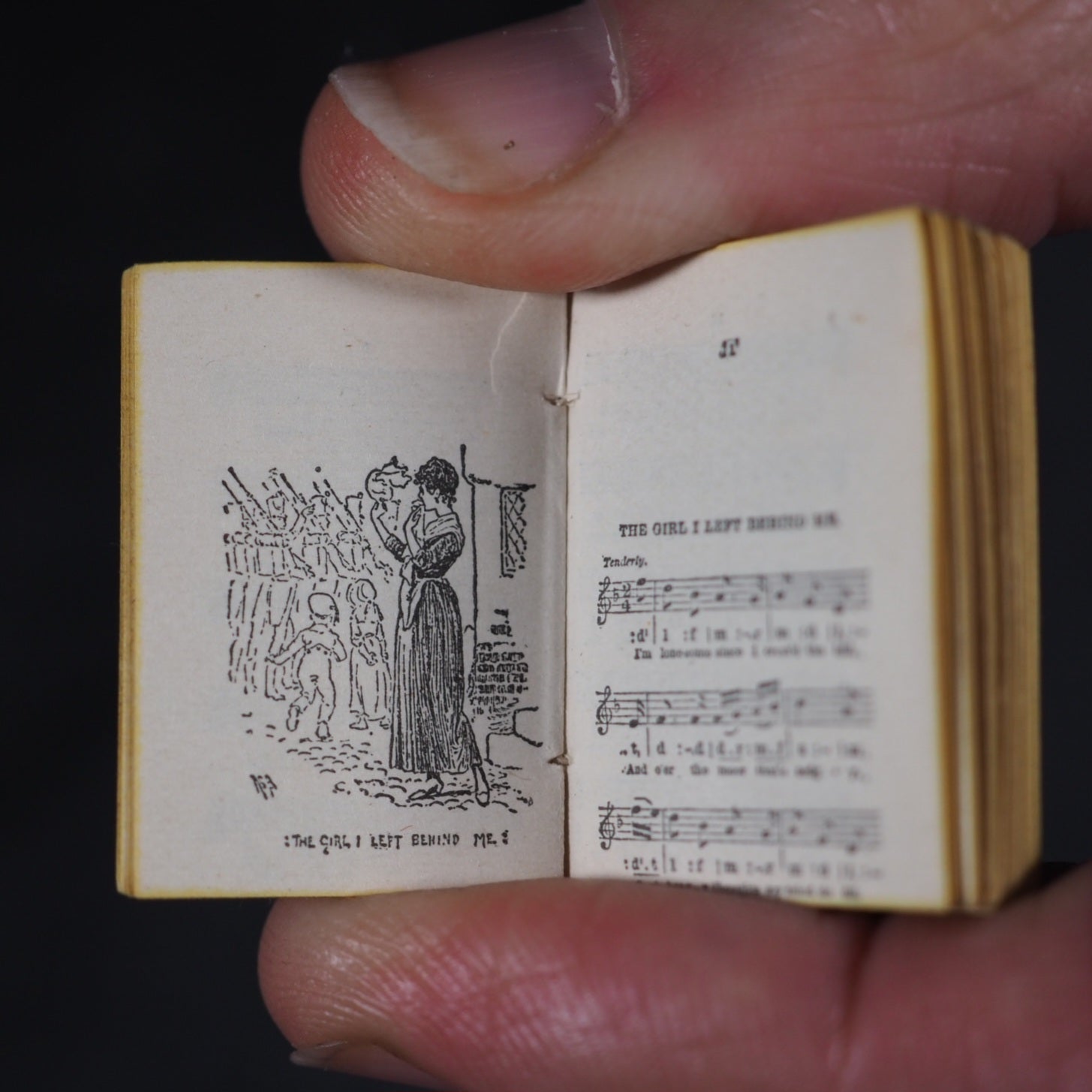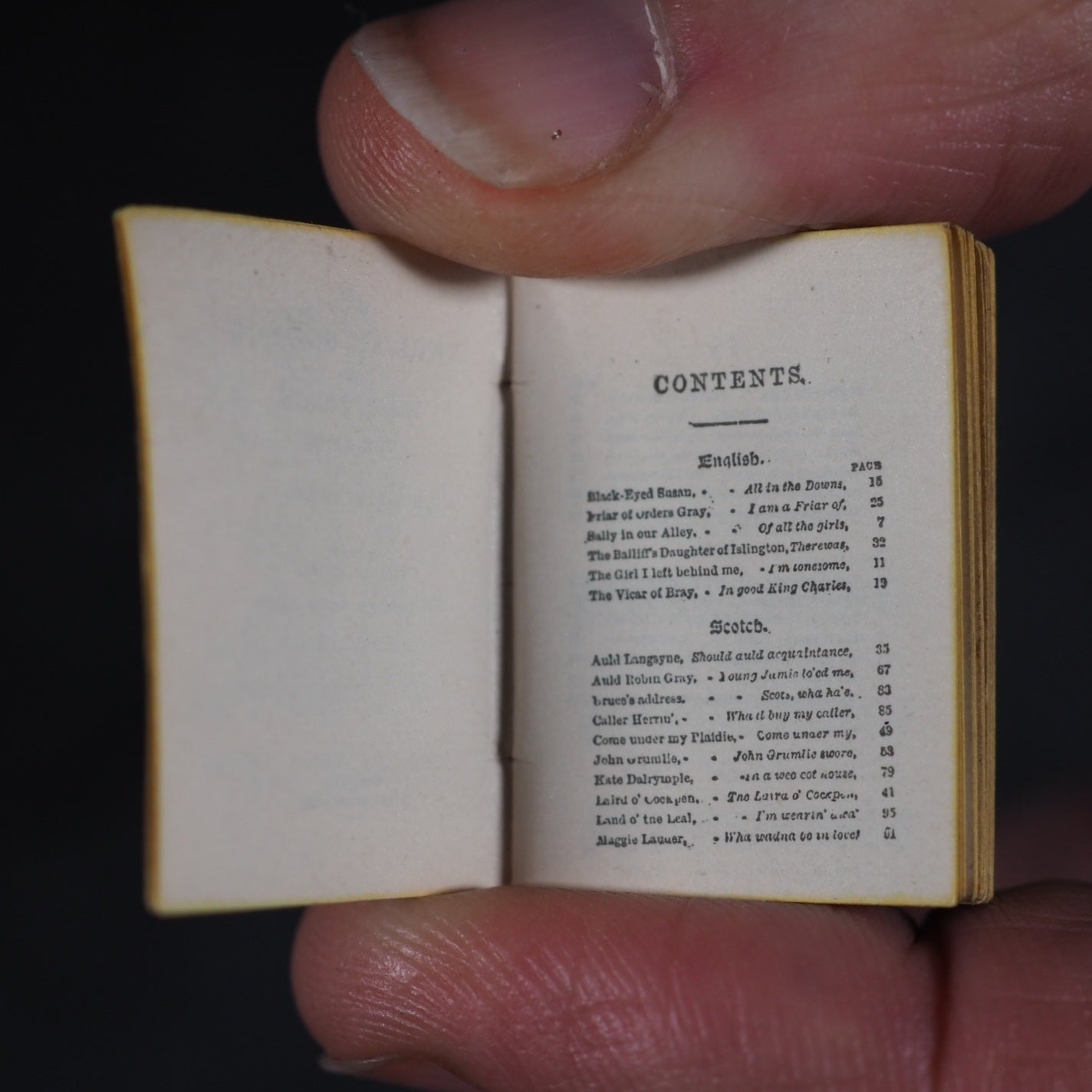 Moodie, William, editor. Old English, Scotch and Irish songs with music : a favourite selection with 24 sketches by A.S.Boyd. Bryce, David & Son. Glasgow. 1895. Complete with original locket with loop on top and magnifier in front (slightly tarnished on the outside). Original cream endpapers. All edges yellow. 16 x 28mm. Original red morocco binding; 'Songs' in gilt on spine; 'English, Scotch and Irish Songs' in gilt on front cover. Bondy, 113. Garbett, 27. Pistner, B233:3. Spielmann, 377. Welsh, 5113. OCLC, 270900229. WorldCat locates 5 copies worldwide. 150 firsts2024