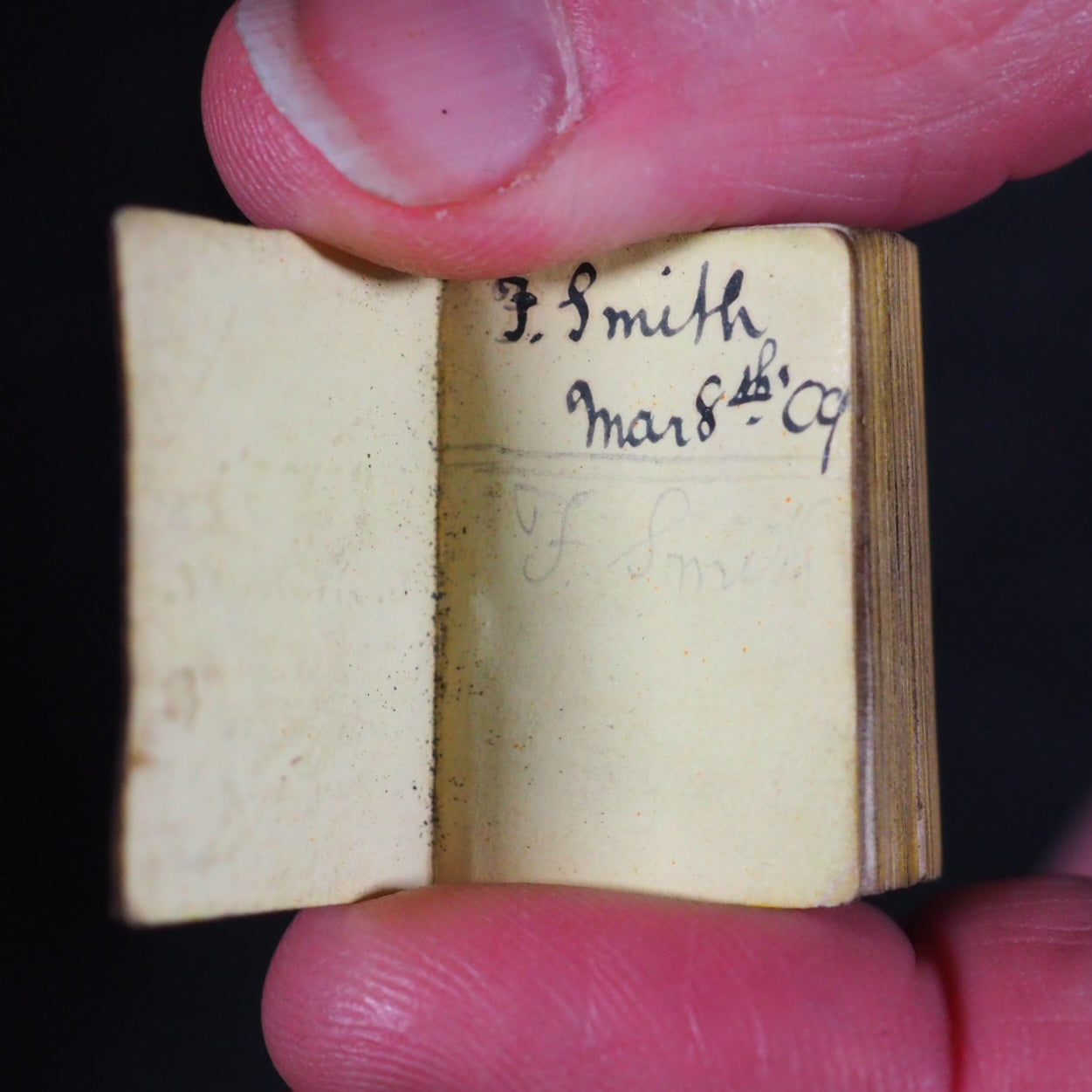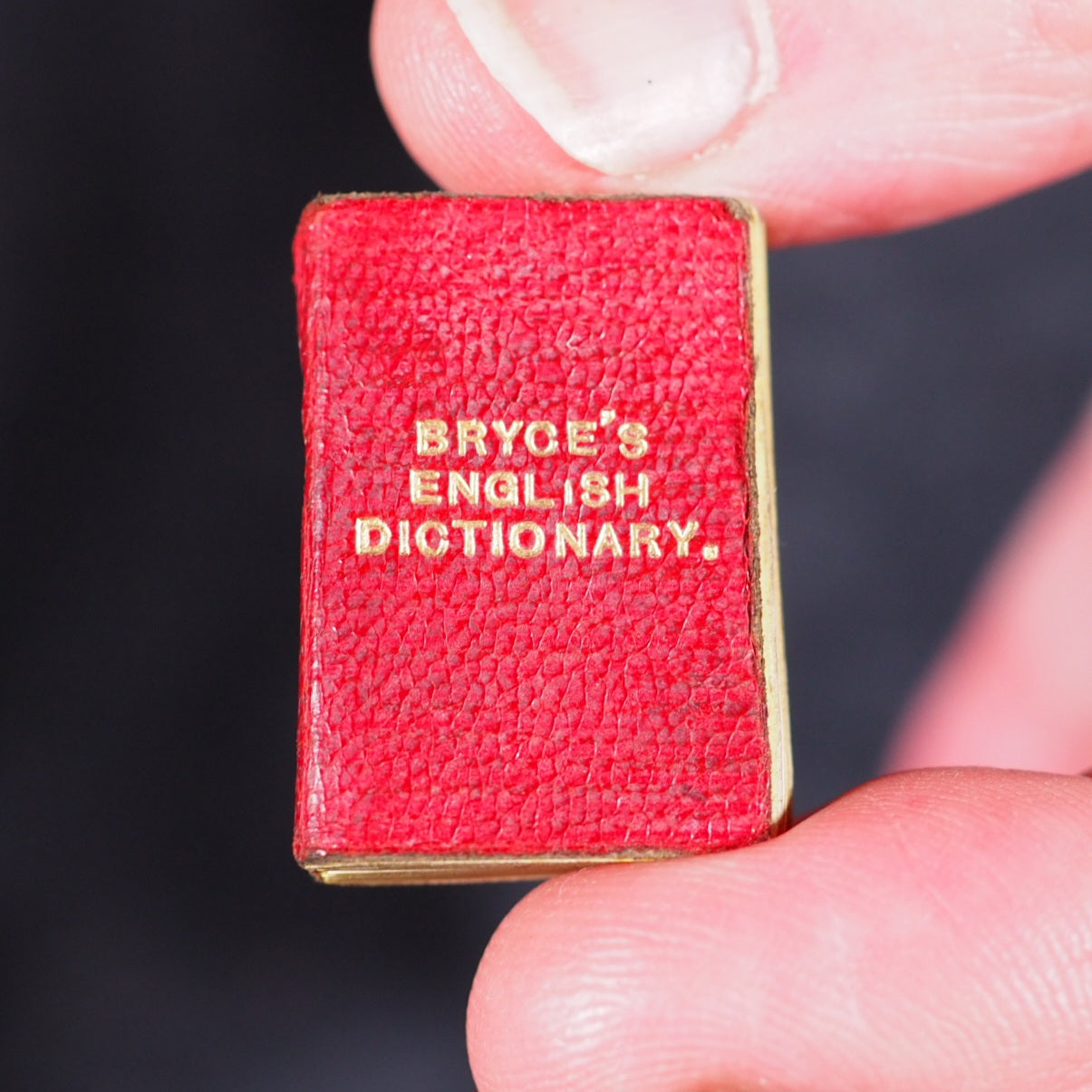 Smallest English Dictionary in the World. Comprising: besides the ordinary and newest words in the language, short explanations of a large number of scientific, philosophical, literary and technical terms. Bryce, David & Son. Glasgow. 1893. 384 pages.Printed on finest India paper. Portrait frontispiece of Dr. Johnson. Mite series. Set in 1-1/2 point type. Printed by Robert Maclehose, Glasgow. ""Dedicated by the publishers to Mrs Kendal in appreciation of kindly encouragement given to the production of tiny articles, of which she, has a unique- collection."All edges yellow. Contemporary in ownership singature on front free endpaper, dated 1909. 19 x 28 mm. Original red morocco."English Dictionary" front cover and 'Pears' on back cover. Fully hallmarked silver locket, hallmarks in 2 places Sampson Mordan & Co,1894 . Magnifying Glass and original silver loop (some mild scratches and a little tarnished). 19 x 28 mm. Original red morocco (slightly thumbed). Bryce offered their dictionaries in a choice of Metal cases (1s.3d.), Tartan (1s.6d.), Yapped leather (2s.0d.), Silver gilt (2s.6d.), Gilt or engraved (3s.6d.) & Silver hallmarked locket (7s.6d.) -this example was the most costly and by far the hardest to find. This is one of a number of minuscule books published by Bryce by the process of photographic reduction. They are all legible with a magnifying glass and the equivalent of 1 1/2-point. This is number 18 in Ruth Adomeit's List of 32 Basic Books for the Serious Collector. Although "thousands of these dictionaries were published, they are now becoming distinctly scarce and command steadily rising prices" [Bondy]. Bondy, 106. Garbett, 25. Pistner, B233:7. Spielmann, 464. Welsh, 2406. 63 firsts2024