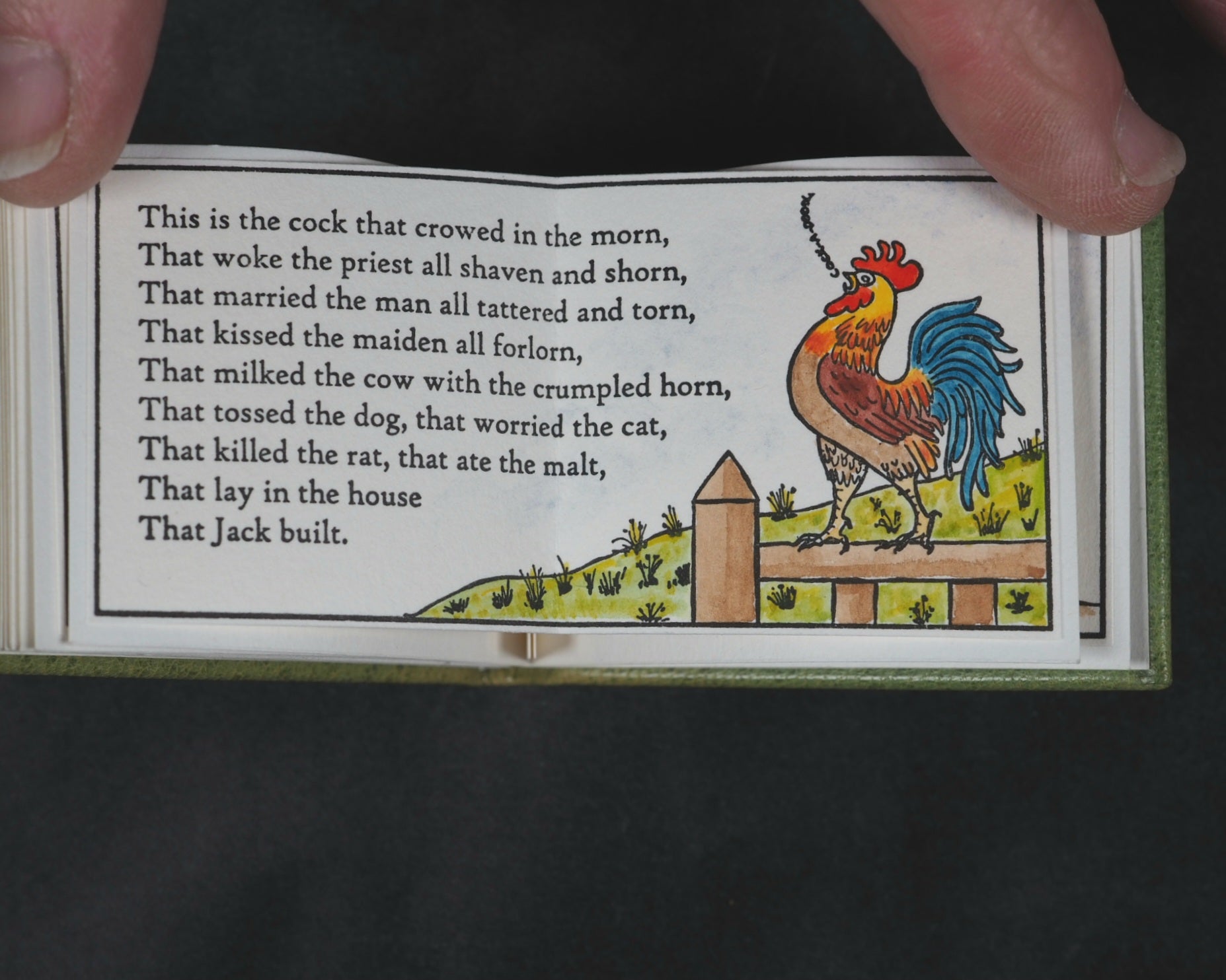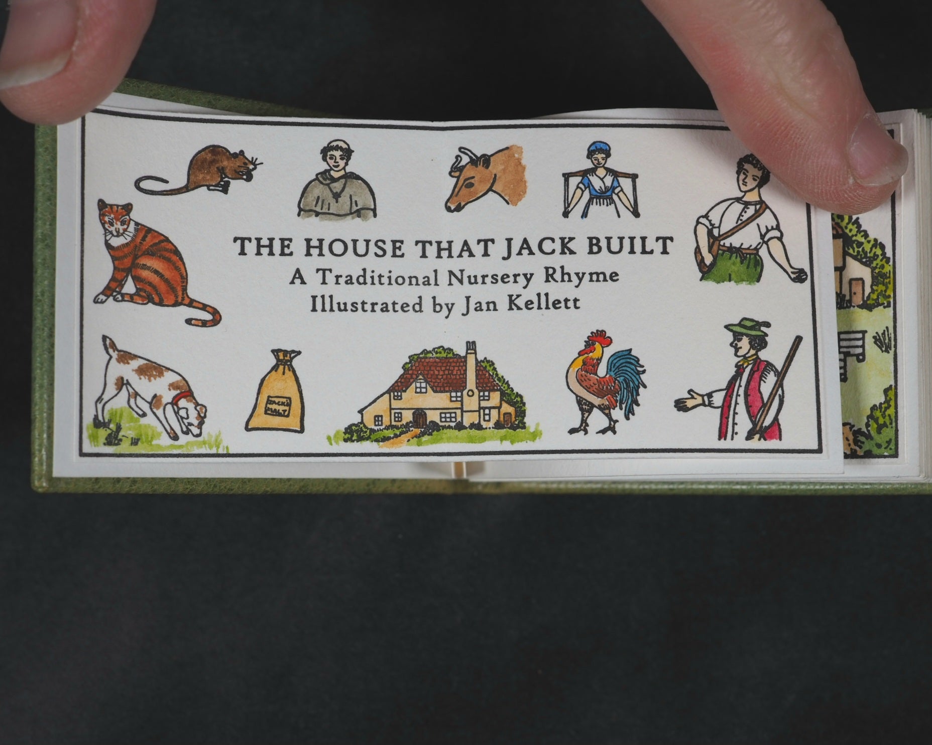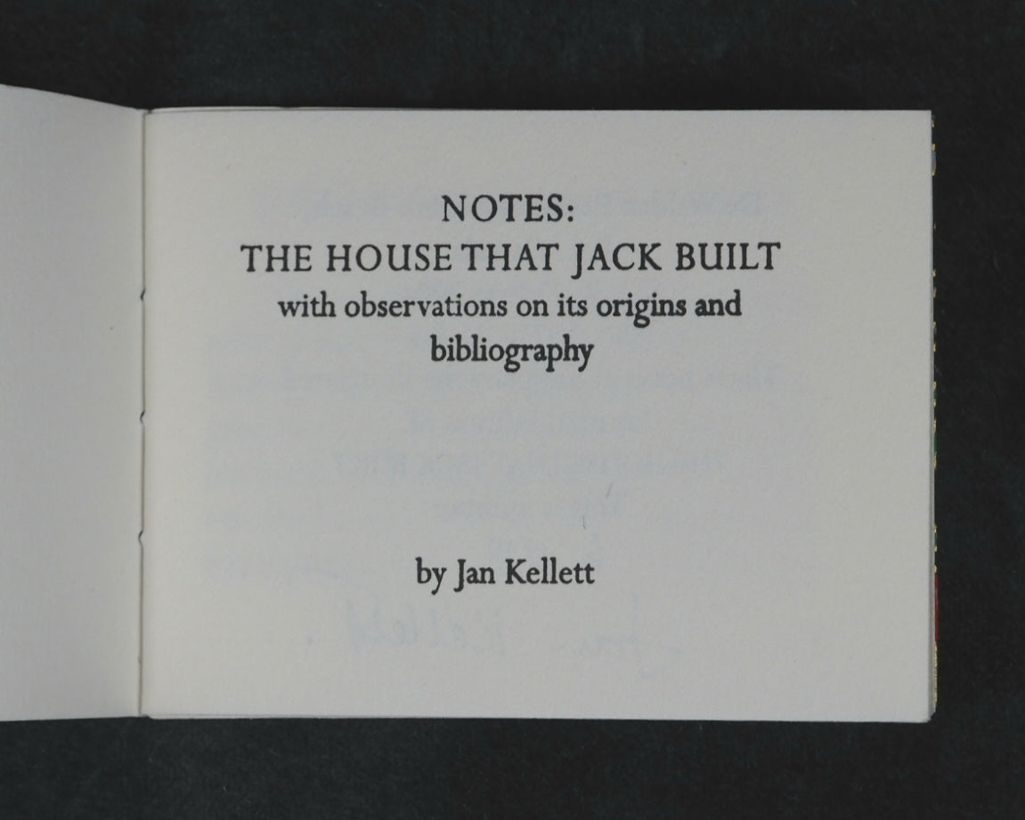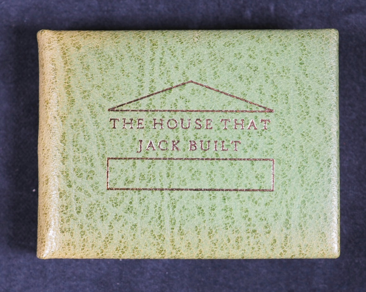 24 pages, printed in High Tower text on Magnani hand mould Book Wove, from Polymer plates on a platen press in a limited edition of 40 copies. The illustrations, which span twelve double pages, were hand-coloured, meaning each copy has a slightly unique finish. This manual process underscores the limited, handcrafted nature of the edition. Complete with Jan Kellet's 'Notes; the House that Jack Built with observations on its origins and bibliography. 18 pages. 70 x 54 mm. Hand bound in green goatskin with gilt blocked titling on upper cover. Spine very slightly faded. It is housed in a 'house-shaped' box covered in Japanese Chiyogami mulberry fiber paper and lined with green "silk" paper. Inspired by the dozens of “Jacks” in the Toronto Public Library, this version of The House that Jack Built is bound in carousel or star form, giving an extra dimension to the twelve double-page spreads of hand-colored scenes. Distinguished Book Award (Miniature Book Society 2005). Judge Magda Saina’s comment: “Great illustration appropriate to the subject and origin of story.” Original cost price CAD $475 in 2004. 58545564. Ten copies recorded, all in Canada and the USA.