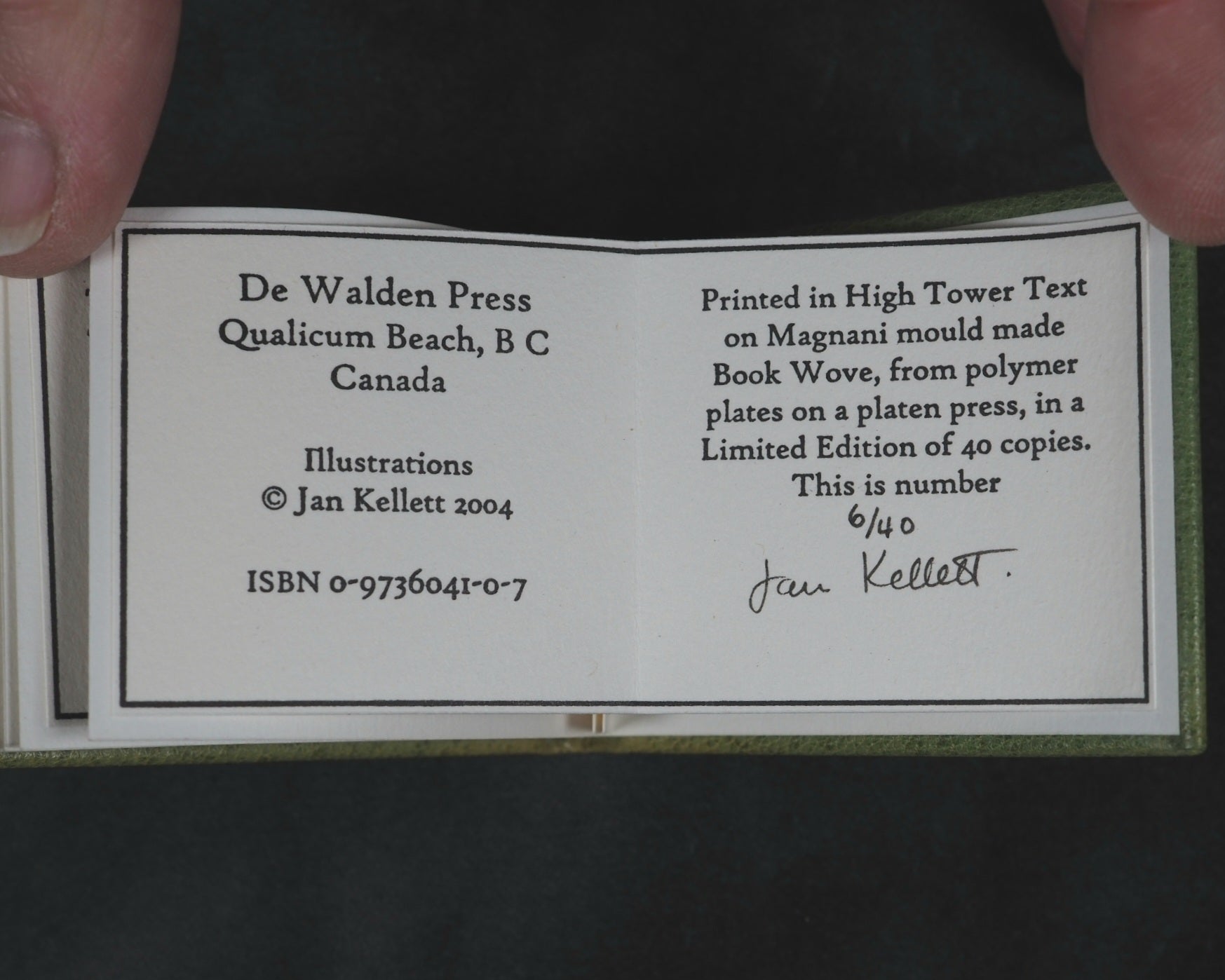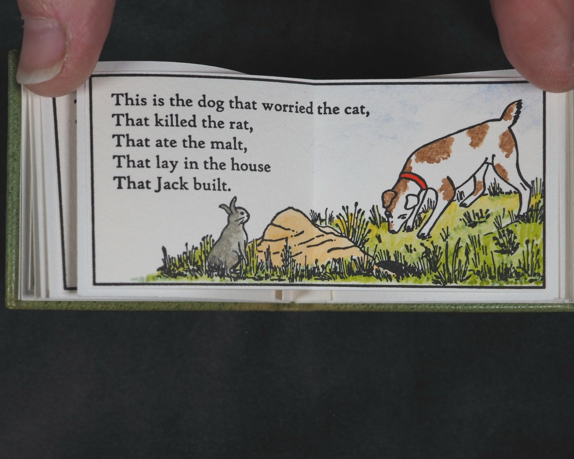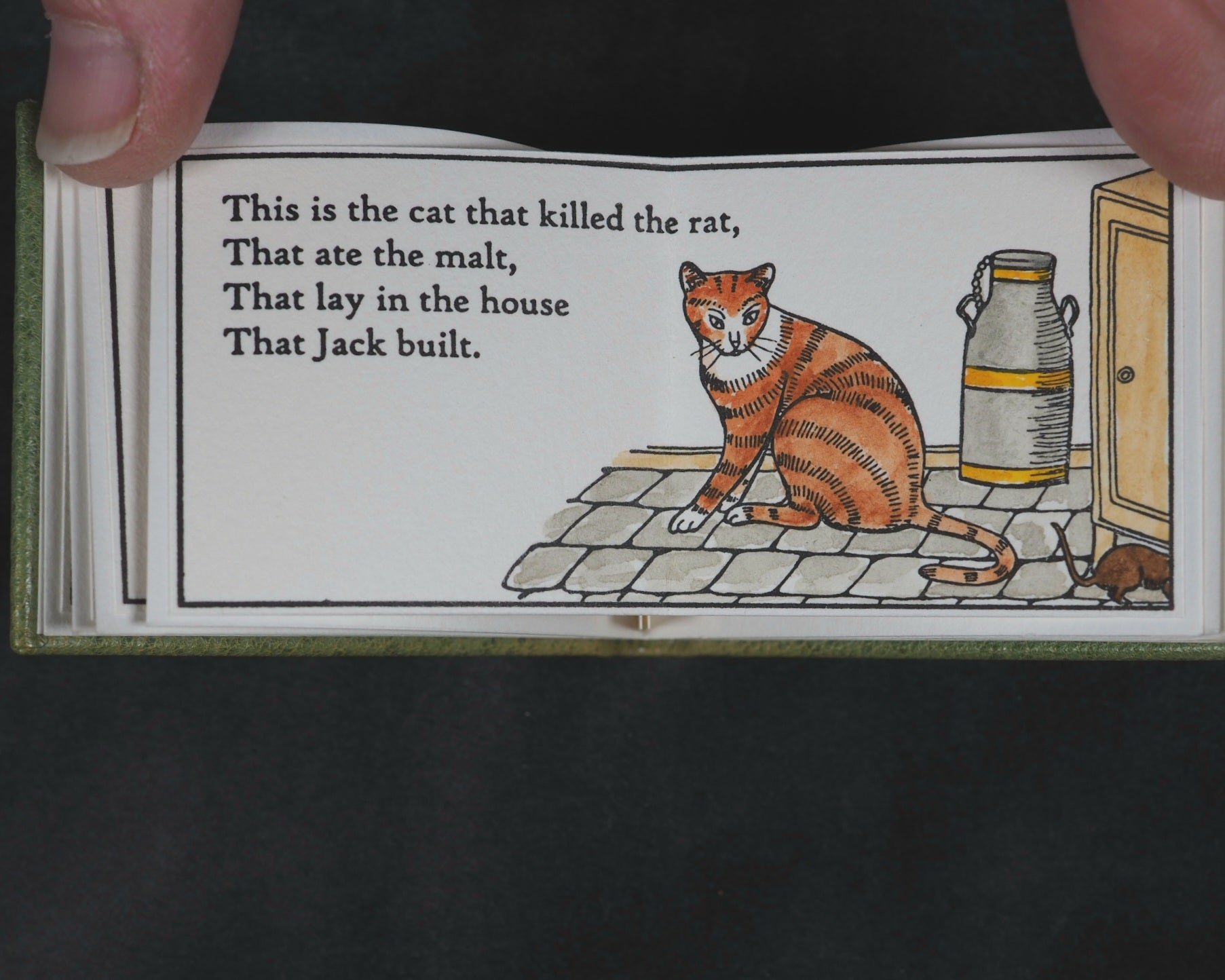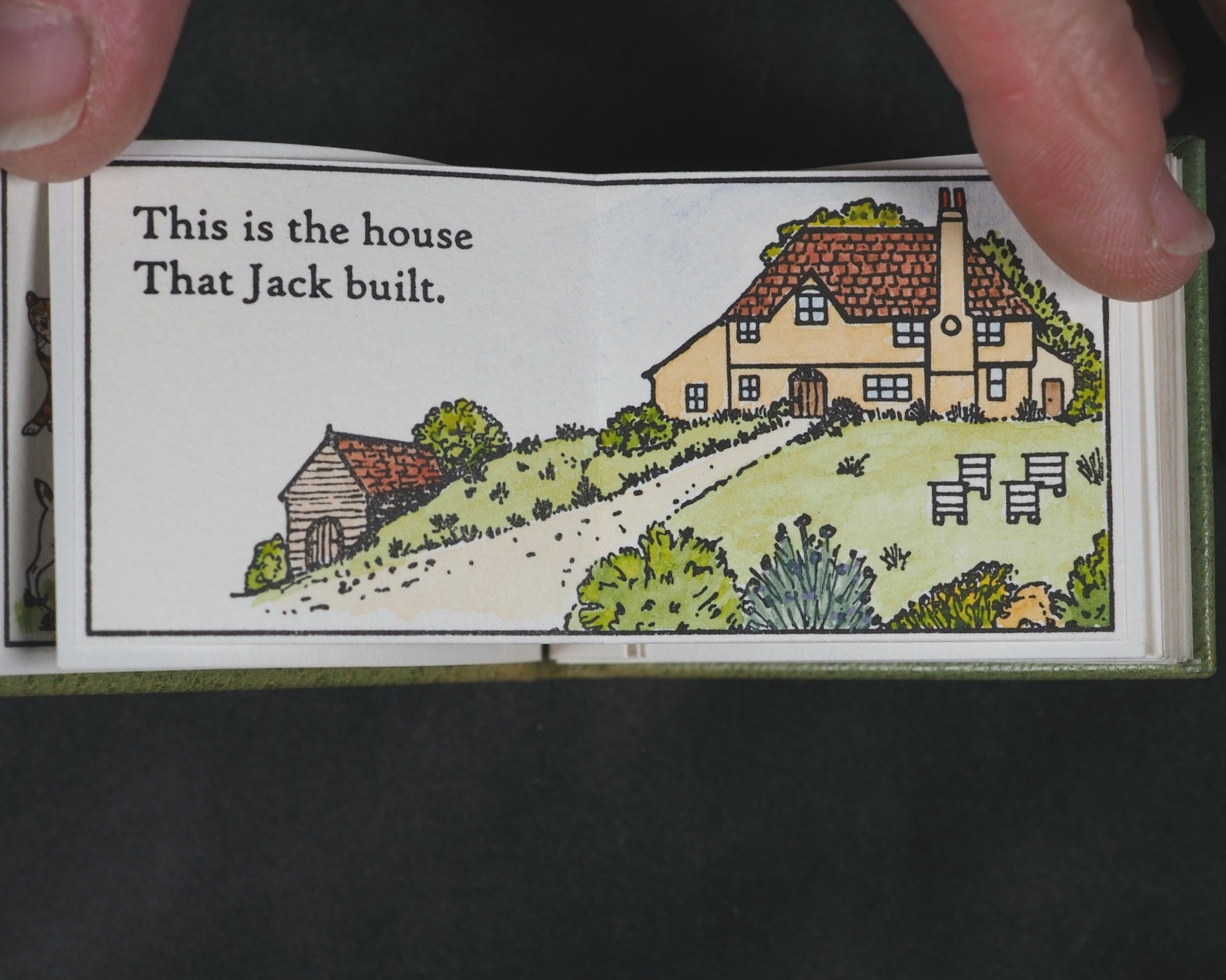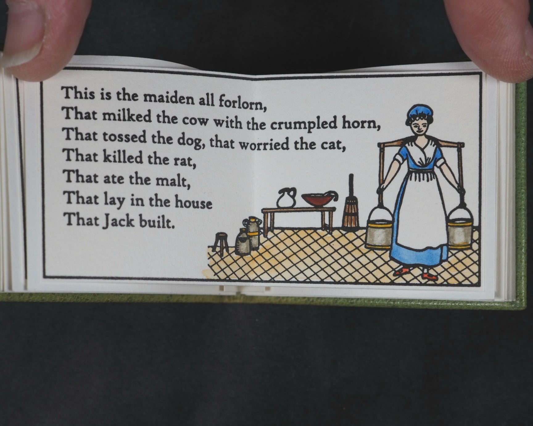 24 pages, printed in High Tower text on Magnani hand mould Book Wove, from Polymer plates on a platen press in a limited edition of 40 copies. The illustrations, which span twelve double pages, were hand-coloured, meaning each copy has a slightly unique finish. This manual process underscores the limited, handcrafted nature of the edition. Complete with Jan Kellet's 'Notes; the House that Jack Built with observations on its origins and bibliography. 18 pages. 70 x 54 mm. Hand bound in green goatskin with gilt blocked titling on upper cover. Spine very slightly faded. It is housed in a 'house-shaped' box covered in Japanese Chiyogami mulberry fiber paper and lined with green "silk" paper. Inspired by the dozens of “Jacks” in the Toronto Public Library, this version of The House that Jack Built is bound in carousel or star form, giving an extra dimension to the twelve double-page spreads of hand-colored scenes. Distinguished Book Award (Miniature Book Society 2005). Judge Magda Saina’s comment: “Great illustration appropriate to the subject and origin of story.” Original cost price CAD $475 in 2004. 58545564. Ten copies recorded, all in Canada and the USA.
