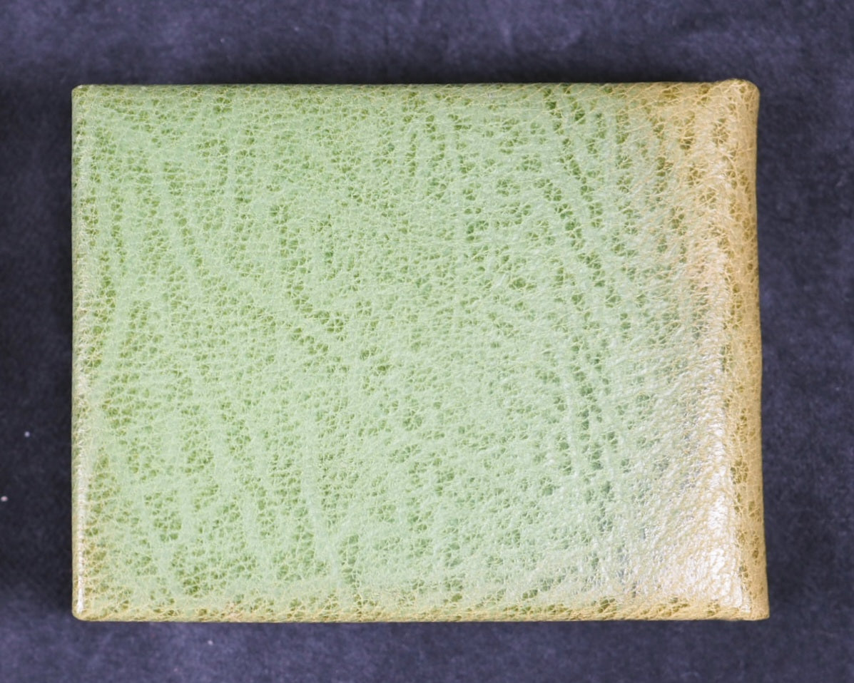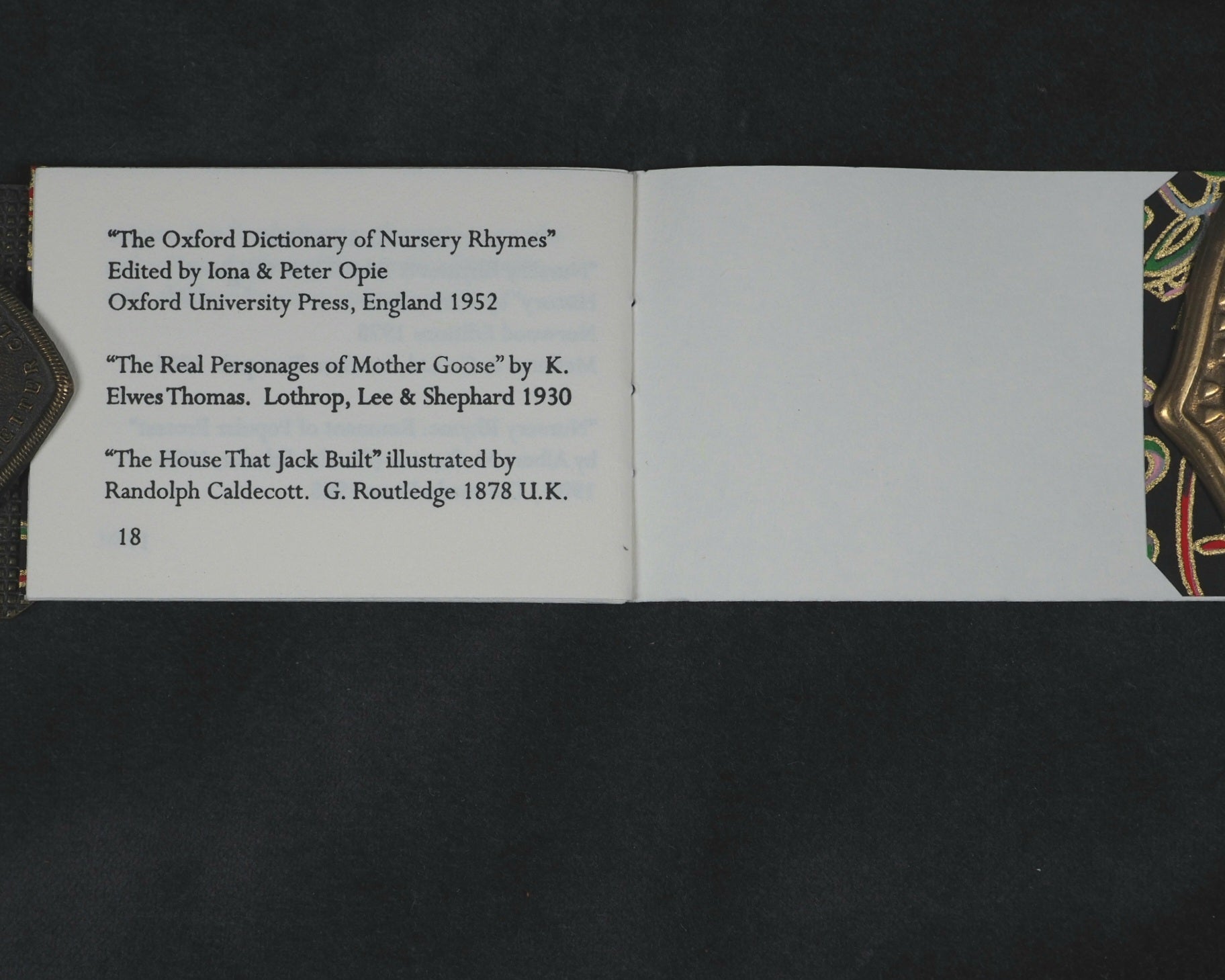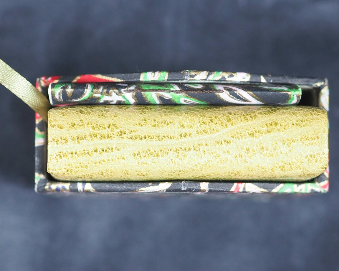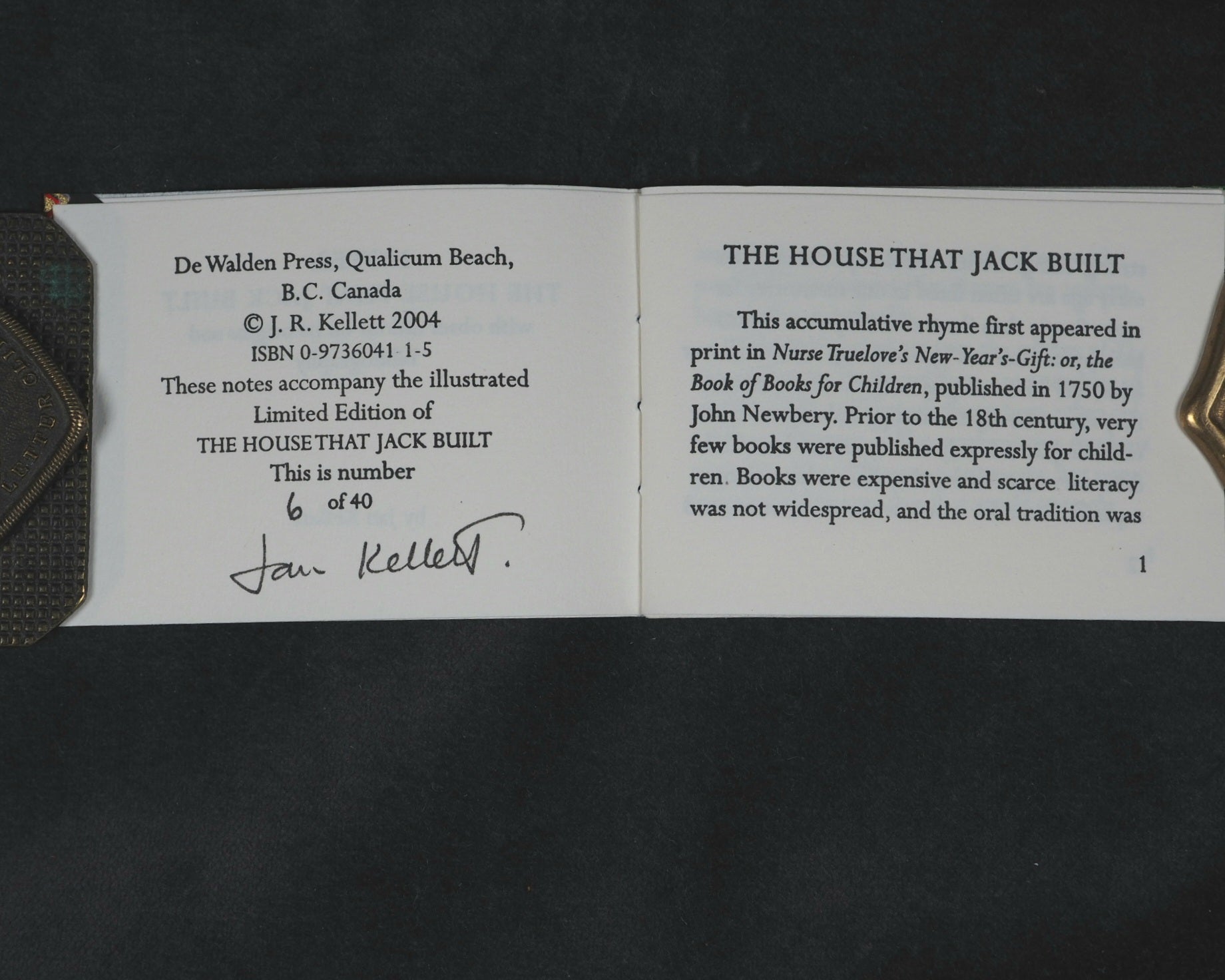 24 pages, printed in High Tower text on Magnani hand mould Book Wove, from Polymer plates on a platen press in a limited edition of 40 copies. The illustrations, which span twelve double pages, were hand-coloured, meaning each copy has a slightly unique finish. This manual process underscores the limited, handcrafted nature of the edition. Complete with Jan Kellet's 'Notes; the House that Jack Built with observations on its origins and bibliography. 18 pages. 70 x 54 mm. Hand bound in green goatskin with gilt blocked titling on upper cover. Spine very slightly faded. It is housed in a 'house-shaped' box covered in Japanese Chiyogami mulberry fiber paper and lined with green "silk" paper. Inspired by the dozens of “Jacks” in the Toronto Public Library, this version of The House that Jack Built is bound in carousel or star form, giving an extra dimension to the twelve double-page spreads of hand-colored scenes. Distinguished Book Award (Miniature Book Society 2005). Judge Magda Saina’s comment: “Great illustration appropriate to the subject and origin of story.” Original cost price CAD $475 in 2004. 58545564. Ten copies recorded, all in Canada and the USA.