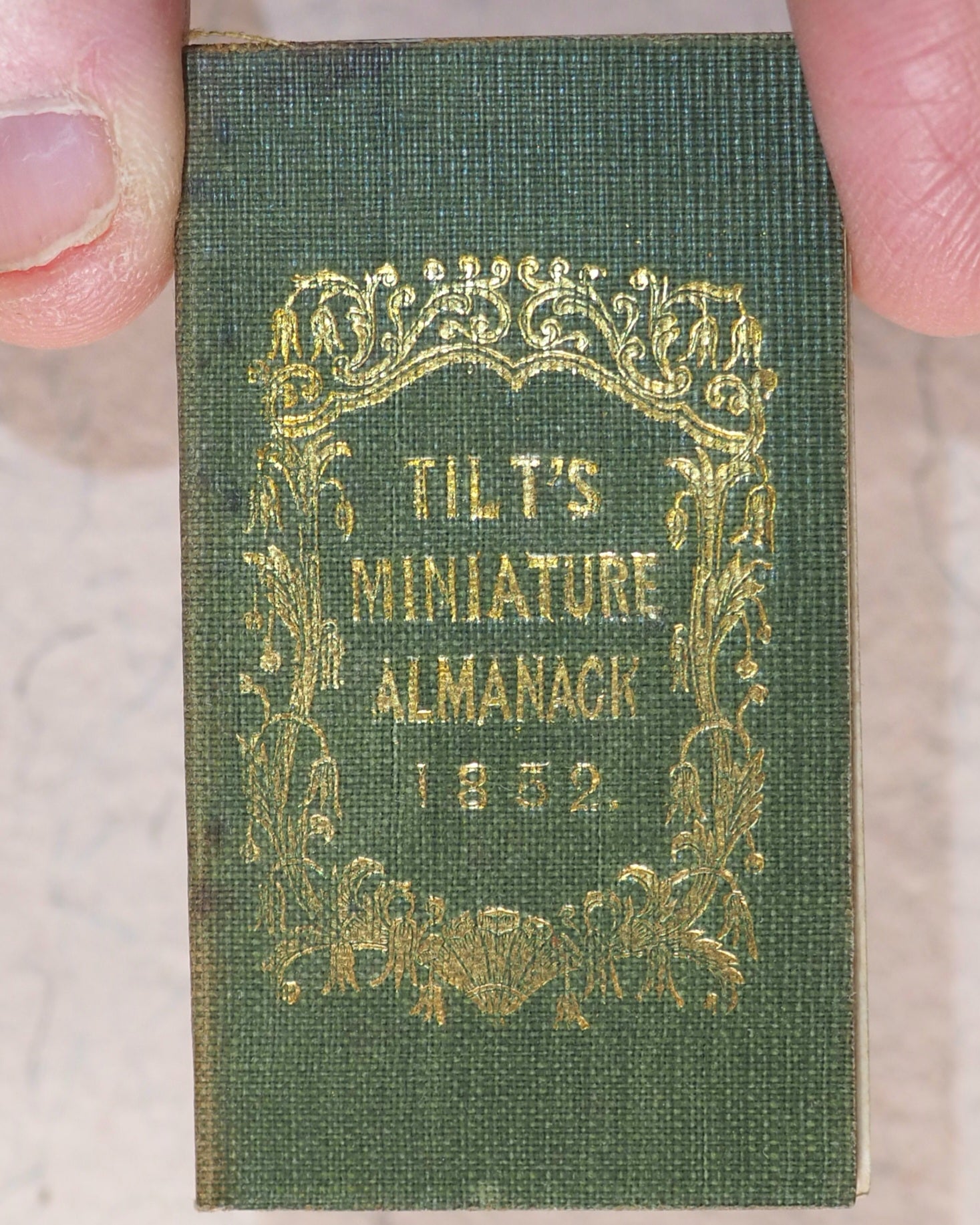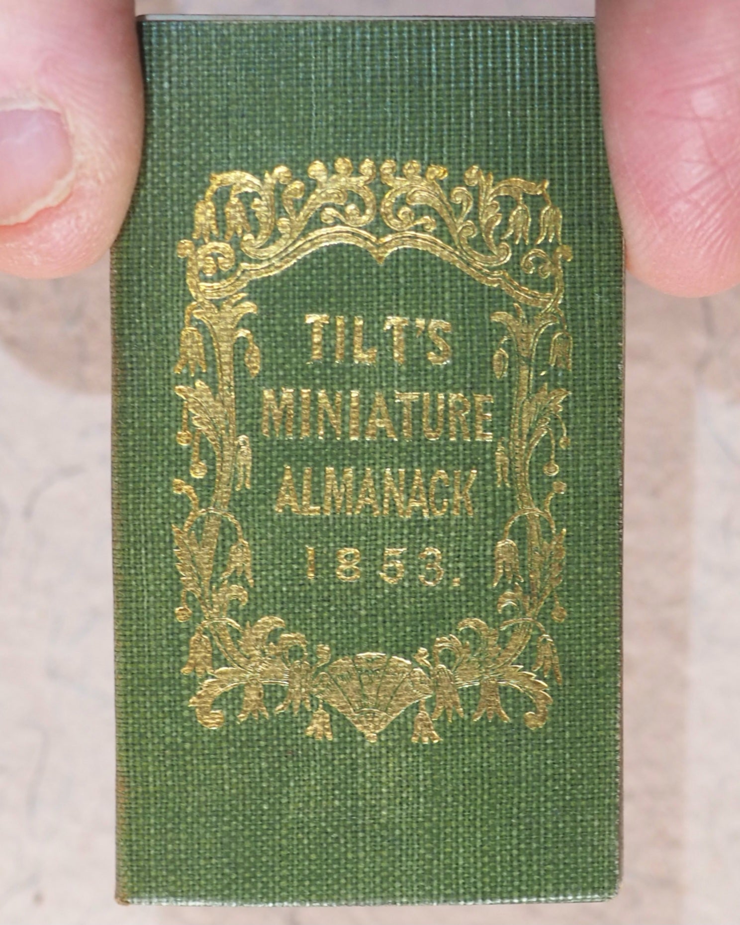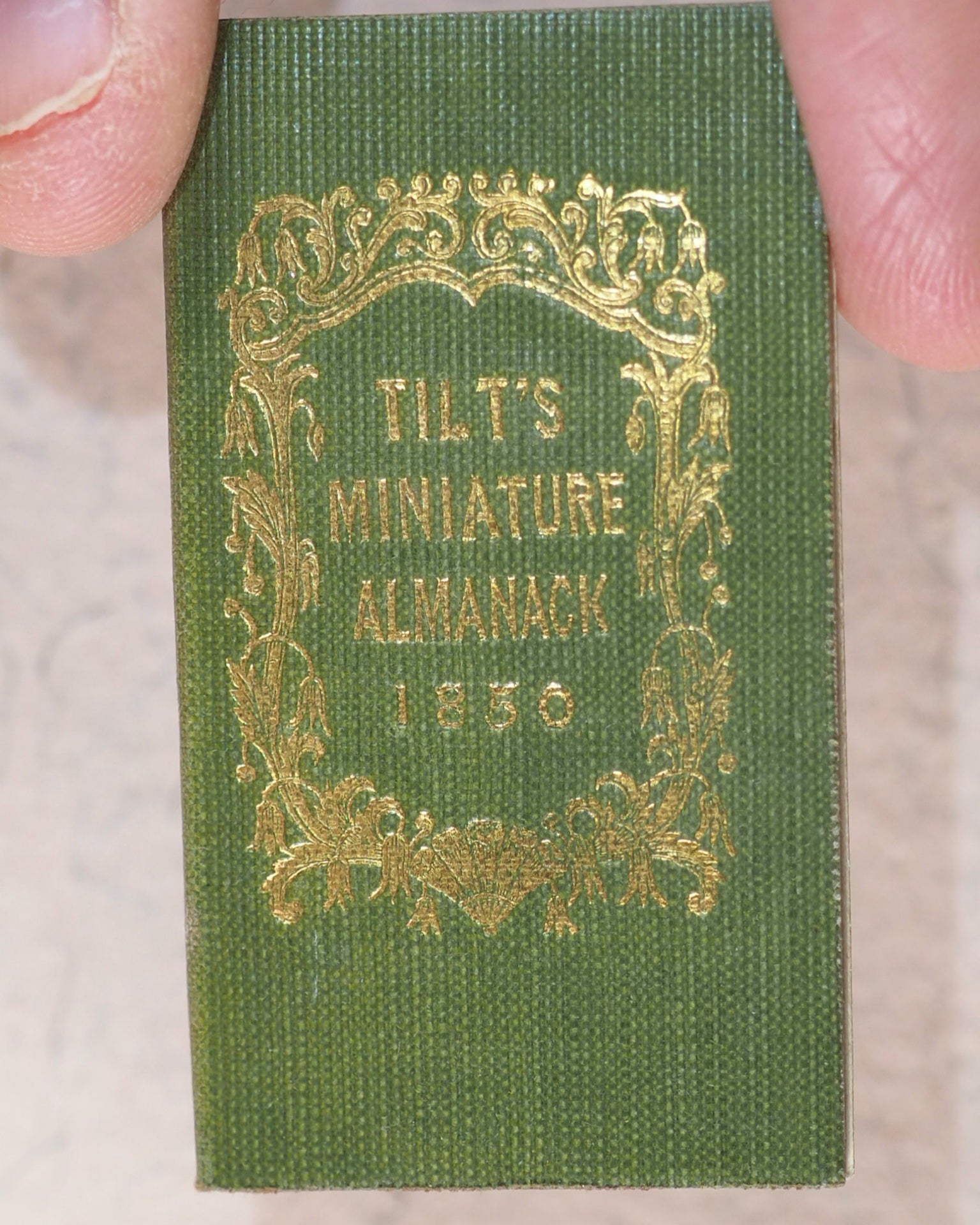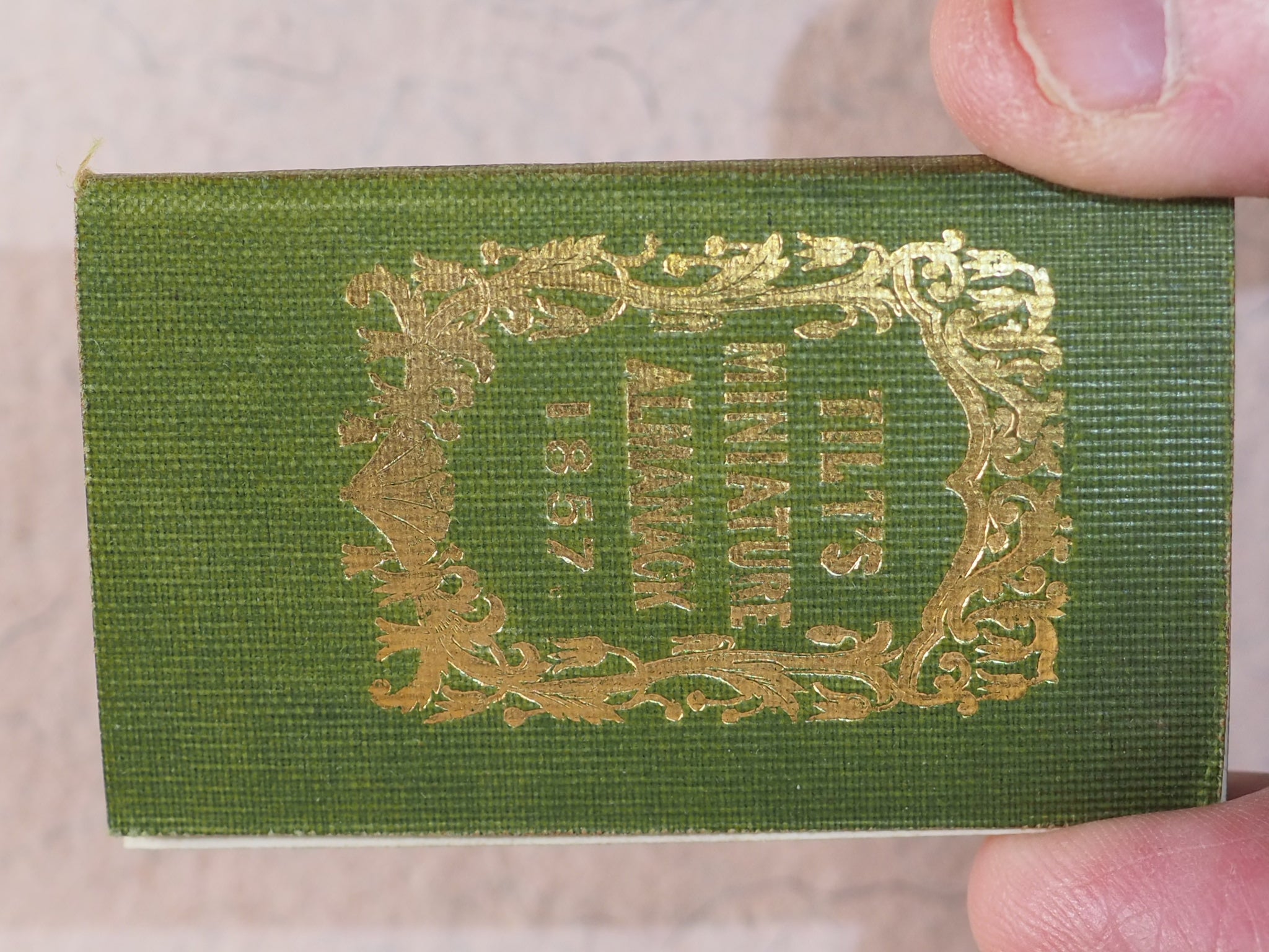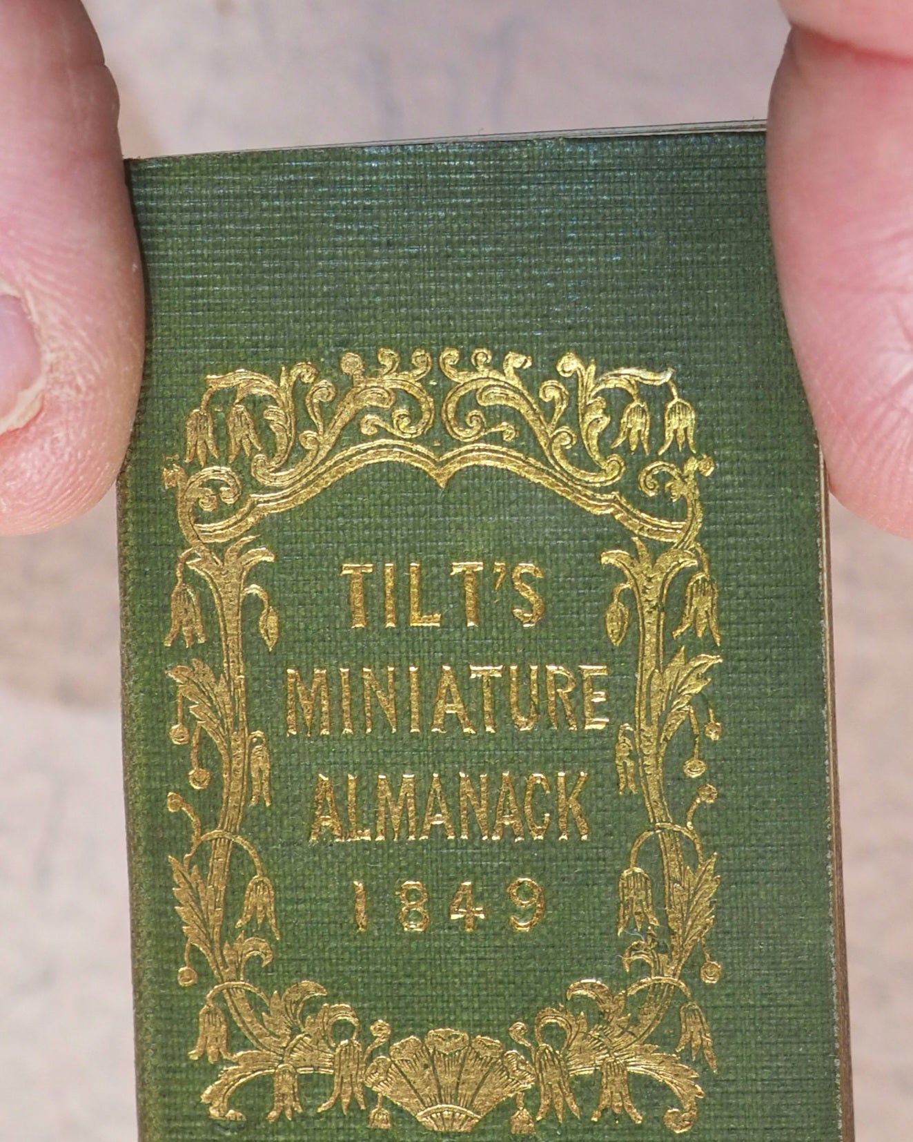 A substantial collection of 17 complete almanacs by various publishers, all in the same format and the same series. Editions for the years 1849, 1850, 1851, 1852, 1853, 1854, 1855, 1856, 1857,1858, 1859, 1860, 1861, 1862, 1864, 1865, and 1871. Of these 17 items, 10 are not listed in WorldCat, and of the 7 editions that have been listed, there are only 9 copies known. 13 of these almanacs are not listed in Doris Welsh's standard Bibliography of Miniature Books. Bondy says "Many collectors also value highly another series issued under the title Tilt's Miniature Almanac or Tilt's Useful Almanac by one or the other of the following publishers: Tilt, Tilt and Bogue, D.Bogue, late Tilt and Bogue, W.Kent, Piper and Carter, and Kent & Co. over a period ranging from 1836 to at least 1886". Some endpapers and pages with contemporary inscriptions. Some leaves loose due to the simple glue binding techniques. 37 x 61 mm. Original green flexible buckram covers with gilt titling. Overall in very good condition. Together with an antique Tunbridgeware box with a hinged decorative lid and original knob. Bondy, 44. Welsh, 6733 (1850 edition), 6734 (1851 edition), 6735 (1855 edition), 6736 (1856 edition), 6738 (1871 edition). OCLC, 299608210 (1849 edition, WorldCat locates one copy worldwide - Virginia). 763202461 (1850 edition, one copy - Indiana). 244110592 (1851 edition, one copy - Grolier Club). 2441072297 (1855 edition, three copies - Grolier, Virginia and Strong Rochester). 1043419777 (1858 edition, one copy - Oxford Uni.). 62114132 (1861 edition, one copy - Williams College, Williamstown). 1117775086 (1864 edition, one copy - Washington Uni. St. Louis).