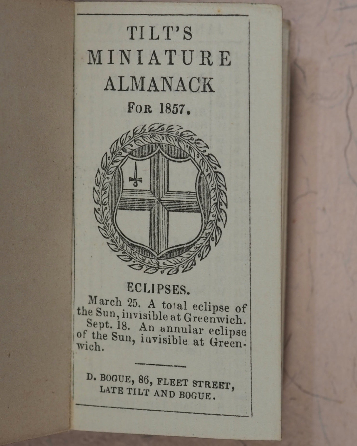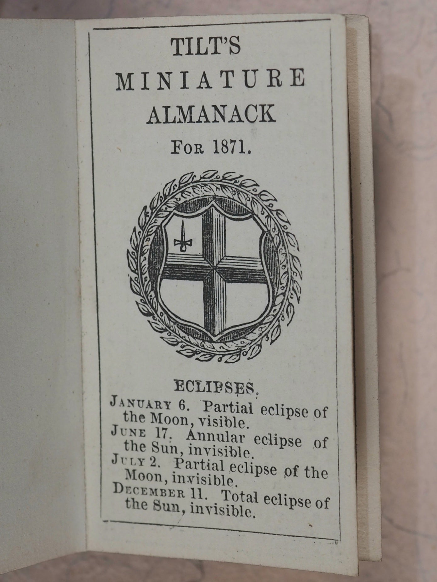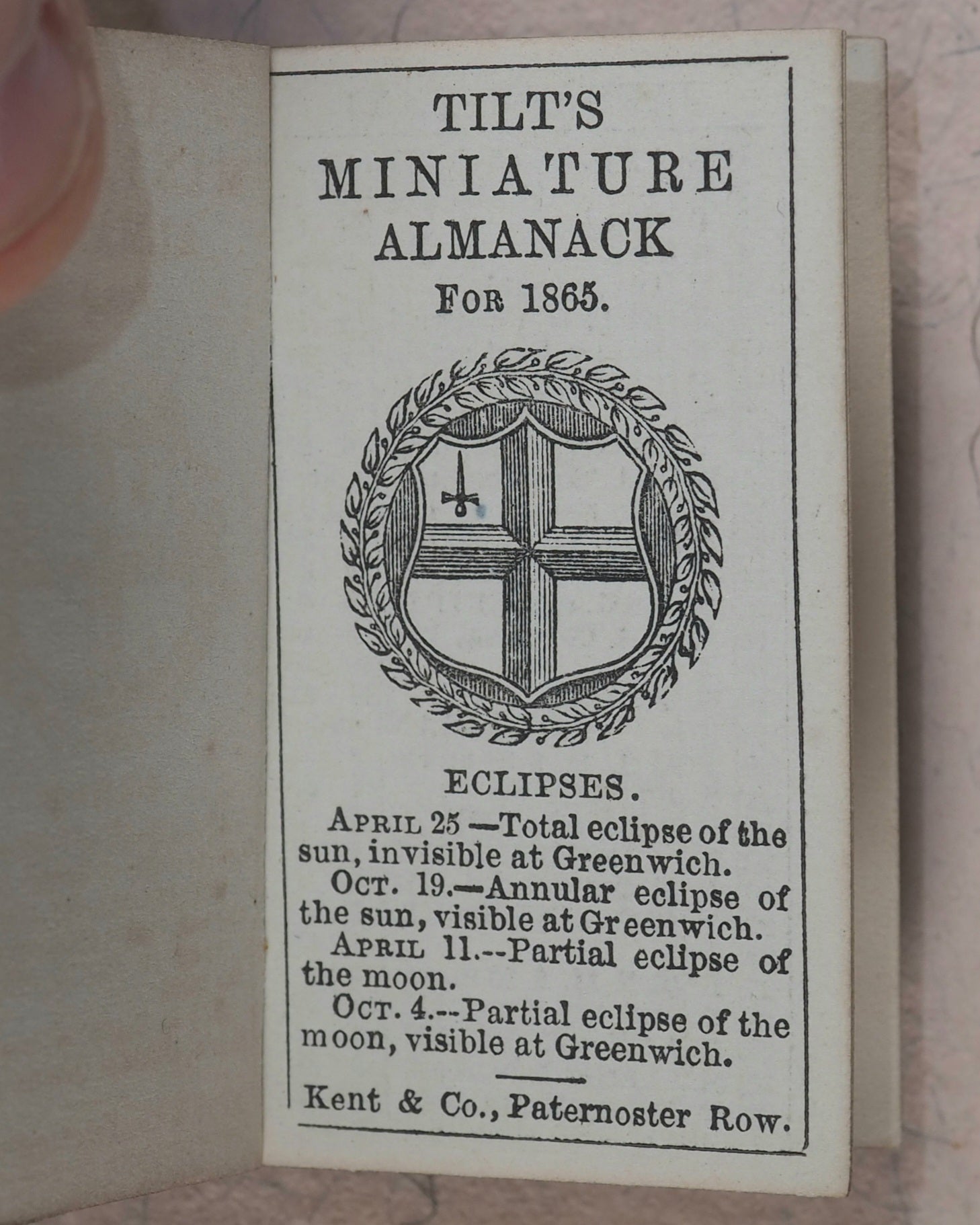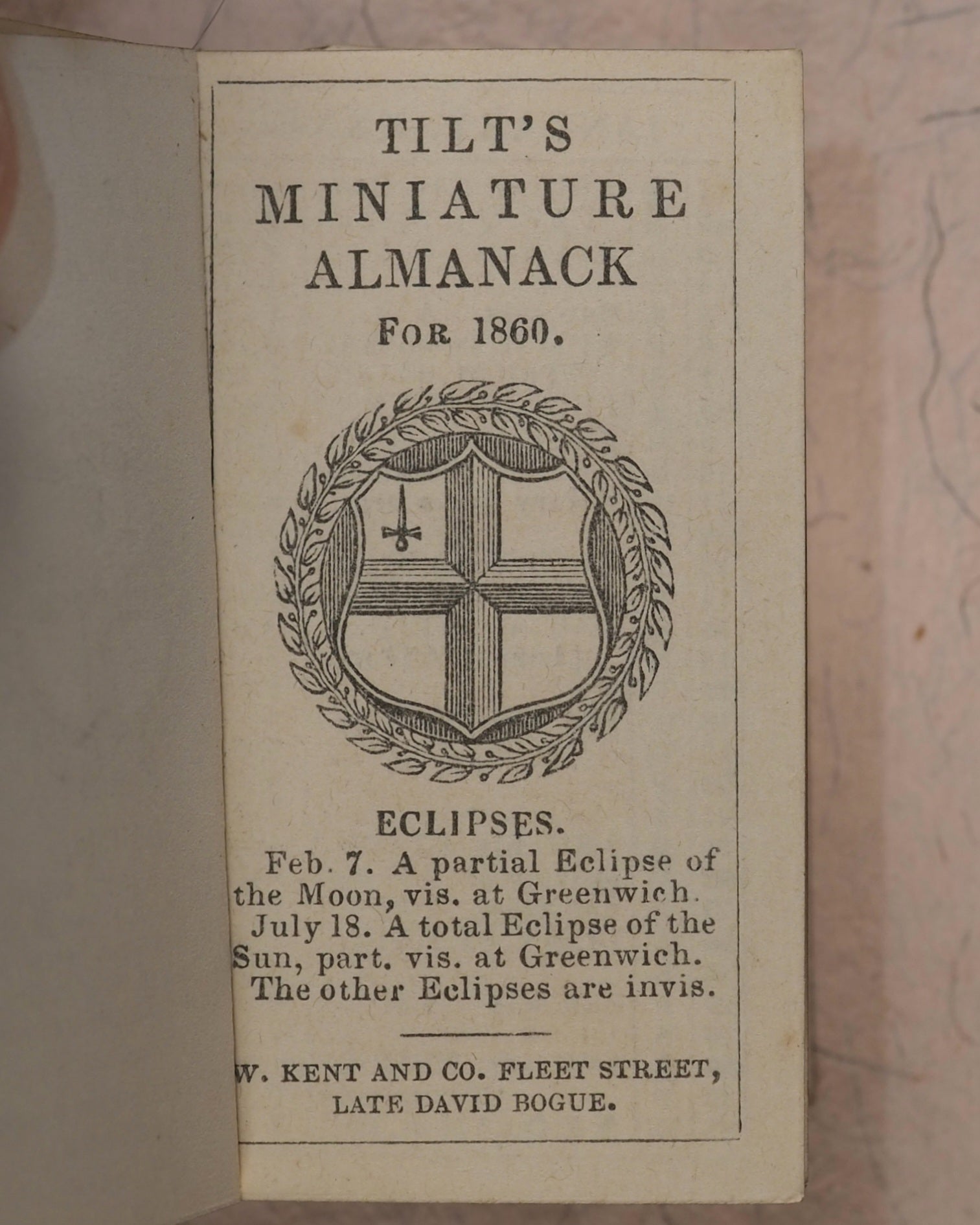 ![Tilt's Miniature Almanack. Various publishers. London. [1848-1870] >>RUN OF SCARCE COLLECTABLE ALMANACS<<](http://camden-lock-books.myshopify.com/cdn/shop/files/P1280719_{width}x.jpg?v=1738074285)