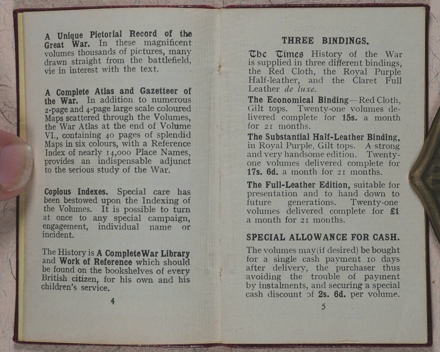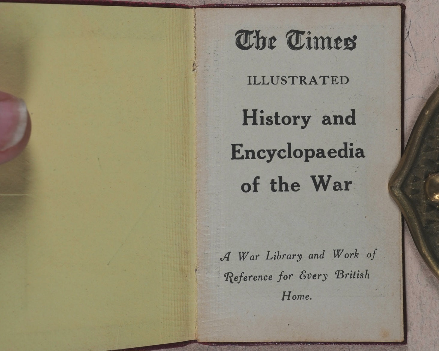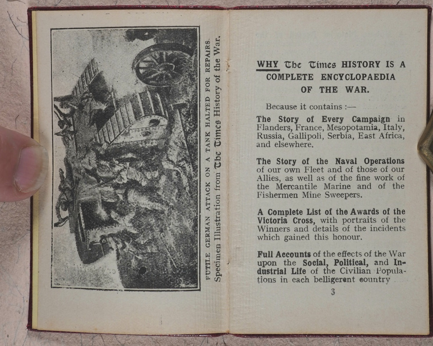 26, [6] pages : illustrations ; prospectus or publisher's advertisement, containing : title page (p. [1]); 1 specimen illustration (p. [2]); "Why The Times History is a complete encyclopaedia of the war (p. 3-4); binding descriptions (p. 5); 1 specimen page of text (p. 6); Diary of the Great War (p. 7-26); calendars for 1919 and 1920 followed by pages for "Memoranda" (p. [1]-[6] at end). 52 x 85 mm. Original full burgundy morocco. 'The Times HISTORY OF THE WAR' on front cover in gilt. Not in Bondy, nor in Spielmann, nor in Welsh. OCLC, 733758149. WorldCat lists just one solitary example, that is housed in the University of Virginia Library.