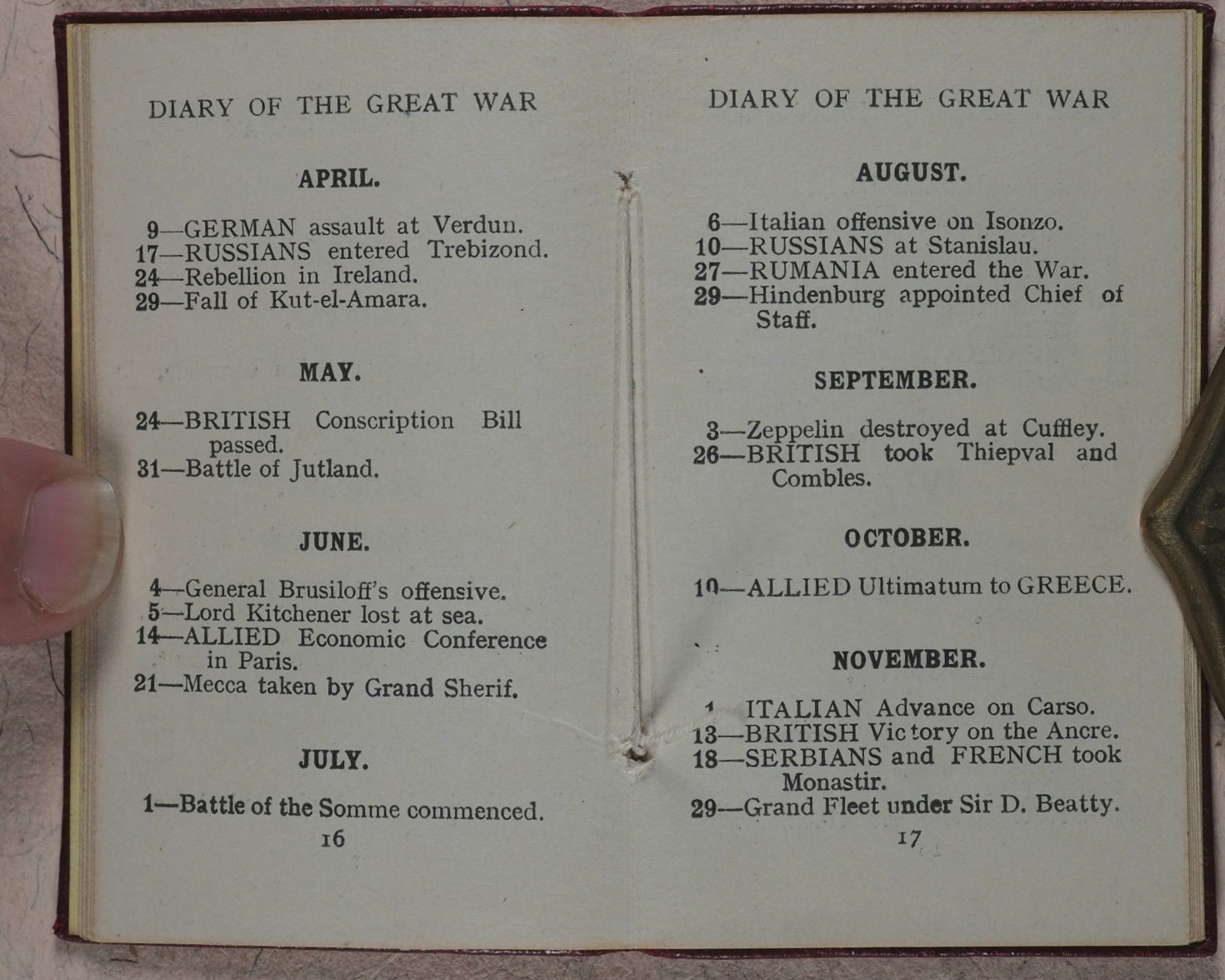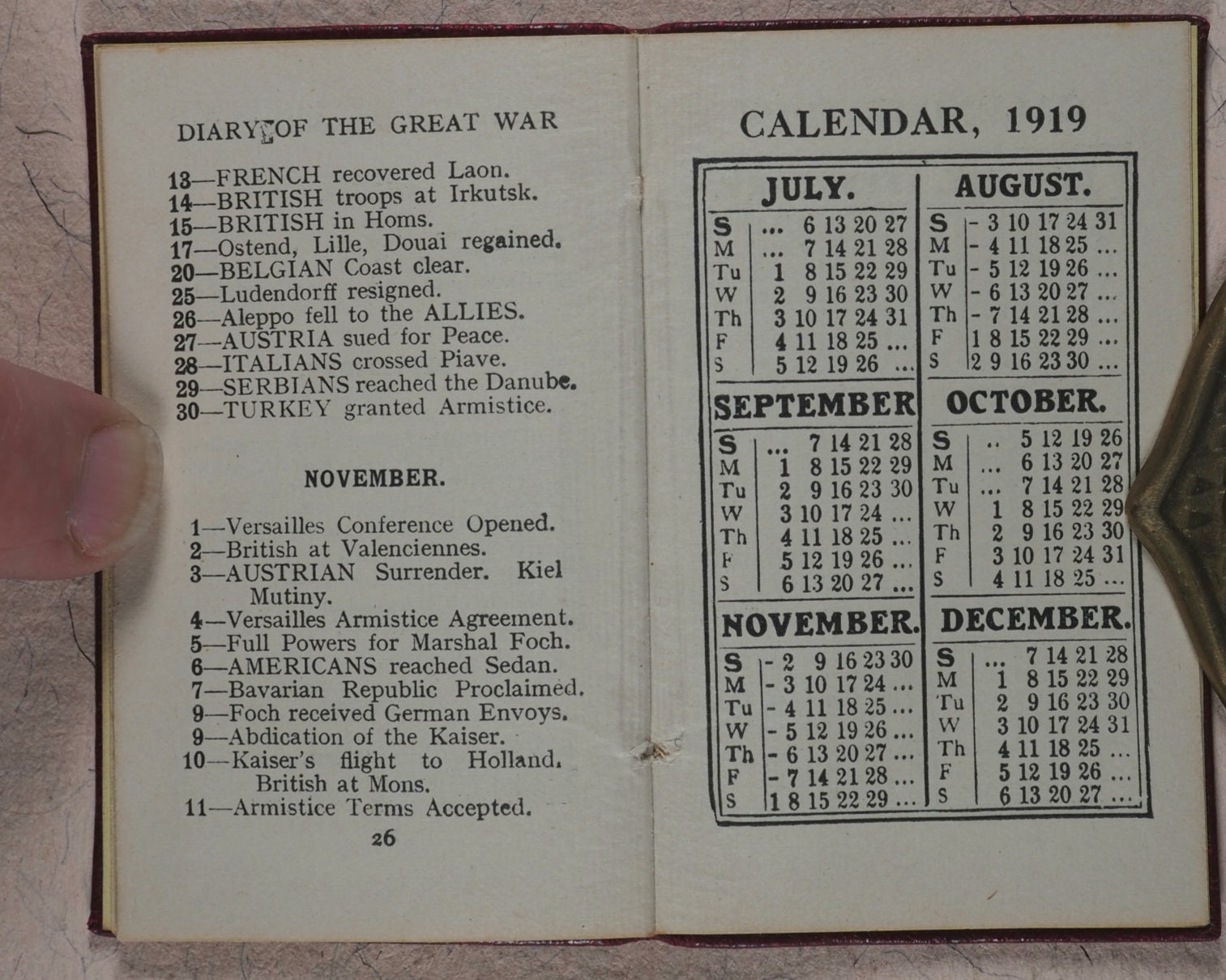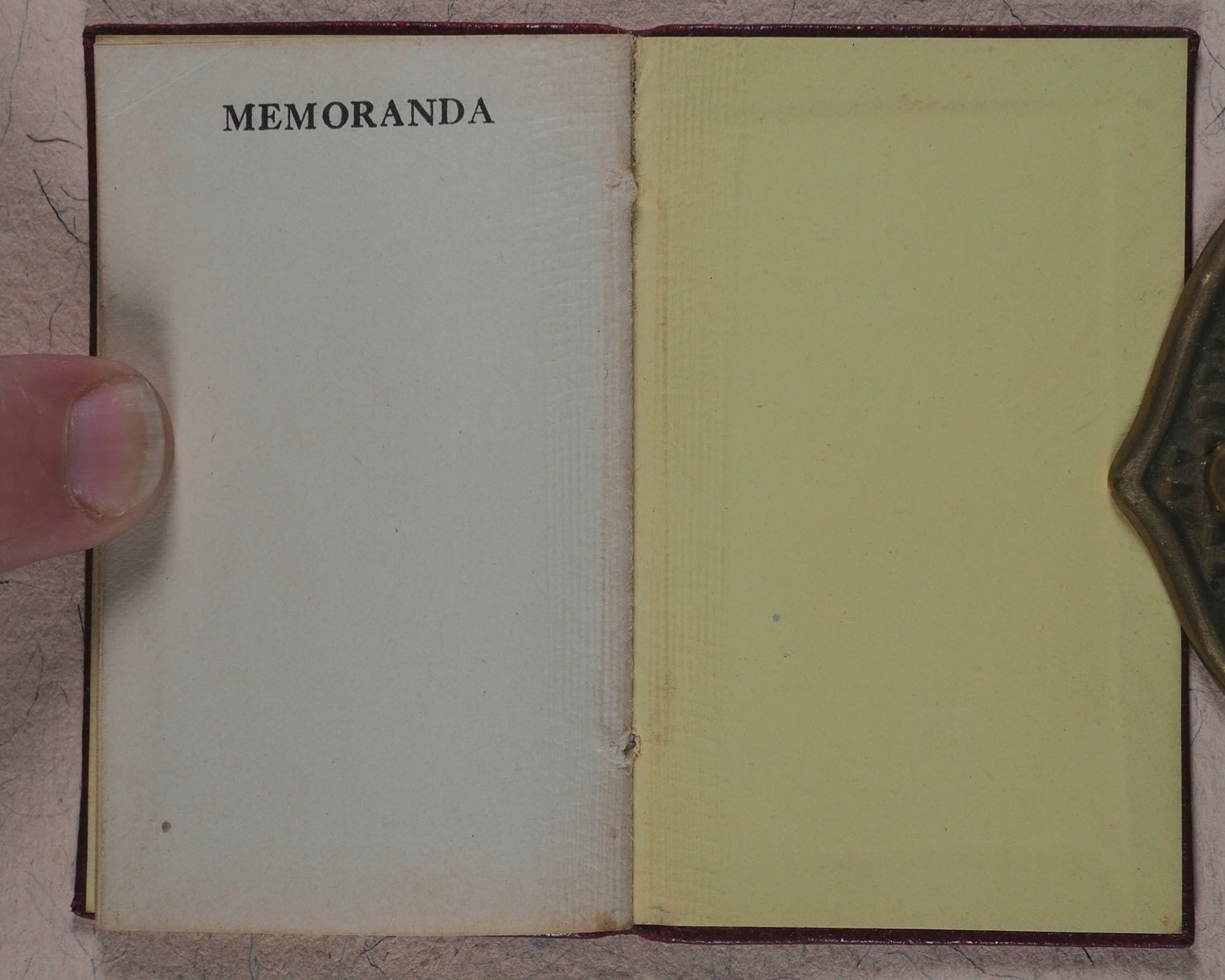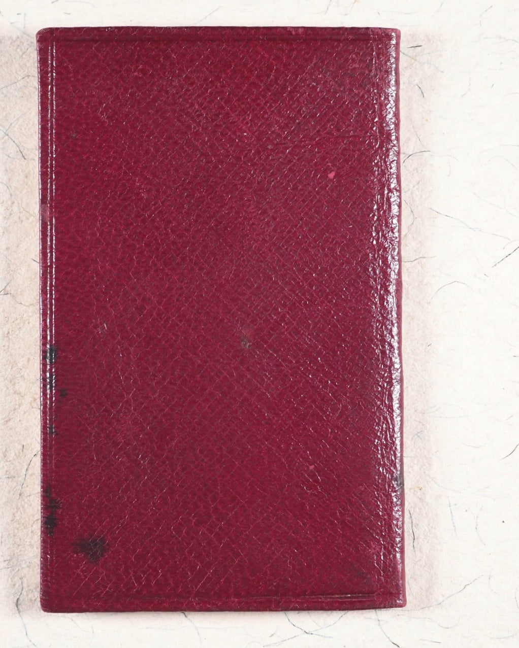 26, [6] pages : illustrations ; prospectus or publisher's advertisement, containing : title page (p. [1]); 1 specimen illustration (p. [2]); "Why The Times History is a complete encyclopaedia of the war (p. 3-4); binding descriptions (p. 5); 1 specimen page of text (p. 6); Diary of the Great War (p. 7-26); calendars for 1919 and 1920 followed by pages for "Memoranda" (p. [1]-[6] at end). 52 x 85 mm. Original full burgundy morocco. 'The Times HISTORY OF THE WAR' on front cover in gilt. Not in Bondy, nor in Spielmann, nor in Welsh. OCLC, 733758149. WorldCat lists just one solitary example, that is housed in the University of Virginia Library.
