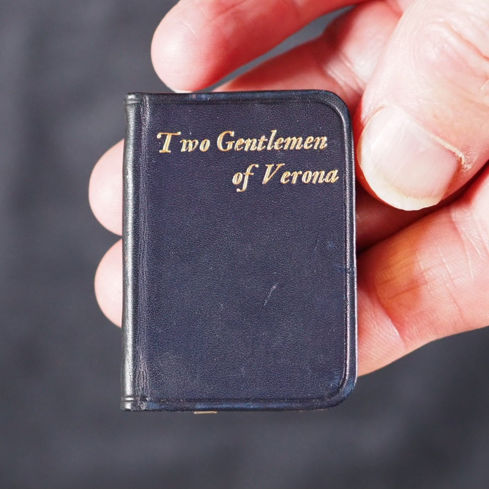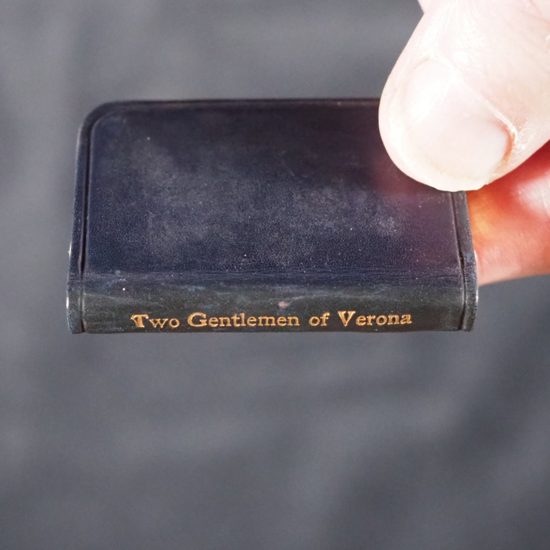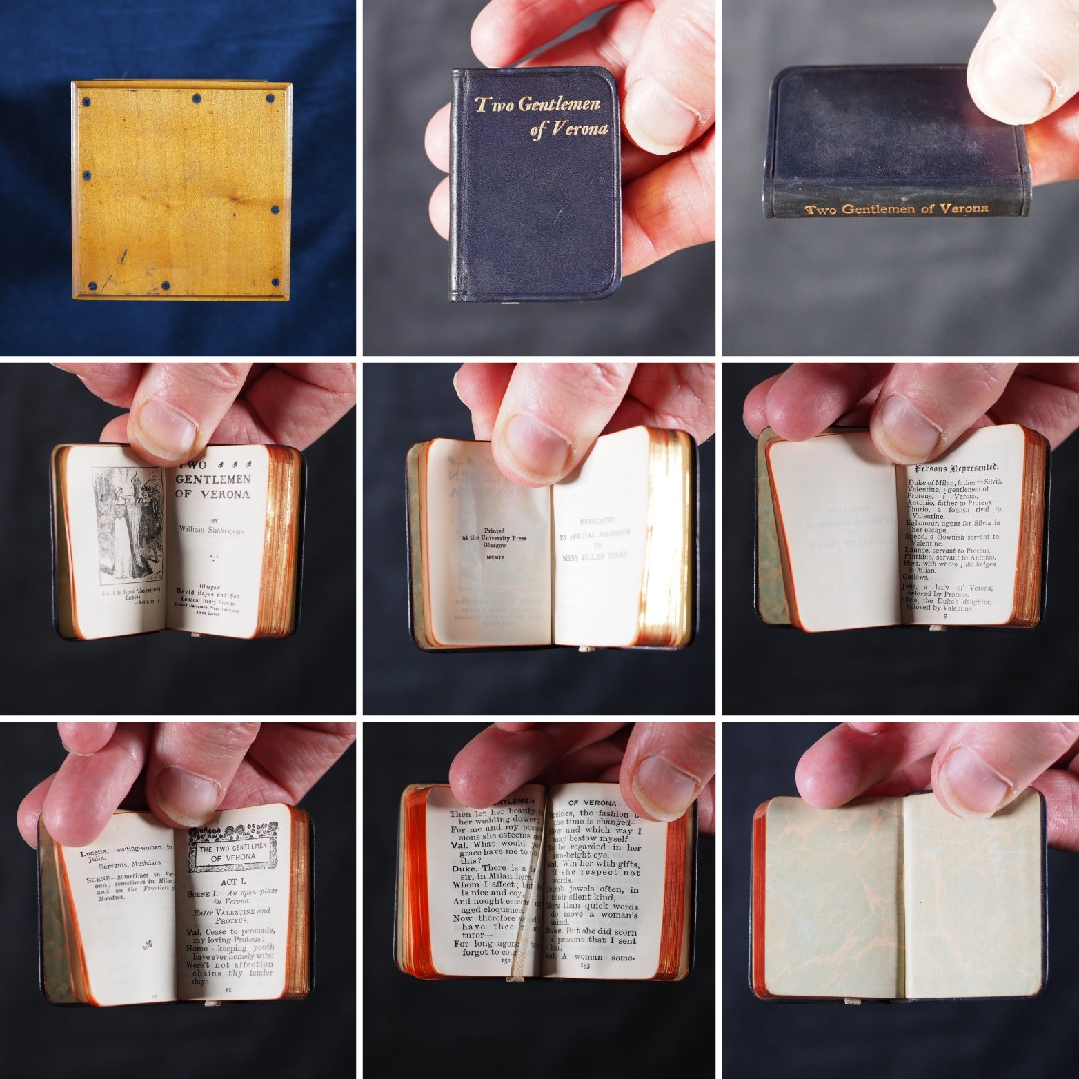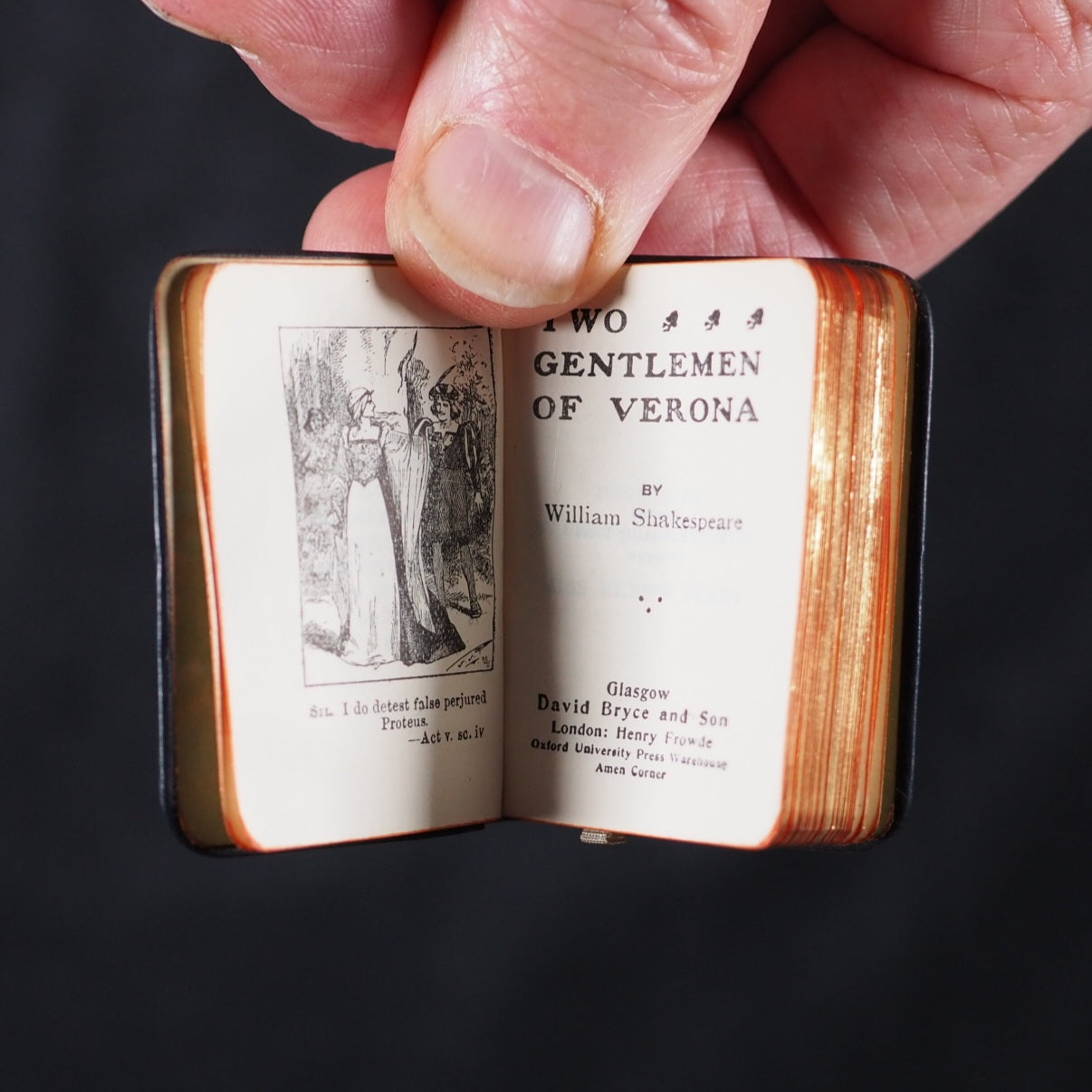 Shakespeare, William. Ellen Terry Complete Works of William Shakespeare, in 40 volumes. Bryce, David & Son. Glasgow. 1904. Complete Works. [Slimmer revolving bookcase].Complete 40-volume miniature book set of Shakespeare's works. Complete with frontispieces and portraits. Edited by J.Talfourd Blair. Dedicated to the actress Ellen Terry and printed in 1904 in Glasgow by David Bryce and Son and published jointly with Henry Frowde, Oxford University Press Warehouse, Amen Corner. Rounded corners. Marbled endpapers. All edges gilt over red. Original ivory silk place-markers. The books measure 38 x 55 mm. The bookcase is 100 x 100x 160 mm. Original full dark blue calf with gilt titling on the spines (minusculee amount of rubbing to the edges of the spines and some cover edges). Housed in the original light stained 8-compartment revolving wooden sycamore bookcase (four sides with two compartments in each side, each holding 5 books; no obvious chipping to edges). It is on a matching small wooden pedestal and rotates to imitate a full-size version of such a bookcase but the books have finer India paper, are slimmer and the bookcase is also the slimmer version of two sizes issued for Bryce Shakespeare sets. Of the Ellen Terry series, Louis Bondy wrote that these volumes are "Bryce's greatest achievement as a leading promoter of miniature books," and, in particular, he describes the Shakespeare as "the most prodigious of these sets" (Bondy, p.114). Most of the sets were printed in 1904. Included are all the plays, the sonnets, a biographical sketch, and glossary. A beautiful and sought after Shakespeare set that is more commonly found in reverse calf or ivorine bindings. Bromer, 51. Garbett, 41. Spielmann, 459. Welsh, 6264. American Art Association, 182. This is an uncommon complete miniature book set, meticulously printed and bound for the David Bryce Company in Glasgow, noted for their miniature book production. Bromer, 51.Garbett41. Spielmann, 459. Welsh, 6264. OCLC, . WorldCat locates copies worldwide. 124 firsts2024