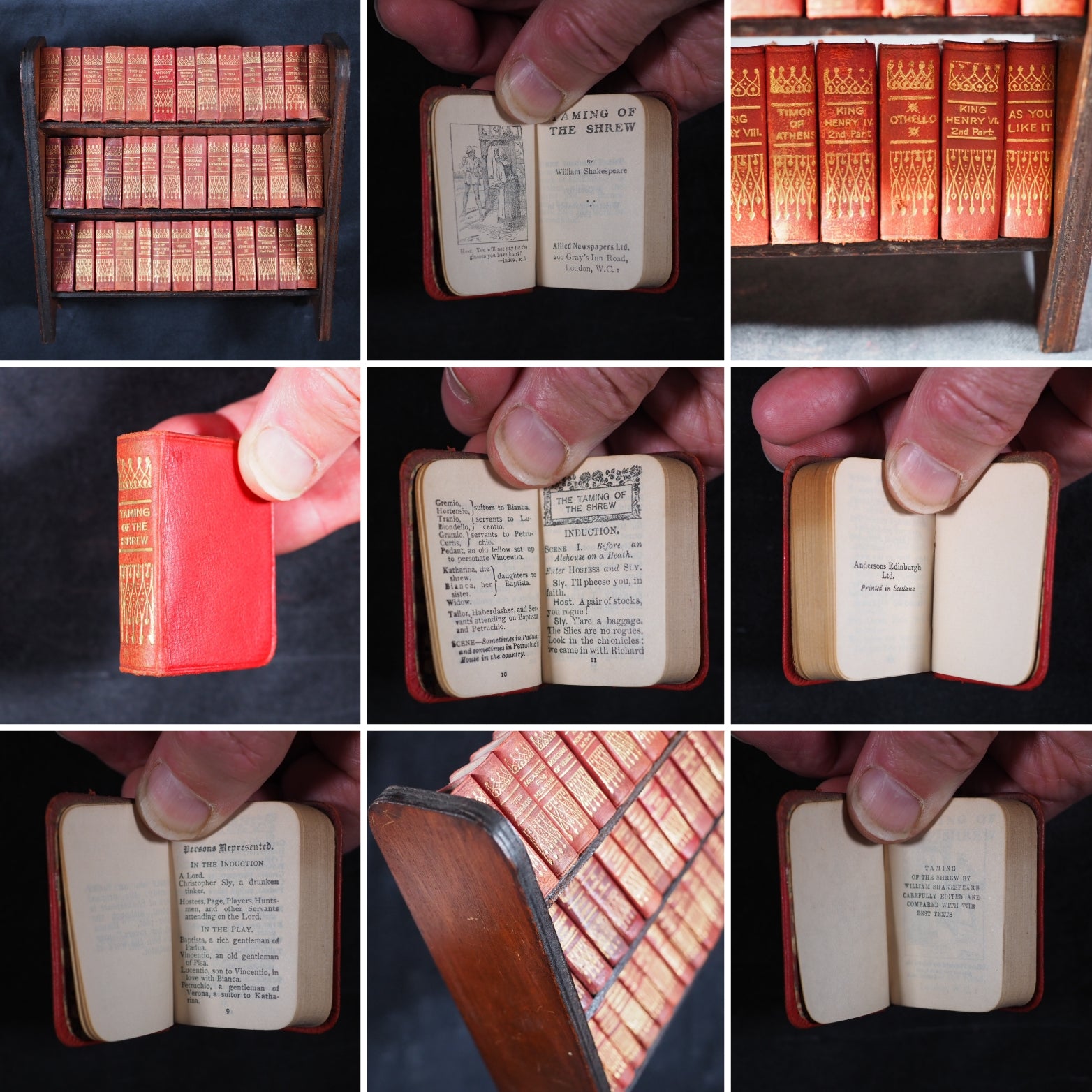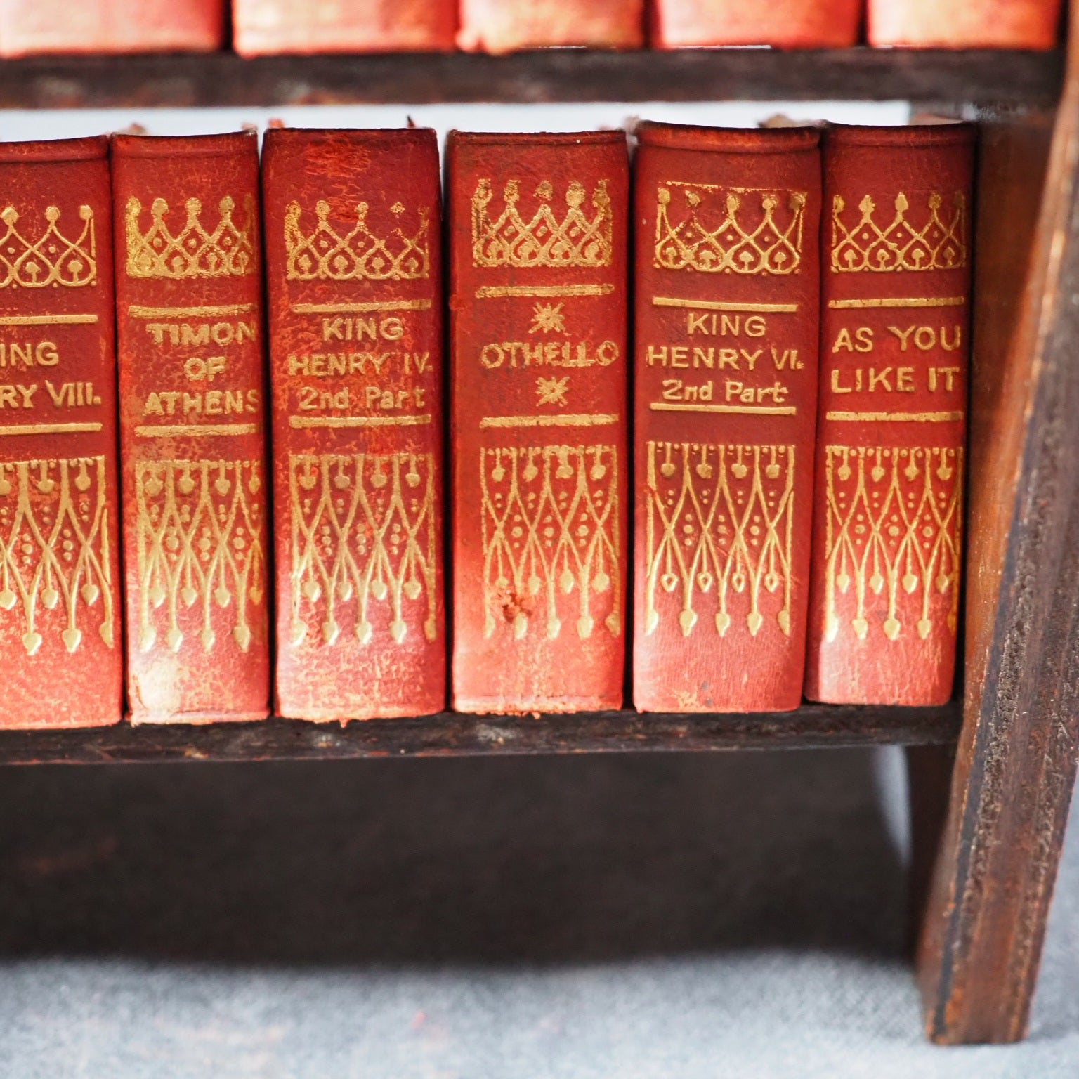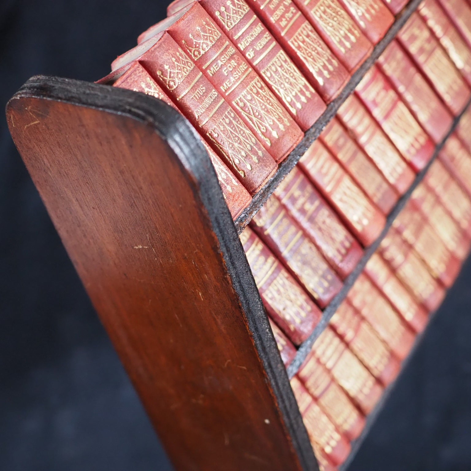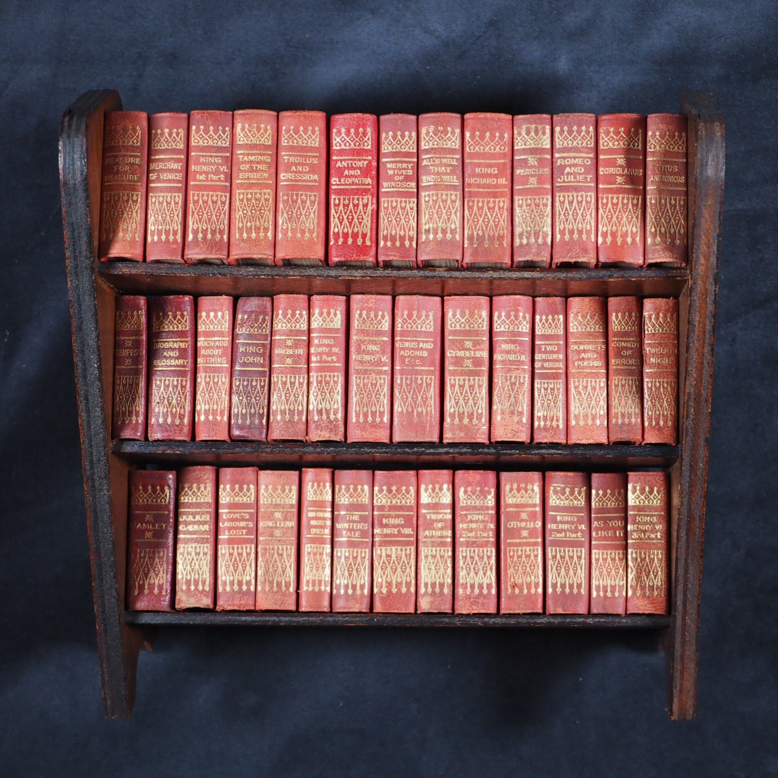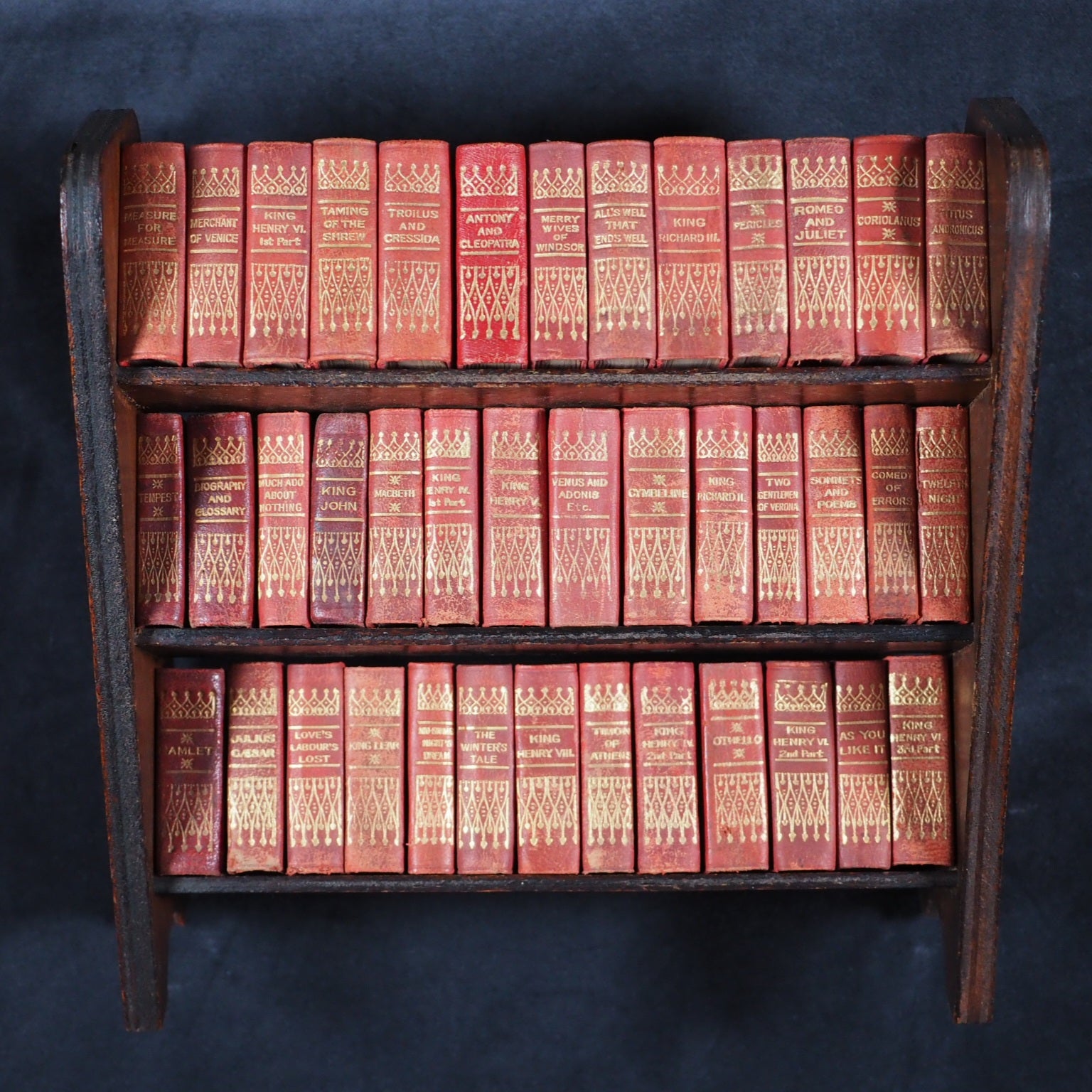 Shakespeare, William. Works. Andersons, Edinburgh Ltd. for Allied Newspapers. [London]. 1932. Circa 1932. De Luxe red full leather bindings. Complete set of 40 volumes. Comprising: the tempest; The two gentlemen of Verona; The merry wives of Windsor; Measure for measure; The comedy of errors; Much ado about nothing; Love's labour's lost; A midsummer night's dream; The merchant of Venice; As you like it; The taming of the shrew; All's well that ends well; Twelfth night; The winter's tale; King John; Richard II; Henry IV, part 1; Henry IV, part 2; Henry V; Henry VI, part 1; Henry VI, part 2; Henry VI, part 3; Richard III; Henry VIII; Troilus and Cressida; Coriolanus; Titus Andronicus; Romeo and Juliet; Timon of Athens; Julius Caesar; Macbeth; Hamlet; King Lear; Othello; Antony and Cleopatra; Cymbeline; Pericles [Prince of Tyre];Venus and Adonis; Rape of Lucrece; Sonnets and poems; Glossary. Original plywood 3 shelf free-standing bookshelf.Printed in Scotland and published by Allied Newspapers to commemorate the opening of the The Royal Shakespeare Theatre in Stratford-upon-Avon opened on 23 April, 1932 on the site adjacent to the original Shakespeare Memorial Theatre (opened 19 April 1879), which had been destroyed by fire on 6 March 1926. Usually found in rexine (imitation black morocco), often with a simple 3 tier oak bookshelf, this de-luxe edition in red leather with superior gilt work to spine. Original red calf (somre slight rubbing). The text and the design for the spines was formerly created and published as the 1904 Ellen Terry edition by David Bryce & Son, Glasgow, who went out of business just at te end of World War One in 1918. Andersons acquired manyof the publishing assets of Bryce and re-published them in the following decades. Bondy, 123. OCLC, 43008884. WorldCat locates 13 copies in the black rexine binding worldwide. 149 Firsts2024