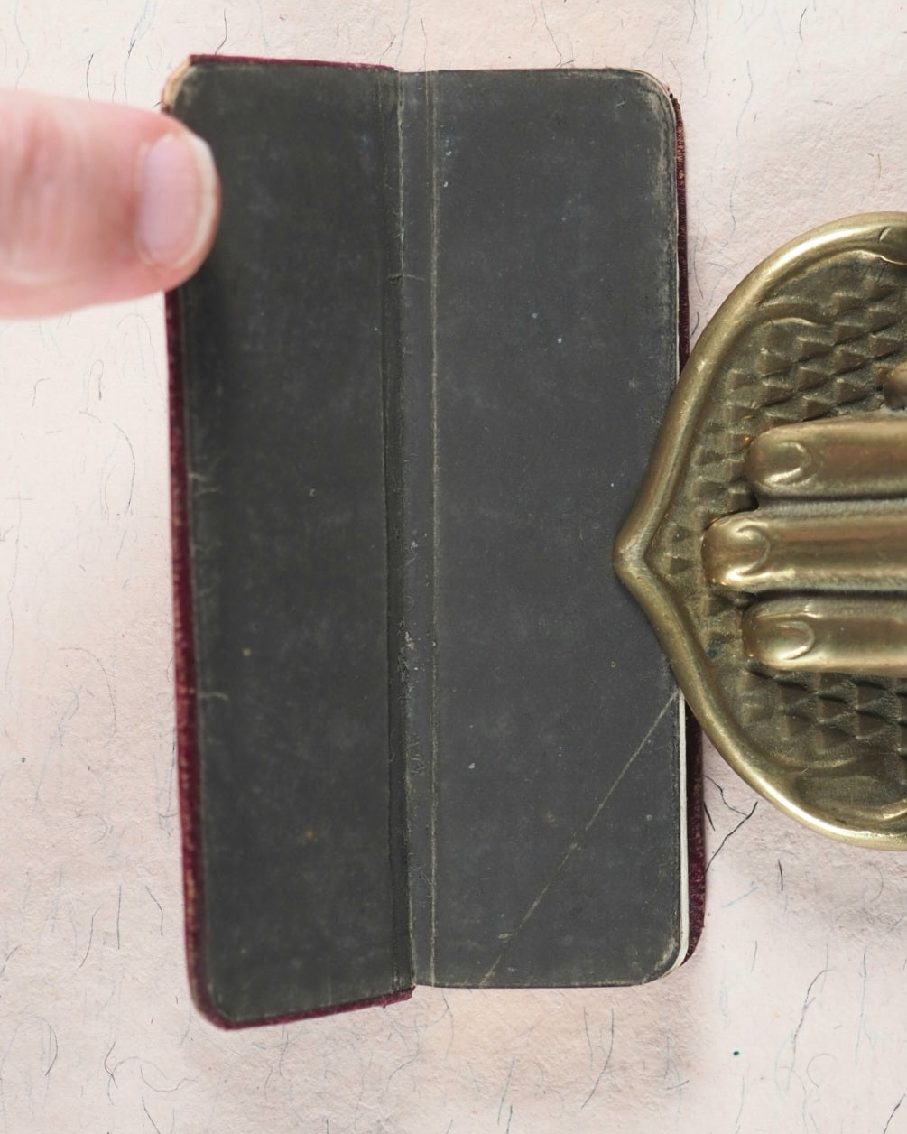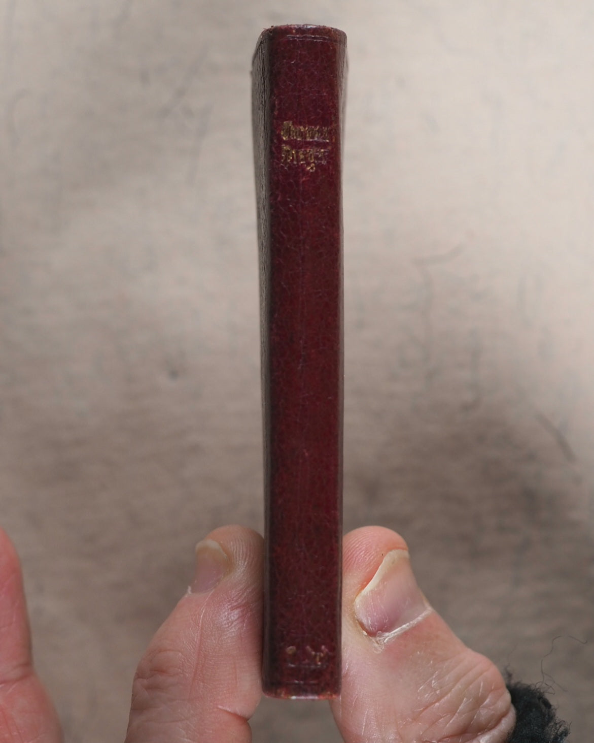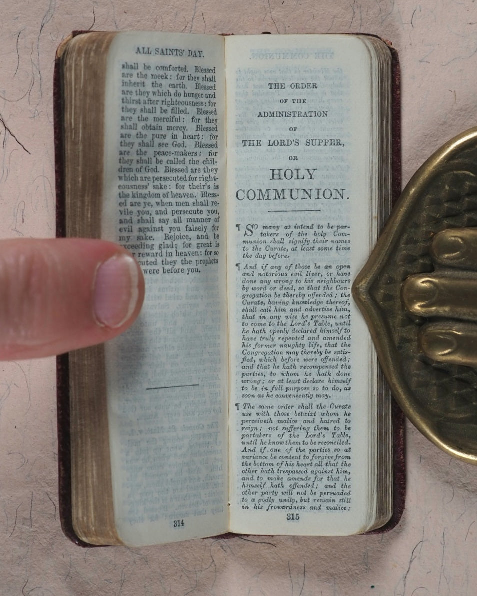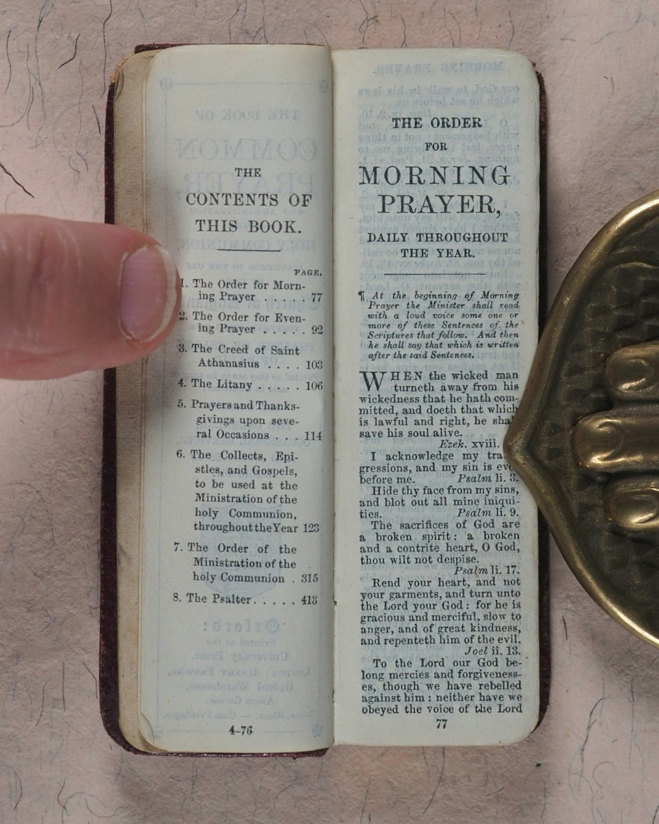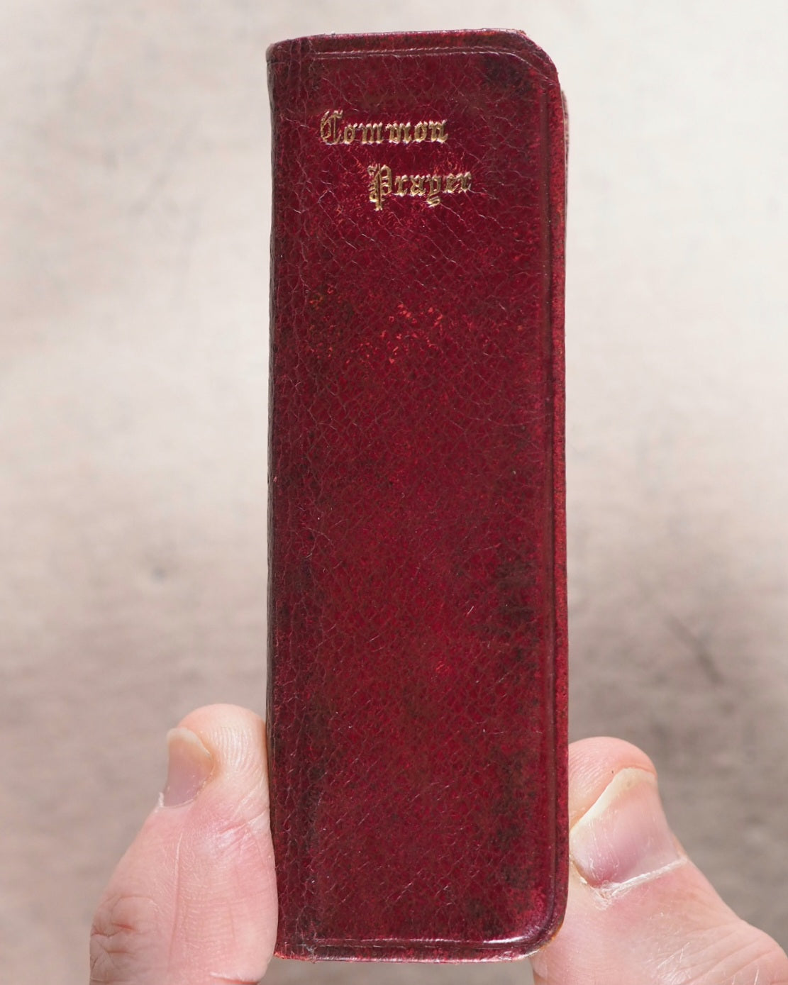 Some page edges creased. All edges gilt. Original black endpapers. Ink ownership inscription on verso of front free endpaper, dated 1892. 28 x 92mm. Original maroon morocco binding. Gilt titling and 'Oxford' on spine. Front cover embossed with IHS and 'Common Prayer' in gilt. Slightly rubbed and patinated. Bondy, 131. Spielmann, 154A. Welsh, 1855. OCLC 1434159435.