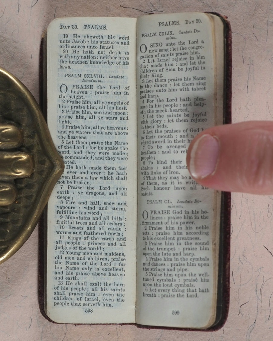 Book of common prayer, and administration of the Holy Communion according to the use of the Church of England : together with the Psalter, or Psalms of David, pointed as they are to be sung or said in churches, but without the Calendar, Occasional services and Articles of religion. [4], 77-599, [1] printed pages pages. Fine India paper. Title within a single border, with cross pattée cornerpieces. Diam. 96mo. Cum Privilegio, on title page.