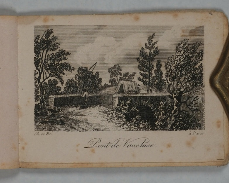 20 pages in French. 5 engravings, signed in the plate, Chezaud et Braulart, Paris. Printed by Dondey-Dupré, Rue St-Louis, 46, au Marais. No inscriptions. 66 x 46 mm. Original yellow glossy paper wrappers. Foot of spine slightly worn, covers slightly creased, edges with a few minuscule closed tears, and corners folded. Not in Bondy, nor Spielmann, nor Welsh. OCLC, 958830926. WorldCat records one sole copy worldwide at the Pierpont Morgan Library. The locations described and illustrated are romantic and imaginary idylls, such as the Immortal Bridge and the Lush Valley. The final page mentions seventeenth century painters Teniers and Paul Potter and their love of pastoral nature. This is a rare and beautifully illustrated miniature book in its original publisher's wrappers.