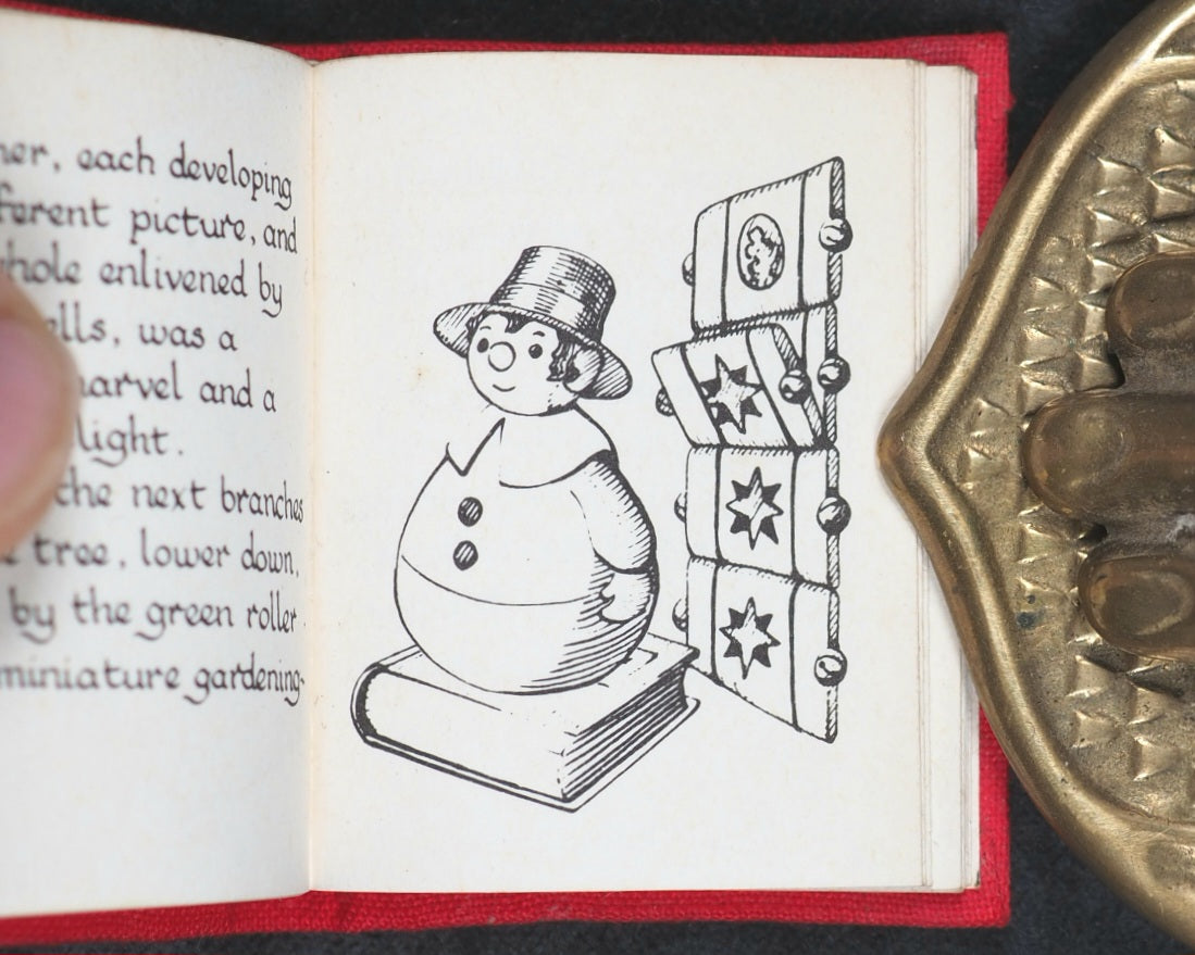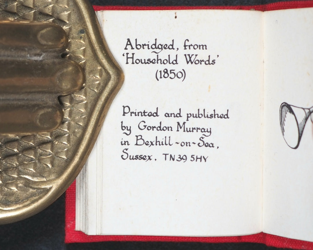 [46] pages. 12 vignette line illustrations. Abridged from 'Household Words' (1850). Gordon Murray (1921 - 2016) was the Author, Illustrator, Calligrapher, Book designer, and Publisher of Silver Thimble books. After his career as a producer and puppeteer for popular children's television programs like Camberwick Green and Trumpton, Murray turned to producing miniature books under the Silver Thimble imprint. He performed all aspects of the bookmaking process himself, founded and ran Silver Thimble Books, working from his home in Bexhill-On-Sea, England. He illustrated the books, often using his own hand-colored illustrations and watercolors.He inscribed the text with his own calligraphy and designed the overall look of the miniature books. He bound the books by hand. These miniature books are now considered collectors' items and they include: