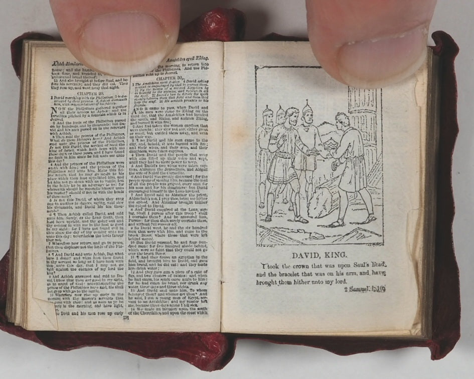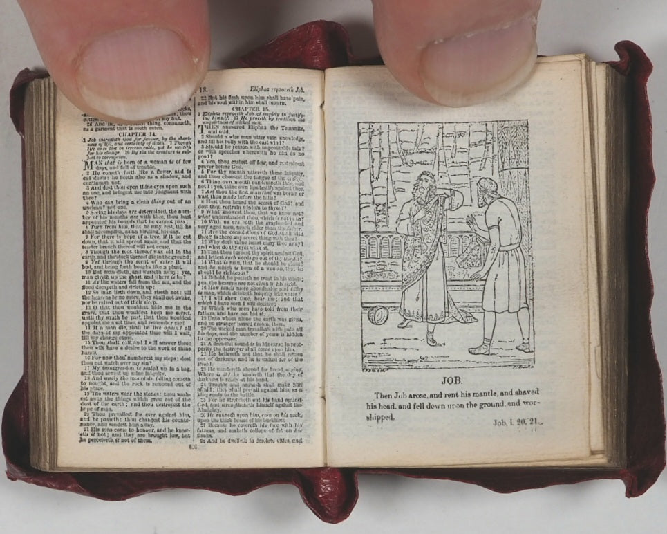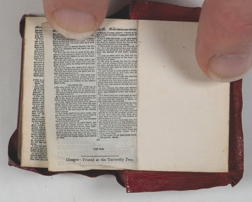 876 pages with 28 full-page illustrations. Printed by photo-reduction at the Glasgow University Press on the thinnest 'India' paper supplied by Henry Frowde of the Oxford University Press. First edition of what was then the smallest bible in the world. All edges gilt. Lacks front free endpaper. Original primrose endpapers. Contemporary ownership inscrption on recto of frontispiece. 30 x 42 mm. Original straight-grained red morocco yapp style binding with magnifying glass in front pocket. Light abrasions to the hinges. Bondy. 108. Garbett, 20. Spielmann, 25. Welsh, 562. A revolution in publishing for that era, given the number of pages and tiny size of the volume.