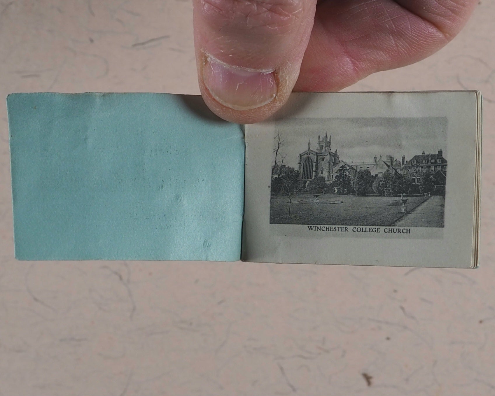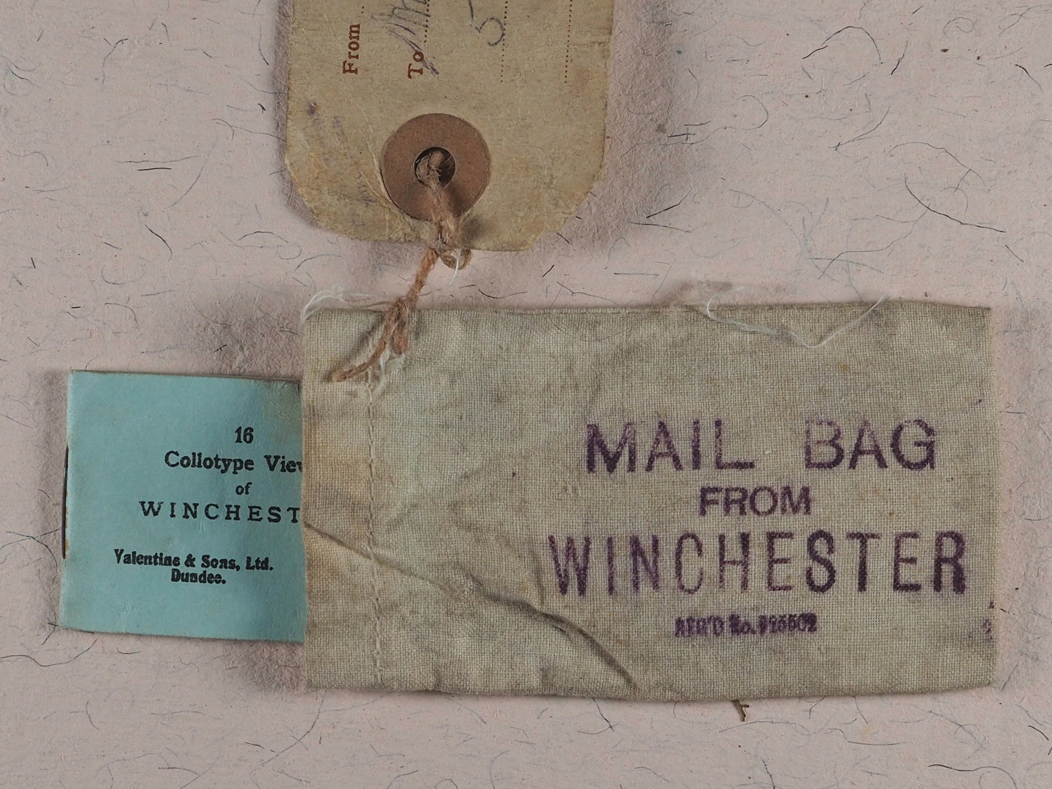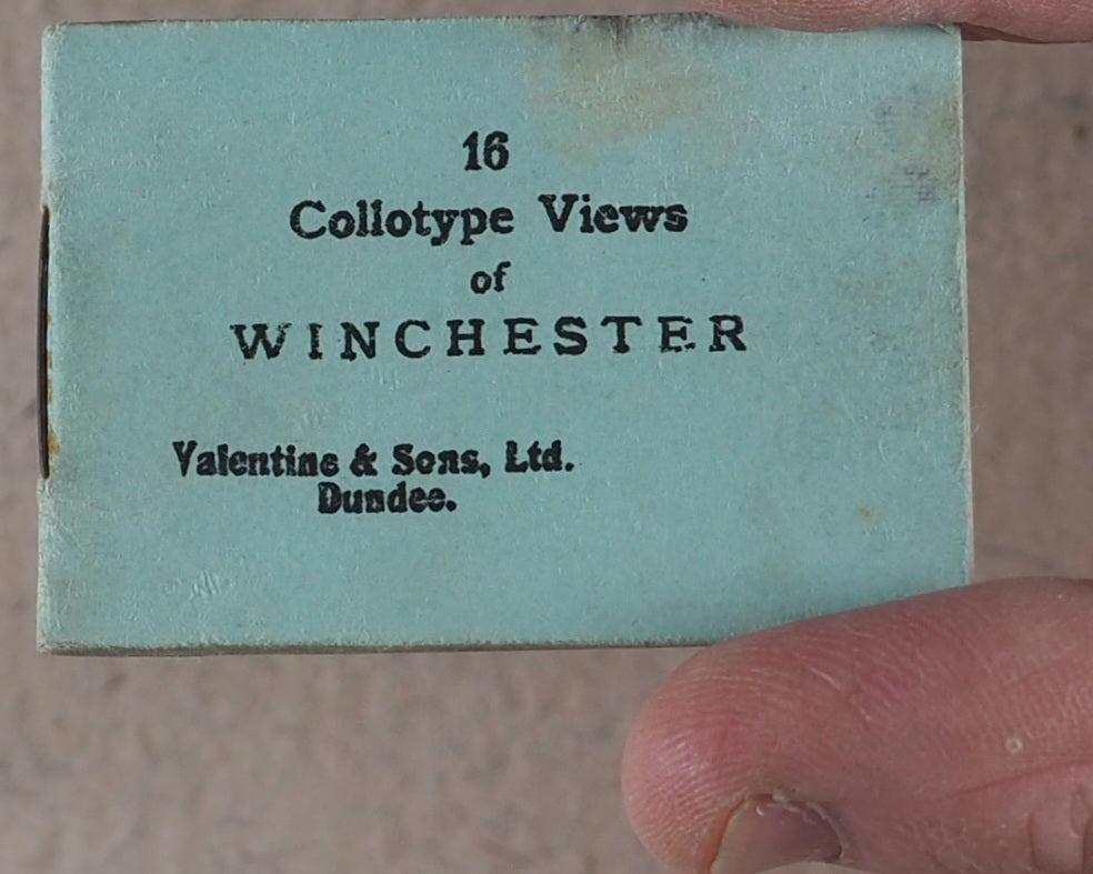 16 unnumbered pages of full-page black & white photographic illustrations of Winchester. No text. Staple bound in orignal light blue printed card wrappers. Complete with original heavy cream cotton bag, stamped in purple ink "MAIL BAG FROM WINCHESTER" with a registration number and attached by twine to the contemporary luggage stamped label that has been addressed and franked -Mrs. Kirrage, 5 Coldershaw Road, W. Ealing. August 11th, 1909. Rare survivor. 38 x 52 mm. Original blue card. Staple bound. Staple slightly rusty. Not in Bondy, nor Spielmann, nor Welsh. No OCLC number available. WorldCat locates zero copies worldwide.