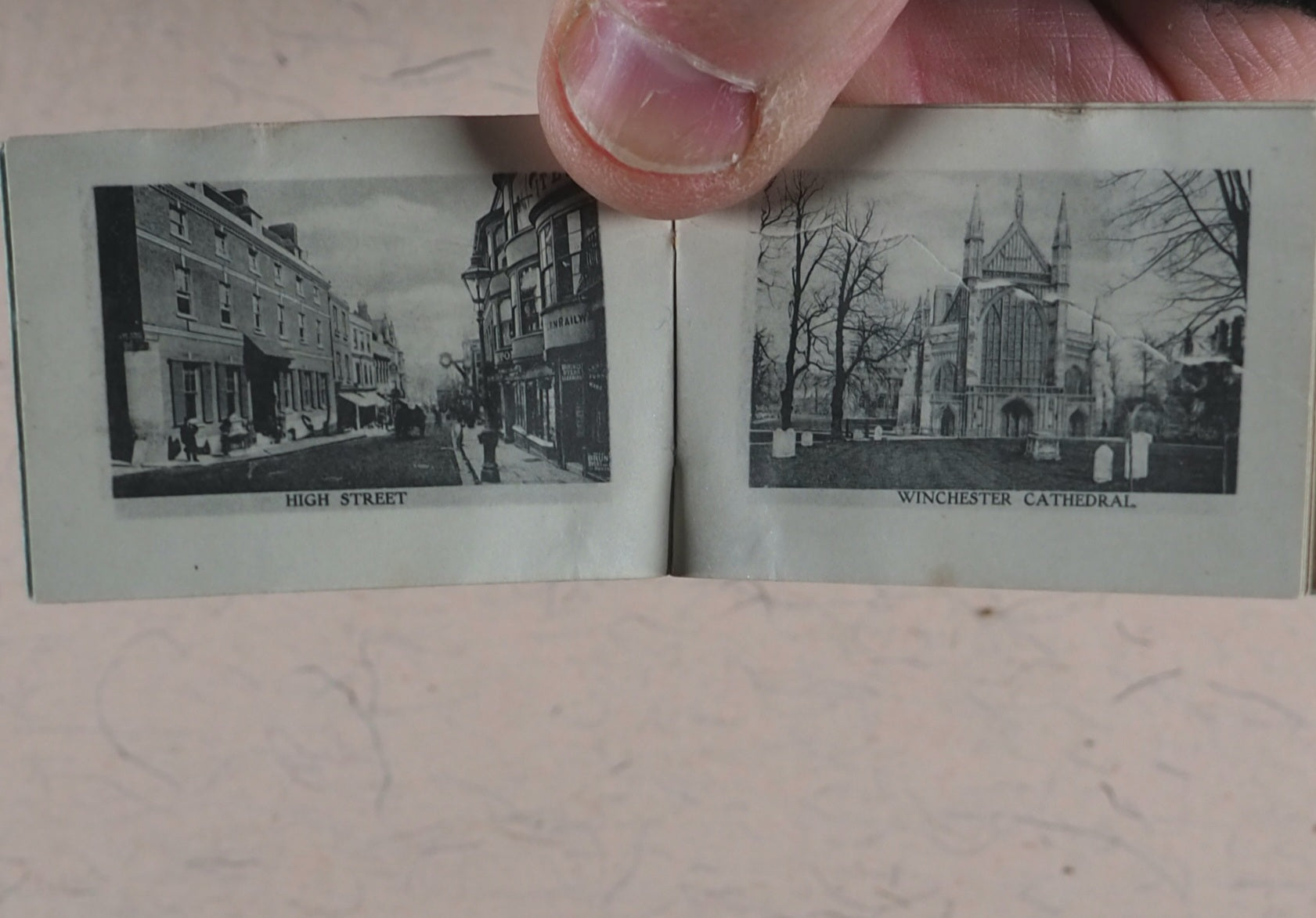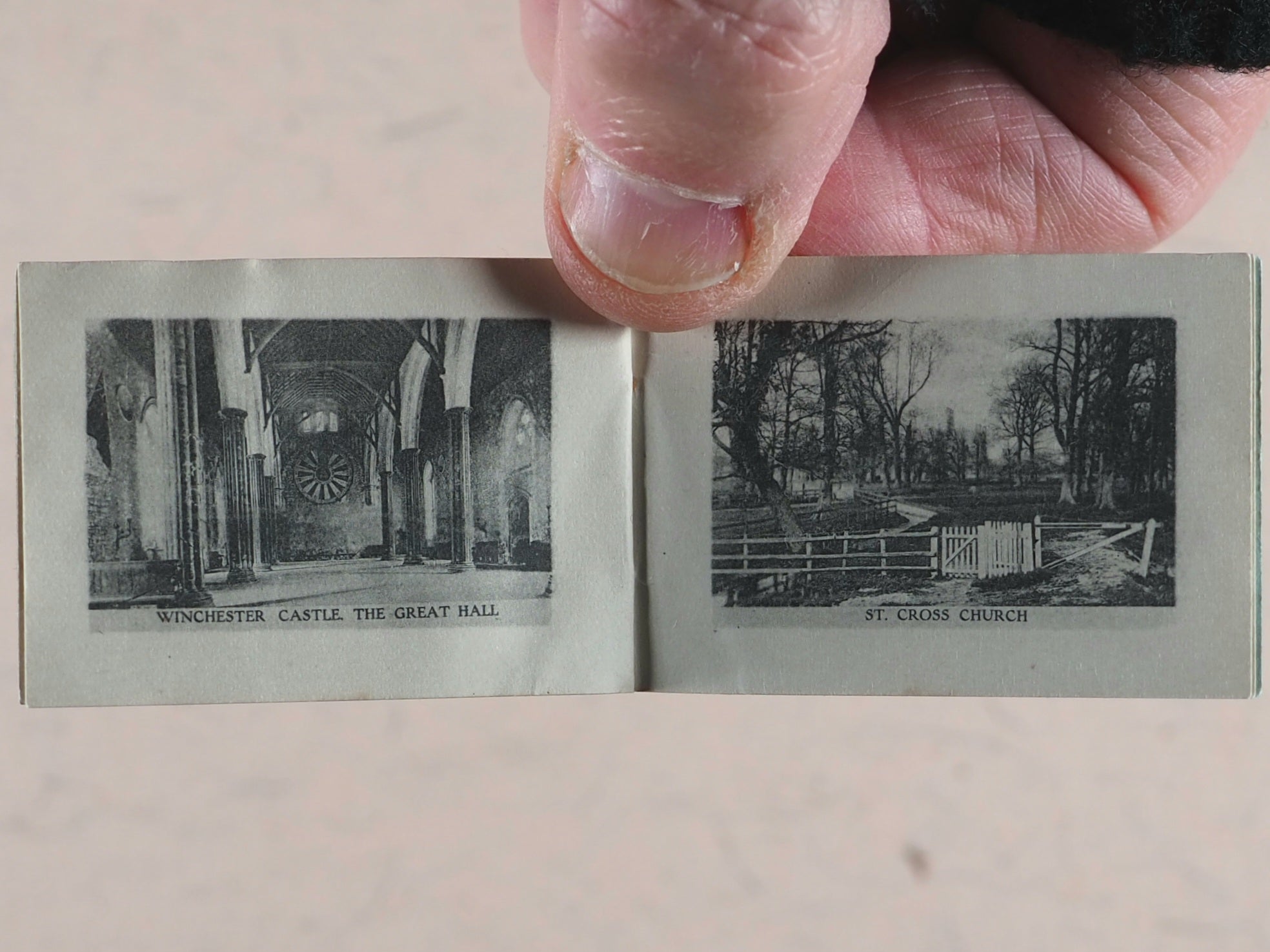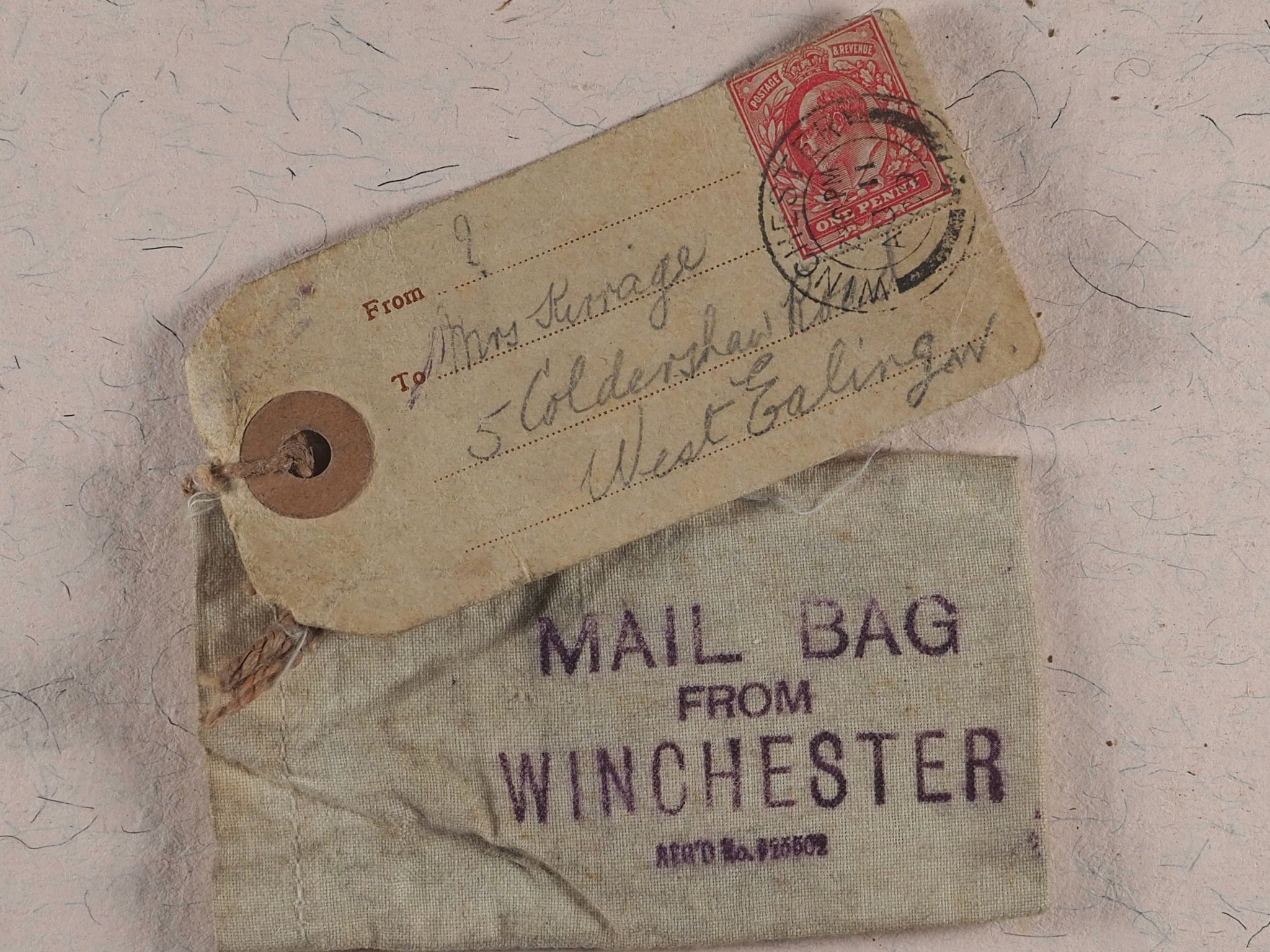 16 unnumbered pages of full-page black & white photographic illustrations of Winchester. No text. Staple bound in orignal light blue printed card wrappers. Complete with original heavy cream cotton bag, stamped in purple ink "MAIL BAG FROM WINCHESTER" with a registration number and attached by twine to the contemporary luggage stamped label that has been addressed and franked -Mrs. Kirrage, 5 Coldershaw Road, W. Ealing. August 11th, 1909. Rare survivor. 38 x 52 mm. Original blue card. Staple bound. Staple slightly rusty. Not in Bondy, nor Spielmann, nor Welsh. No OCLC number available. WorldCat locates zero copies worldwide.