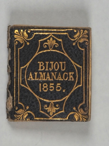 64 pages. Engraved frontispiece and title vignette, twelve finely engraved monthly vignettes consisting of pastimes and activities. Engraved throughout on verso only. Compares favourably with earlier Schloss almanacs. All edges gilt. Original cream endpapers. No inscriptions. 25 x 30 mm. Publisher's black morocco (limp), gilt stamped "bijou Almanac 1855" within decorative gilt tulip frame and border, on front cover. Spine worn and largely missing. Bondy, 44. Not in Spielmann. Welsh, 1263. OCLC, 1122791366. WorldCat locates one single copy worldwide (University Library of Virginia). The Bijou Almanac for 1855, published by Rock Brothers & Co. in London in 1854, was not just for checking the date; it was a fashionable accessory for ladies and a popular gift - a prime example of mid-Victorian miniature book publishing,they were collectively often referred to as "Victorian Kindles" due to their portability and curated content. While earlier, more famous versions were published by Albert Schloss (1836–1843), Rock Brothers & Payne continued this tradition of producing exceptionally small, engraved, and decorative almanacs for the handbag or waist pocket.
