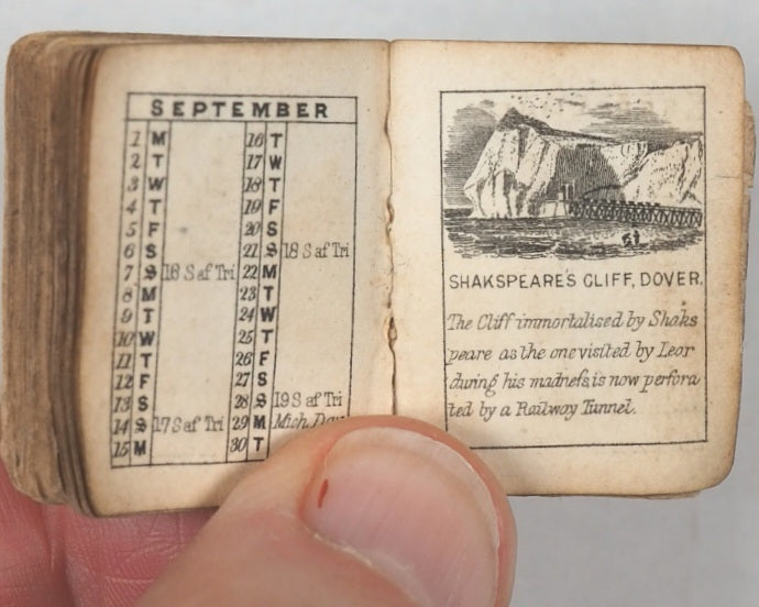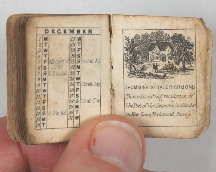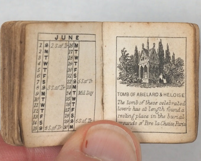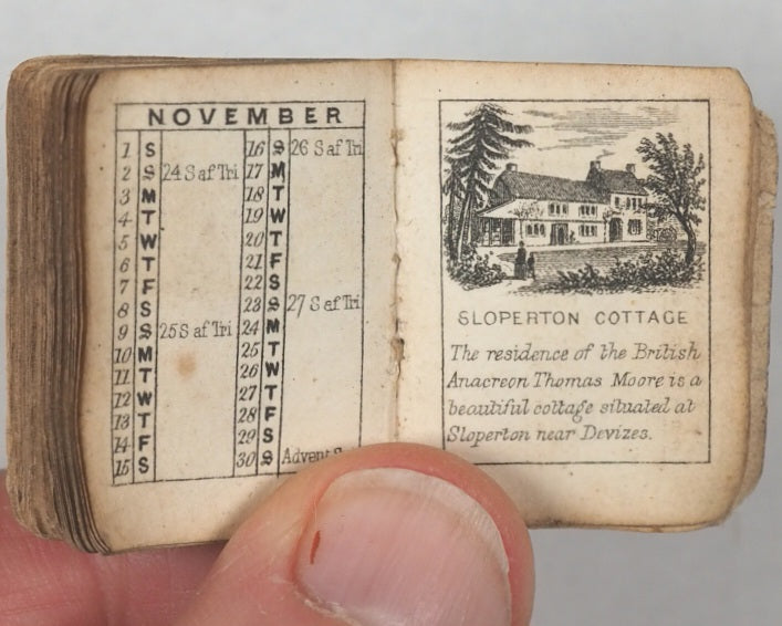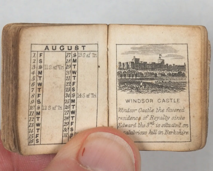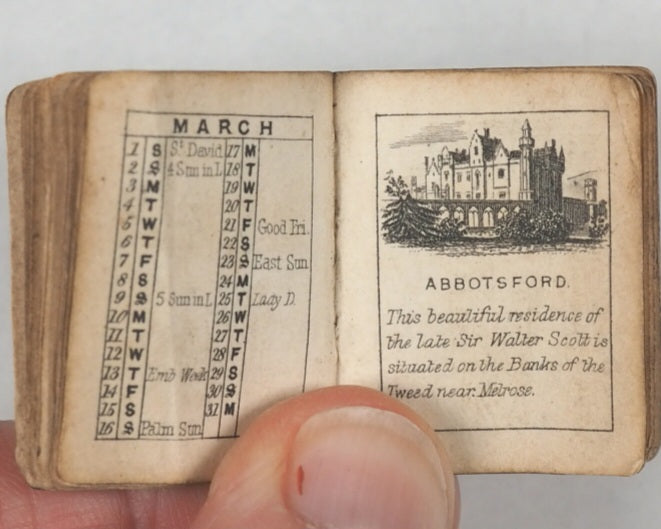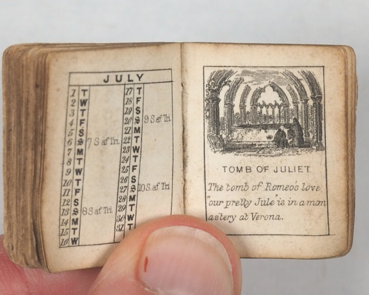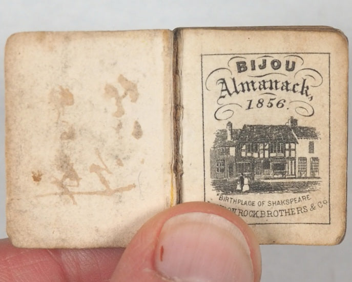 64 unnumbered pages. Engraved title vignette, twelve finely engraved monthly vignettes consisting ofKenilworth Castle, Newstead, Abbotsford, Shakespeare's Room in Stratford-upon-Avon, Bridge of Sighs in Venice, Tomb of Abelard and Heloise, Tomb of Juliet, Windsor Castle, Shakespeare's Cliff in Dover, Magna Charta Island, Gloperton cottage, and Thomson's cottage. Engraved throughout on verso only. Some leaves with mild creases and some age-toning. All edges gilt. Original yellow endpapers. Feint and illegible contemporary inscriptions mainly in pencil. 25 x 30 mm. Publisher's black limp morocco, gilt stamped "BIJOU ALMANACK 1856" within decorative gilt tulip frame and border, on front cover. Somewhat rubbed overall. Lower cover creased and missing upper corner tip. Bondy, 44. Not in Spielmann. Welsh, 1264. WorldCat locates no copies worldwide. Compares favourably with earlier Schloss almanacs. 1856 marks the end of the prime period for these specifically titled "Bijou" almanacs (1845–1856) produced by the Rock Brothers and Payne partnership. Spielmann noted the "miracle of fine and delicate engraving, done consistently and beautifully to an almost unbelievably tiny scale". While all the years in this series of almanacs are uncommon, this particular edition appears to be exceedingly scarce.