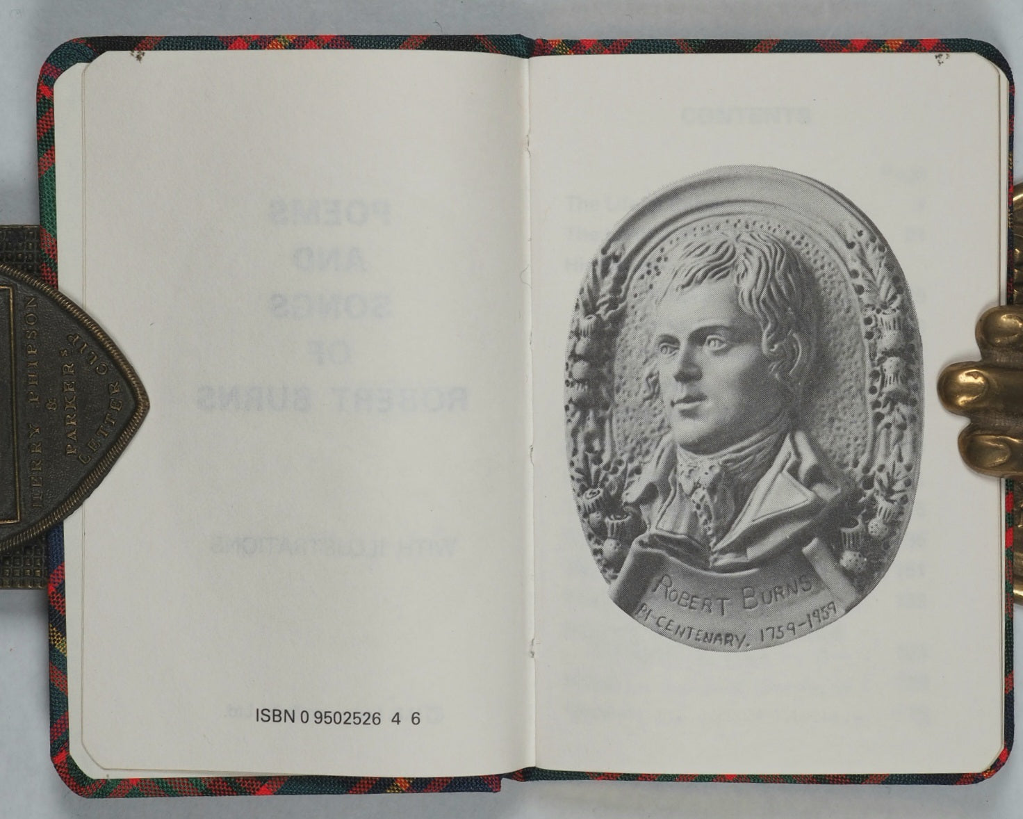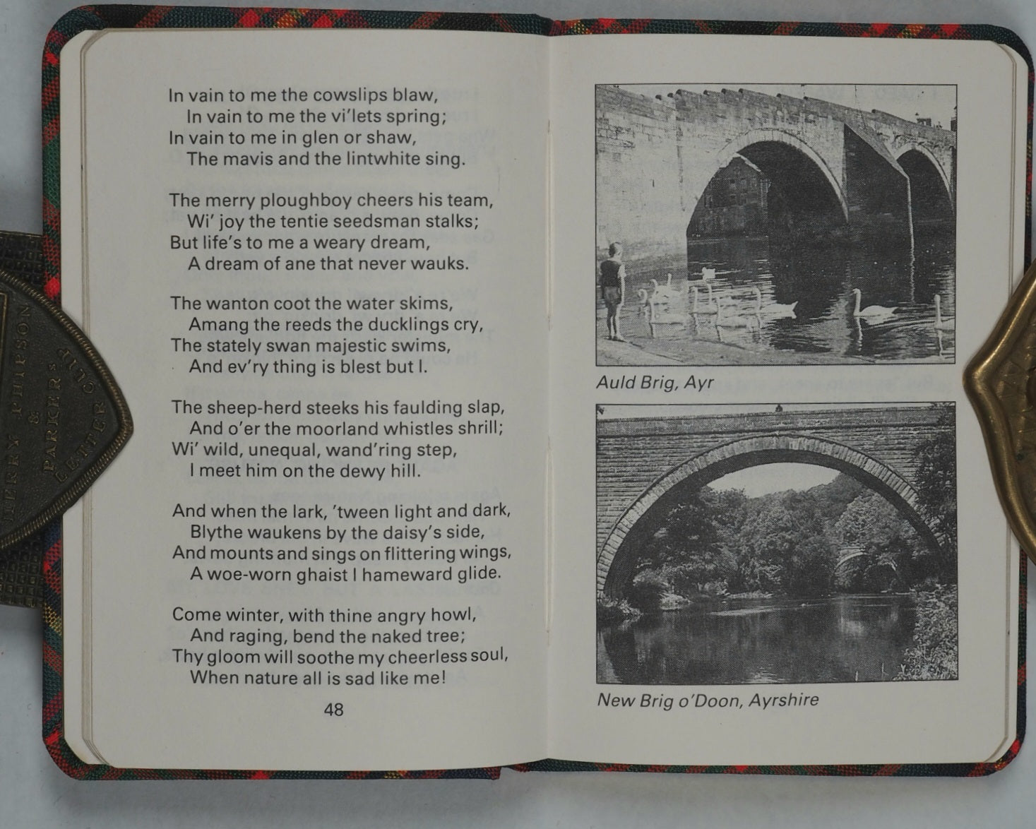 192 pages. Numerous black and white full-page photographic illustrations. Very clear type in English. Rounded corners. All edges gilt. It is four and a quarter inches tall by two and three-quarter inches wide. It is bound in a MacPherson Clan tartan cloth.
