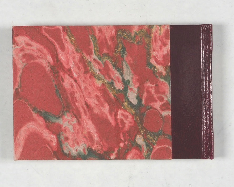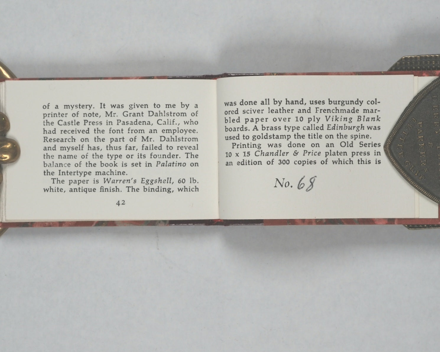 43 pages. 7 full-page illustrations in green by Pall W. Bohne. Letterpress on Warren's Eggshell antique white paper. Printing was done on an Old Series 10 x 15 Chandler & Price platen press. Number 68 of 300 hand-numbered copies. 65 x 45 mm. Original burgundy leather spine with gilt blocked lettering. French marbled paper-covered boards. Bradbury, 29. OCLC, 12590985. WorldCat records eleven copies worldwide. This is the third of four titles that Bohne published , all miniature books under the Bookhaven Press imprint, previous to which he had been a bookbinder. 60 125 #