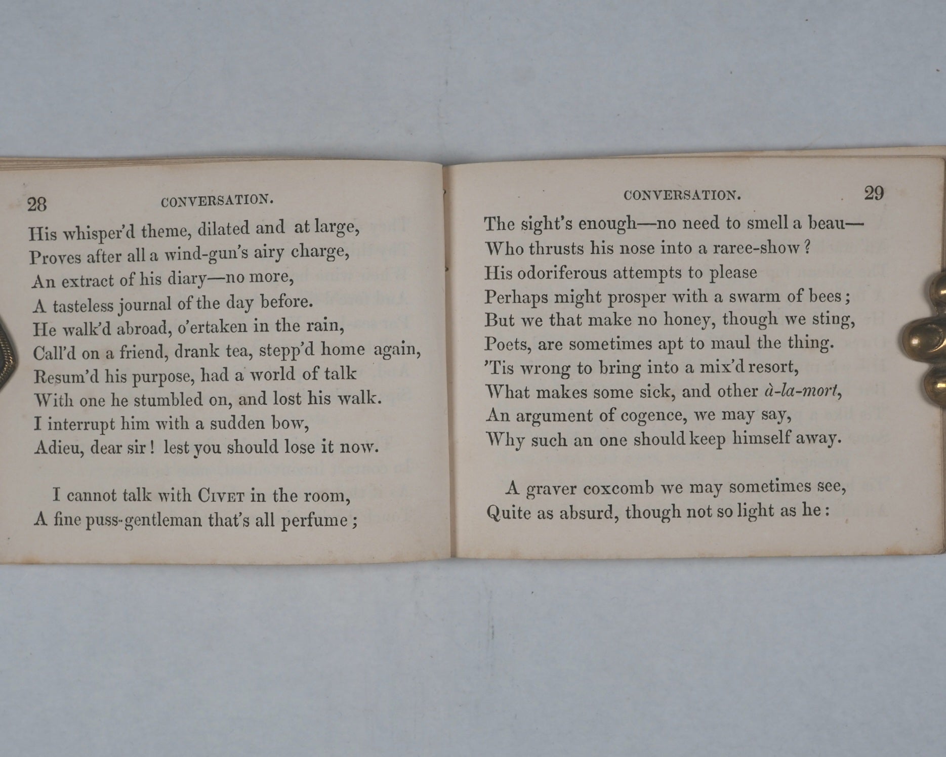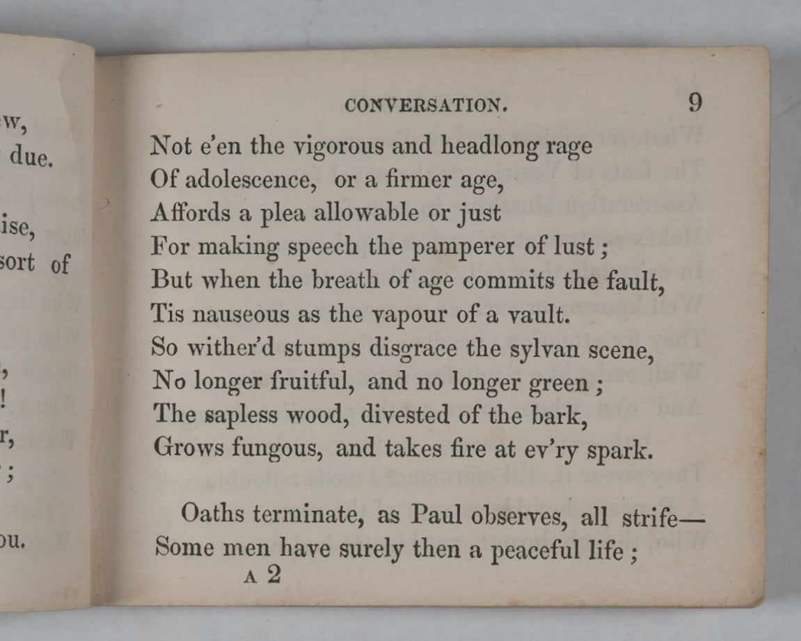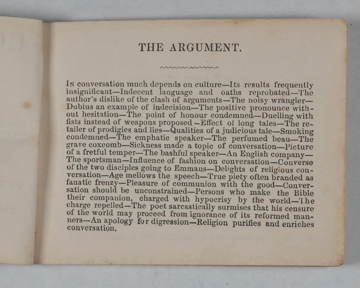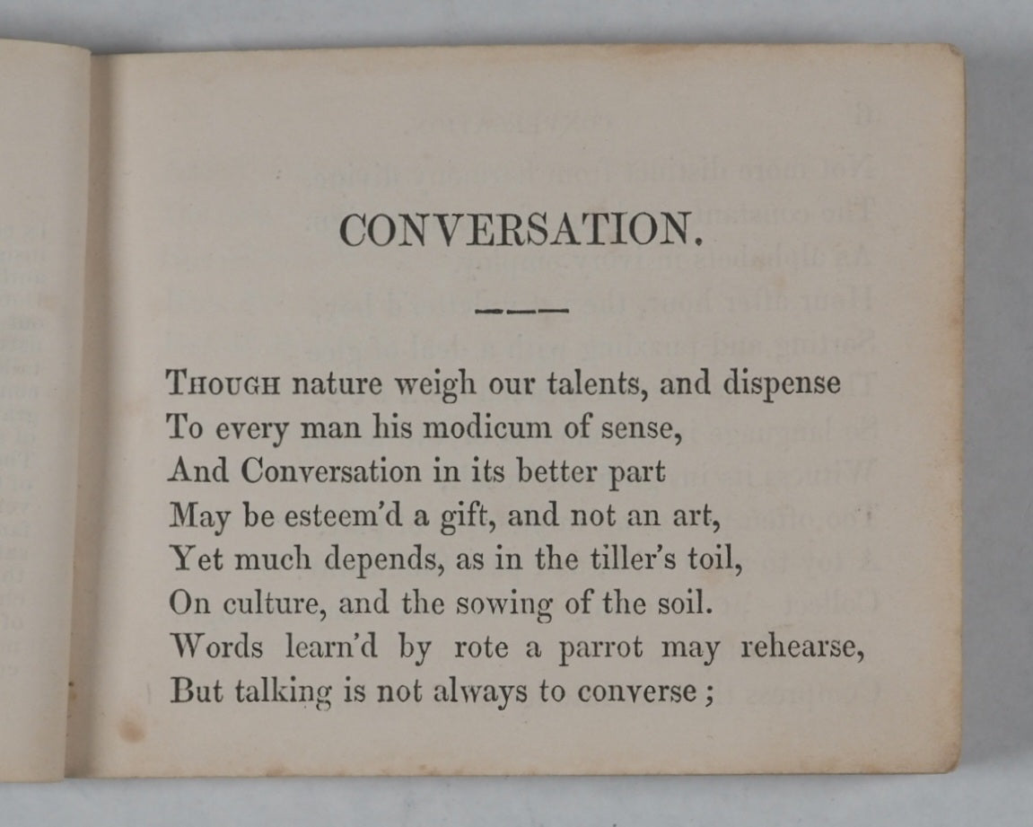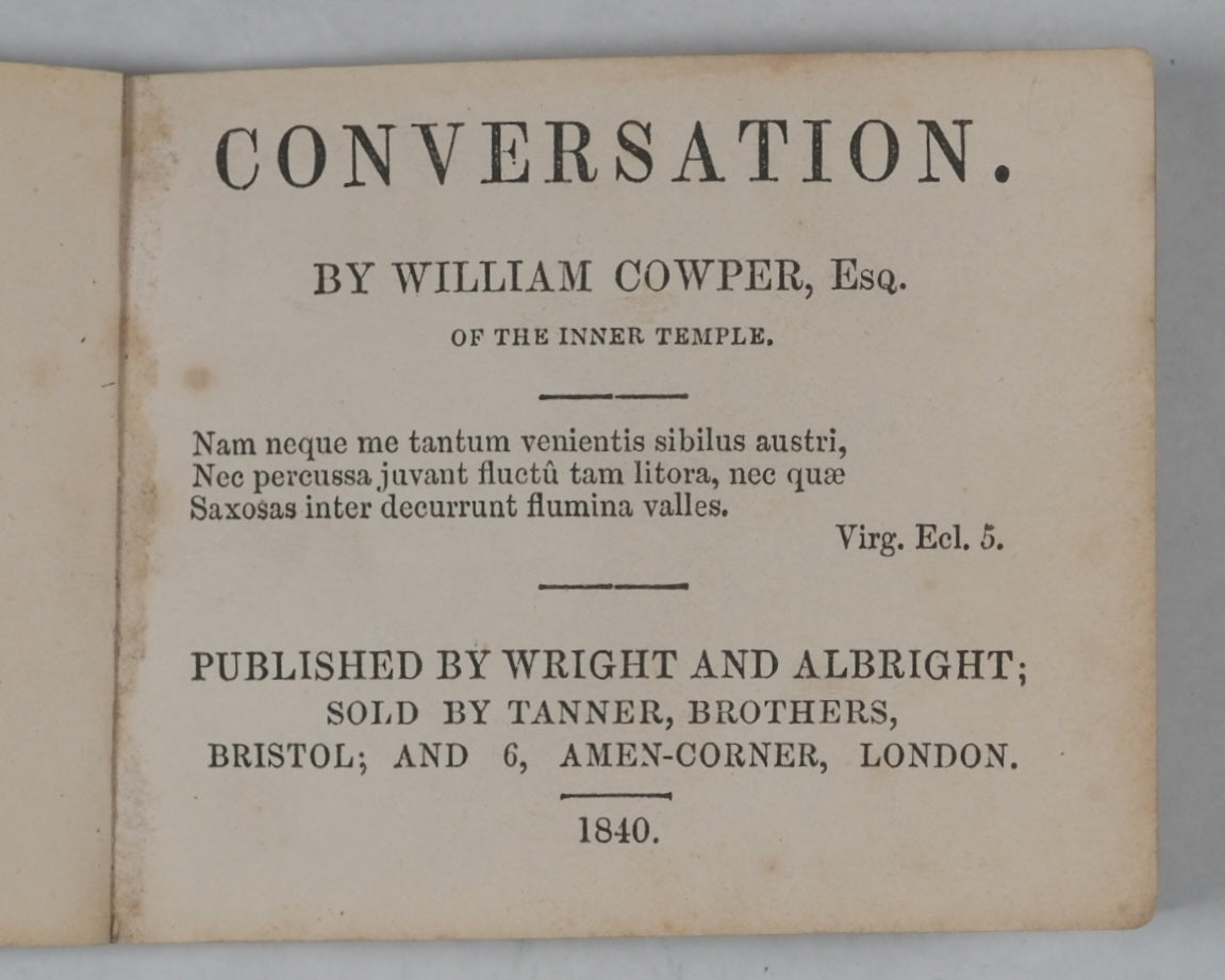 80 pages. Printed at John Wright's Steam Press, Bristol. Original yellow endpapers. "Contemporary ink ownership inscription on front free endpaper, dated 1845. Provenance: Mary Anna Palmer Bruce (b. 1835), who married Rev. Charles Harwick Marriott, son of Ann Marriott; (b. 1815), on 12th July 1860, and resided at 4 Morden Road, Blackheath, London. 86 x 67 mm. Original green embossed cloth, floral in design. Hinges and spine slightly rubbed. Not in Bondy, nor Spielmann, nor Welsh. OCLC, 36063050. WorldCat records nine copies worldwide (Oxford, New Brunswick, Pennsylvania State, Cleveland, Chicago, Indiana, Illinois, Texas Woman's, and Brigham Young University Libraries). This text is one of Cowper's most famous moral satires, originally published in 1782. Cowper wrote this while living in relative seclusion in Olney, observing the world from his retreat. He used his poetry to critique the "sullen and uncommunicative disposition" he saw in the English nation compared to the more loquacious French. It explores the ethics and etiquette of speech, blending wit with serious religious and social reflection. This particular small-format edition was intended for wide, affordable distribution and shows how Cowper’s work was repackaged for the 19th-century middle class who valued hismoral grounding.