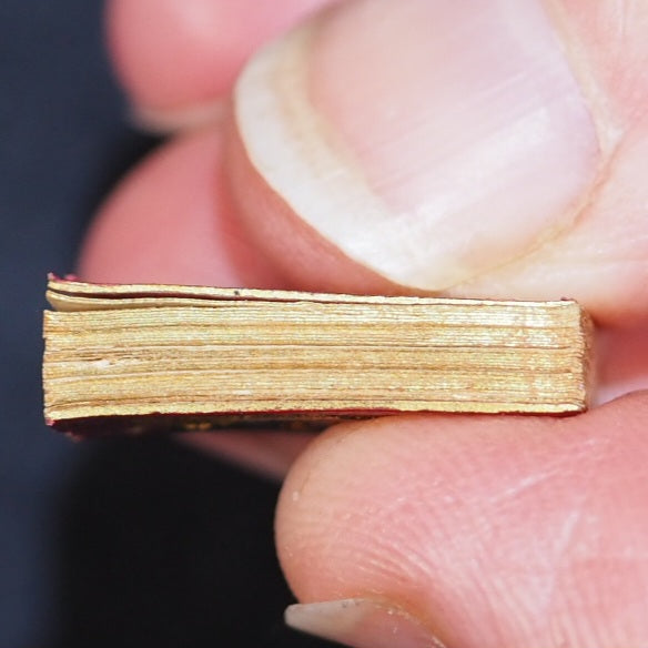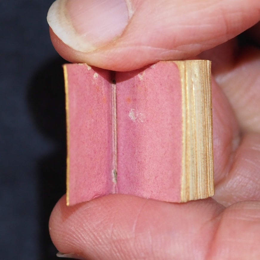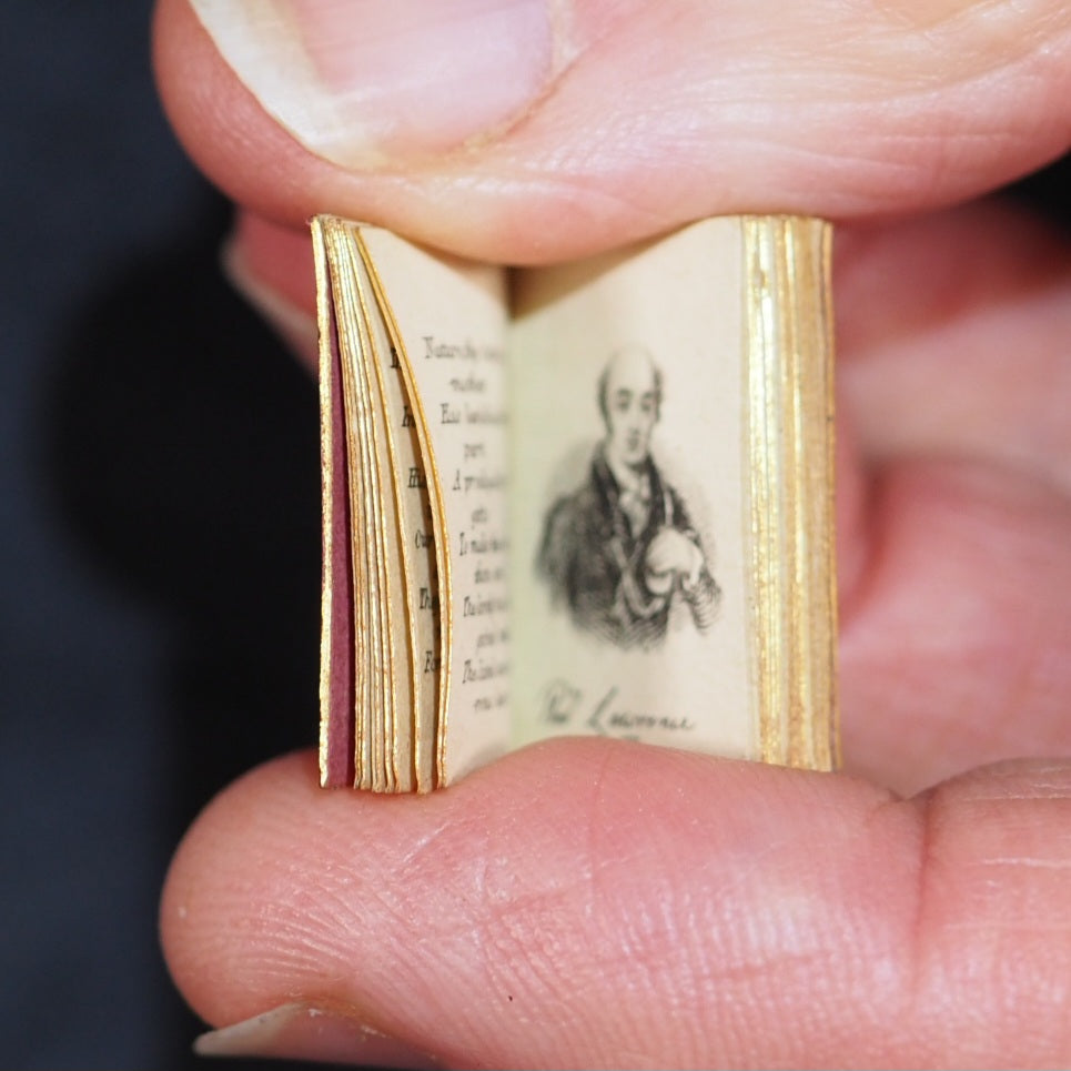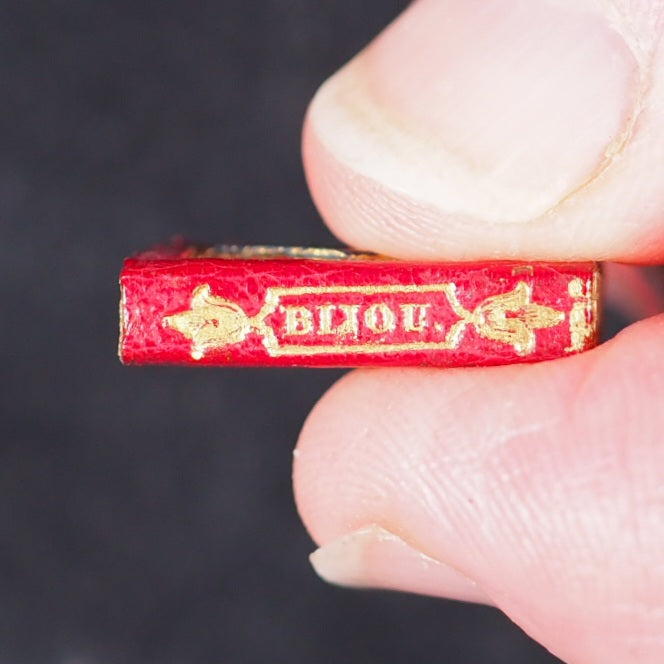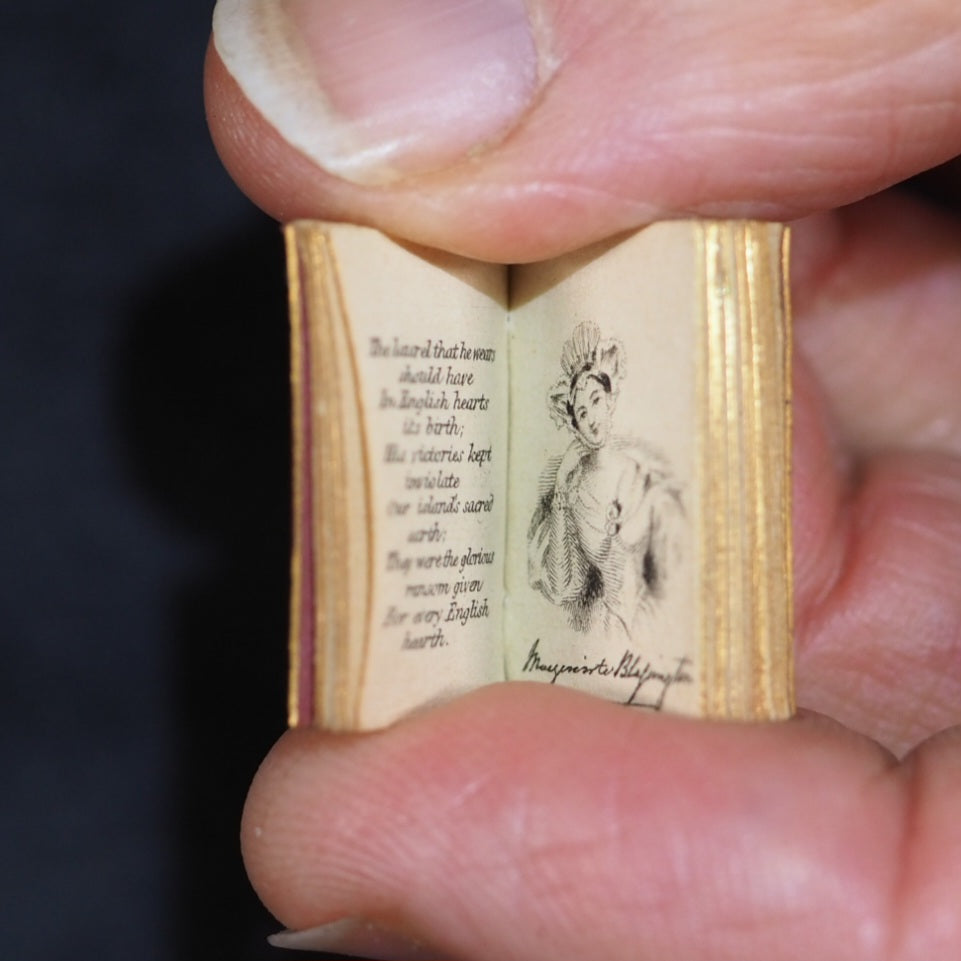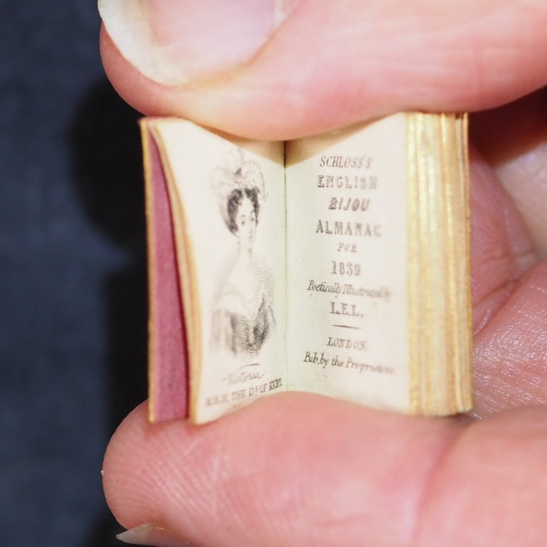 English Bijou Almanac for 1839. Poetically illustrated by L.E.L. Schloss, A. [London]. 1838. [53] printed pages. Portraits of Duke of Wellington, Lady Blessington, Sir Thomas Lawrence, Beethoven & Giuditta Pasta, soprano. Contains dedicated laudatory poems by Letitia Elizabeth Landon, a historical calendar and information on royal and noble families. Engraved entirely with the burin (but not signed) by Benjamin Rees Davies on a single steel plate measuring about 223 x 147 mm; Davies engraved all the vertical parallel strokes throughout a line before turning the plate to complete the horizontal and joining curves of the letters. The type is less than 3-point and probably printed by McQueen. Each steel plate took at least 13 weeks of unremitting labour. All edges gilt. Original salmon endpapers. 13 x 20 mm. Original red morocco with black diamond onlays within elaborate gilt decorative borders. Slightly rubbed. Joffe, 43. Spielmann, 447. Welsh, 2658. OCLC, 15214467. WorldCat locates 6 copies worldwide. 68 firsts2024