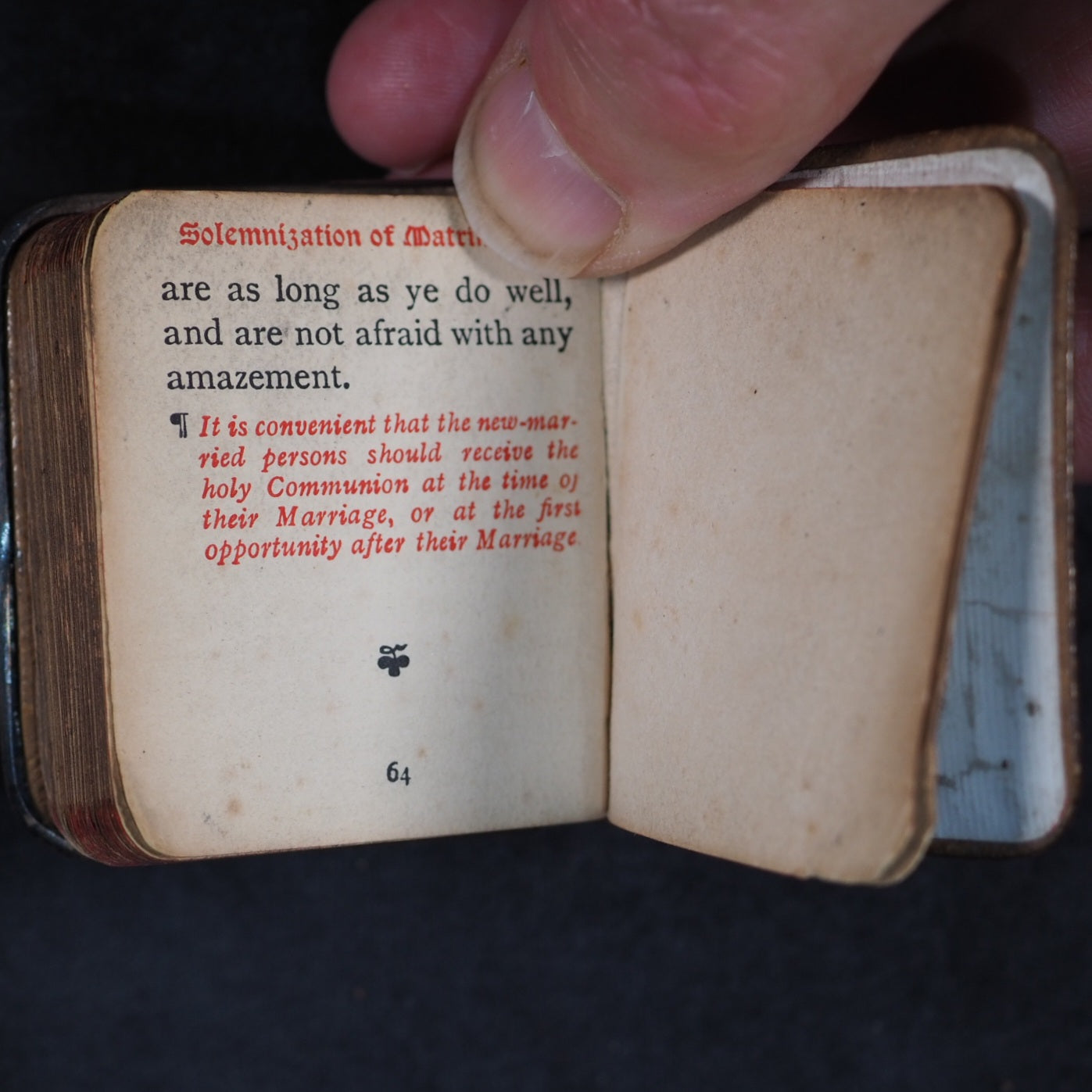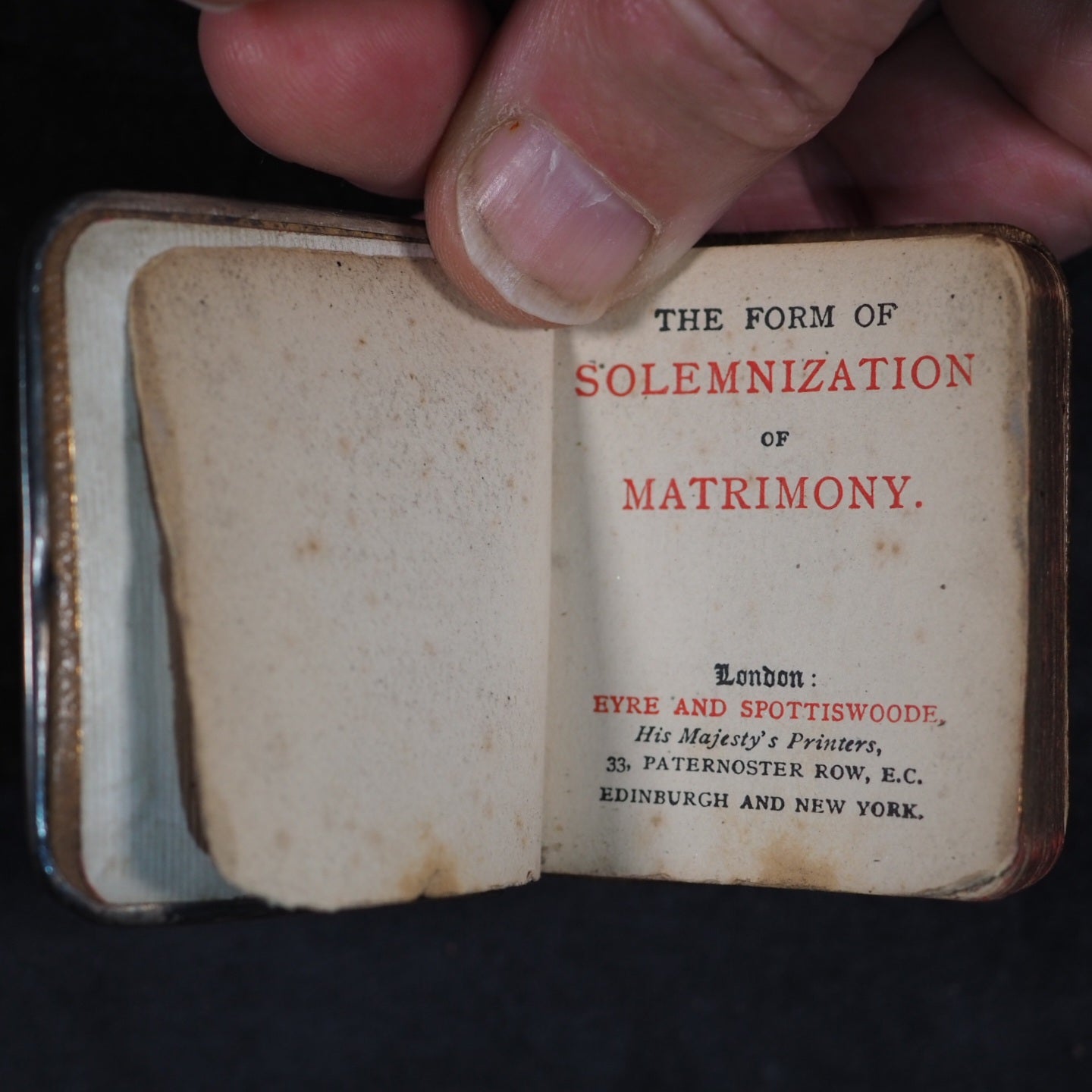 Form Of Solemnization Of Matrimony. Eyre & Spottiswoode. His Majesty's Printers. 33, Paternoster Row. E.C. London, Edinburgh and New York. Circa 1900. 64 pages printed in red and black. Rounded corners. Original white ribbed endpapers (Lacks front free endpaper). All edges gilt over red. Contemporary silver plaquette embossed with stylised Reynolds Angels. Fully hallmarked for London, 1903 by William Comyns and Son. Original tan morocco with gilt titling down the spine (very slight wear). This Church of England miniature book is a far less common text than the Common Prayer or Hymns Ancient and Modern. Welsh, 2859. 146 Firsts2024