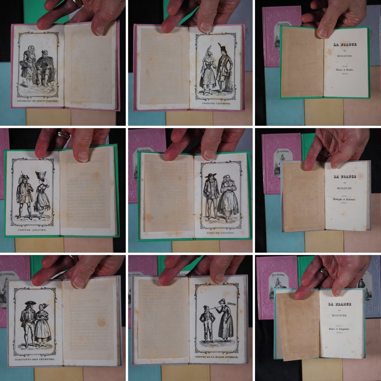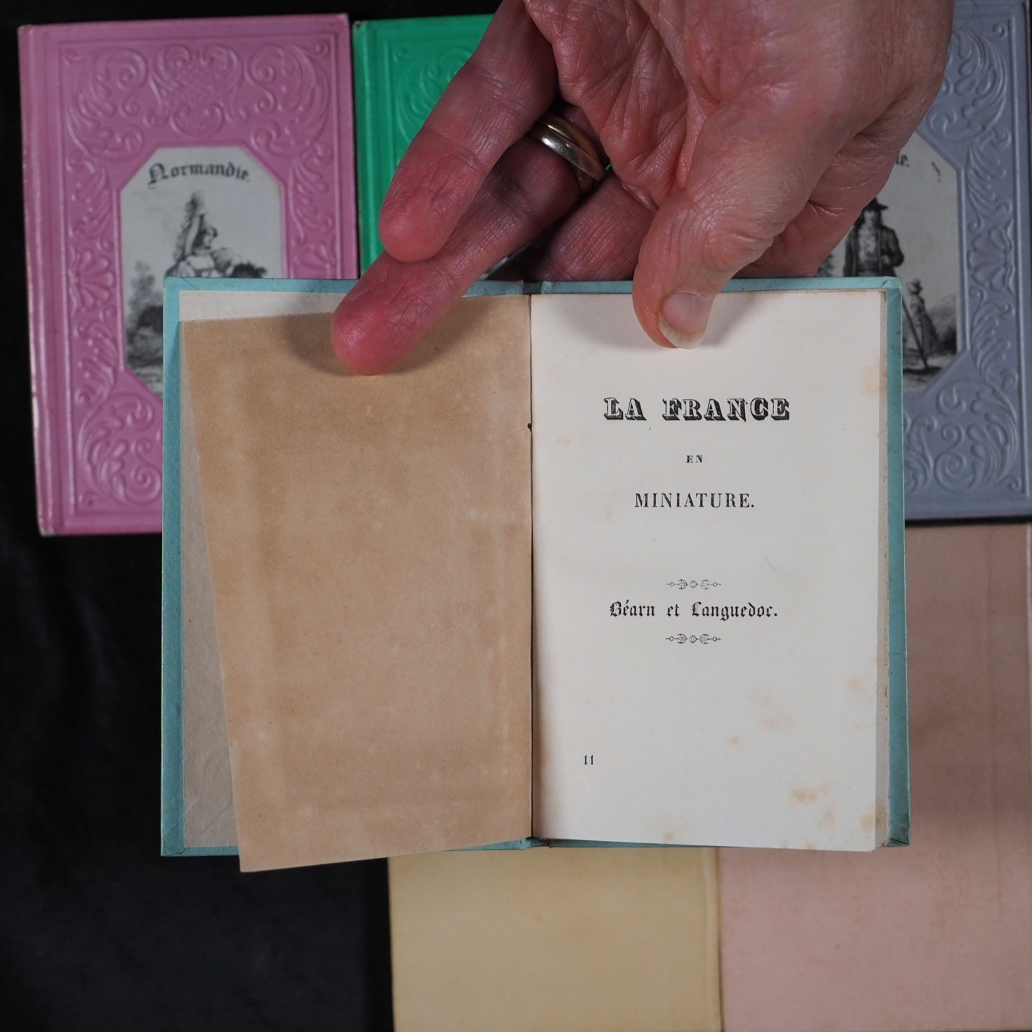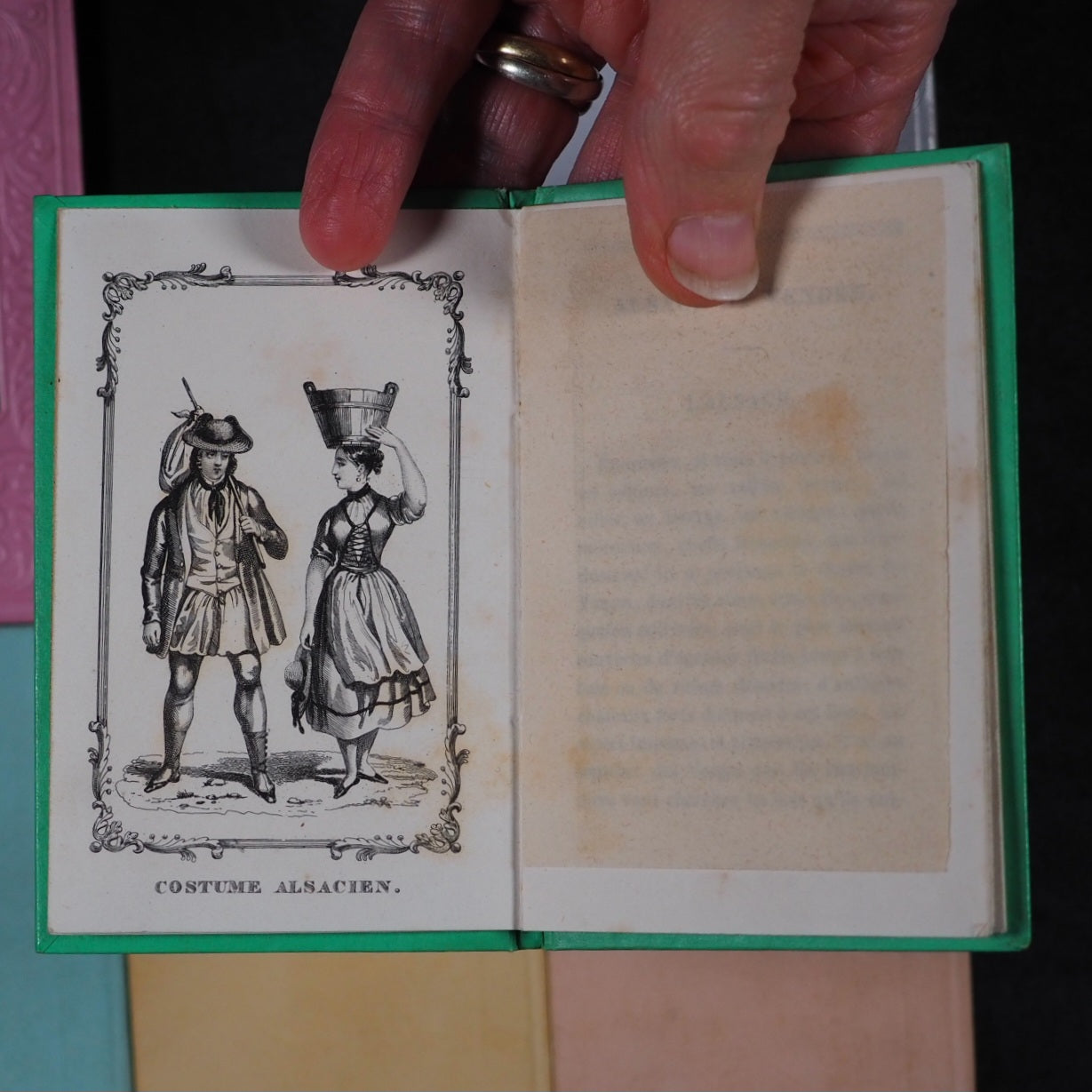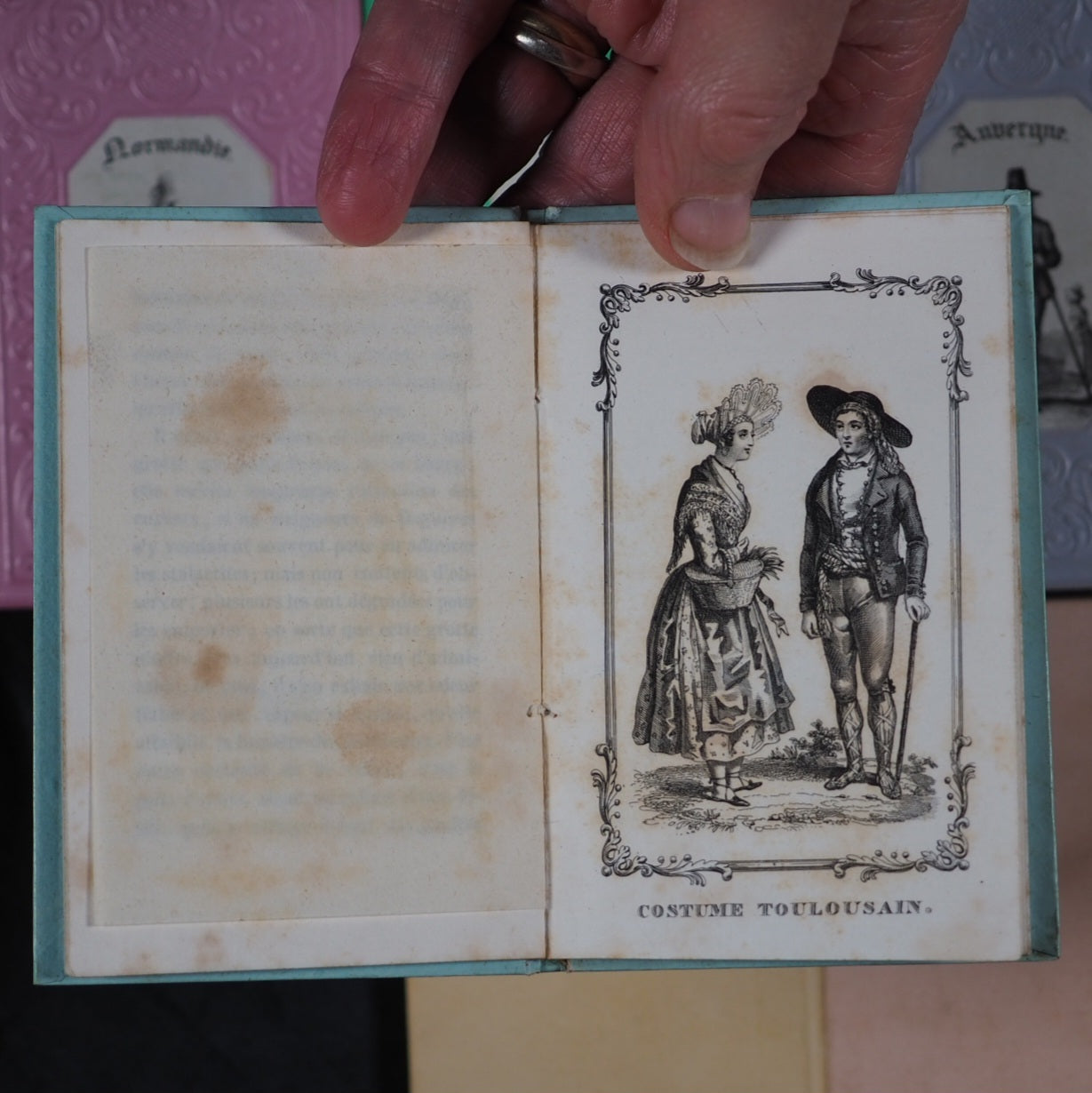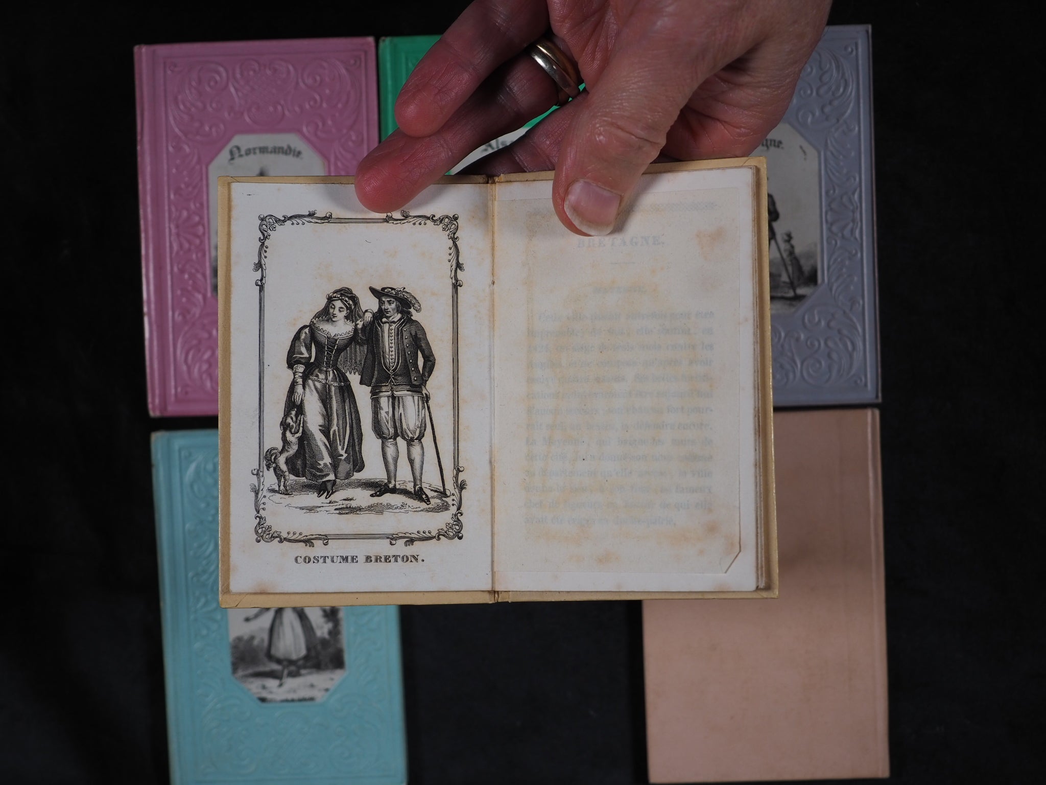 France en Miniature, La. Marcilly, aîné rue Saint Jacques, 10. [Paris]. 1825. "Circa 1825. Printed surface 56 x 96mm. Imprimerie de Rignoux. Six volumes in French in original cartonnage slipcase with costume engraving within elaborate giltborders and cornerpieces and beneath blue printed title. V.1: Normandie v. 2: Alsace et Vendée v. 3: Bretagne v. 4: Auvergne et Cévennes v. 5: Gascogne v. 6: Béarn et Languedoc. Each volume with 32 printed pages and with a vignette engraving pasted onto upper covers. 12 finely engraved regional costume plates. A box containing 6 miniature books. Each volume has 31 pp. and 2 lithographs in colours. The box is composed of a finely decorated and gilt lid bearing an engraved coloured vignette in the center representing a regional costume. This boxed assemblage comprises six thin volumes in embossed cartonnage bindings covered in papier porcelaine, with hand-colored engraved illustrations. Each covering is in a pastel color: rose pink Paris, pale blue St. Petersburg, tan Vienna, lime green Rome, violet Berlin, and buff Constantinople. Each volume is bound in cased boards decorated on the front cover with gilt ornaments and a mounted engraved vignette in colours in the center depicting a woman in traditional costume. Original box. Dimensions of the box: 194 x 139 mm. Dimensions of the volumes: 118 x 77 mm. Superb box containing 6 miniature books dedicated to the several French regions and to their traditional costumes.The 6 volumes describe Normandy, Béarn, Auvergne, Gascony, Brittany and Alsace. Each volume is illustrated with 3 lithographs depicting the traditional costumes of the regions described, one on the front cover of the volume, the other 2 inside the volume. An uncommon example of a precious box complete with its 6 (near) miniature books, in very good condition. 75 x 116 mm. Original harlequin cartonnage. Gumuchian, 2613. OCLC, 1412212345. WorldCat locates 5 copies worldwide. 73 firsts2024