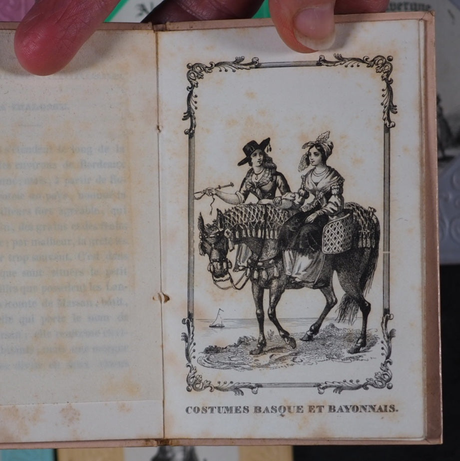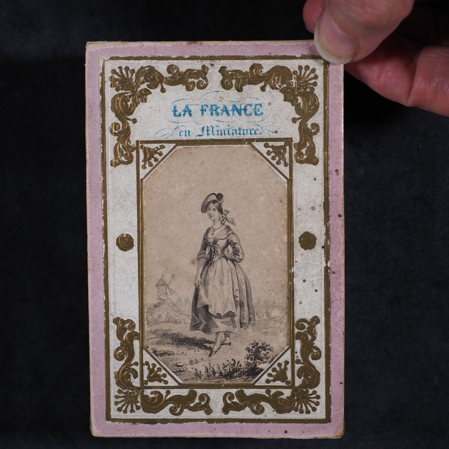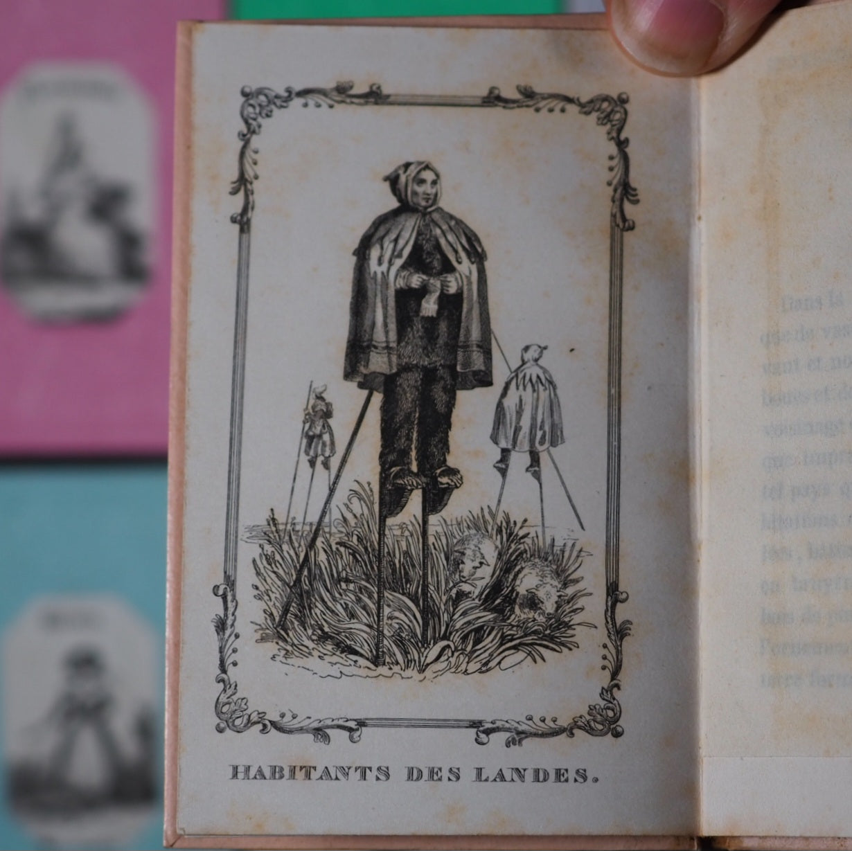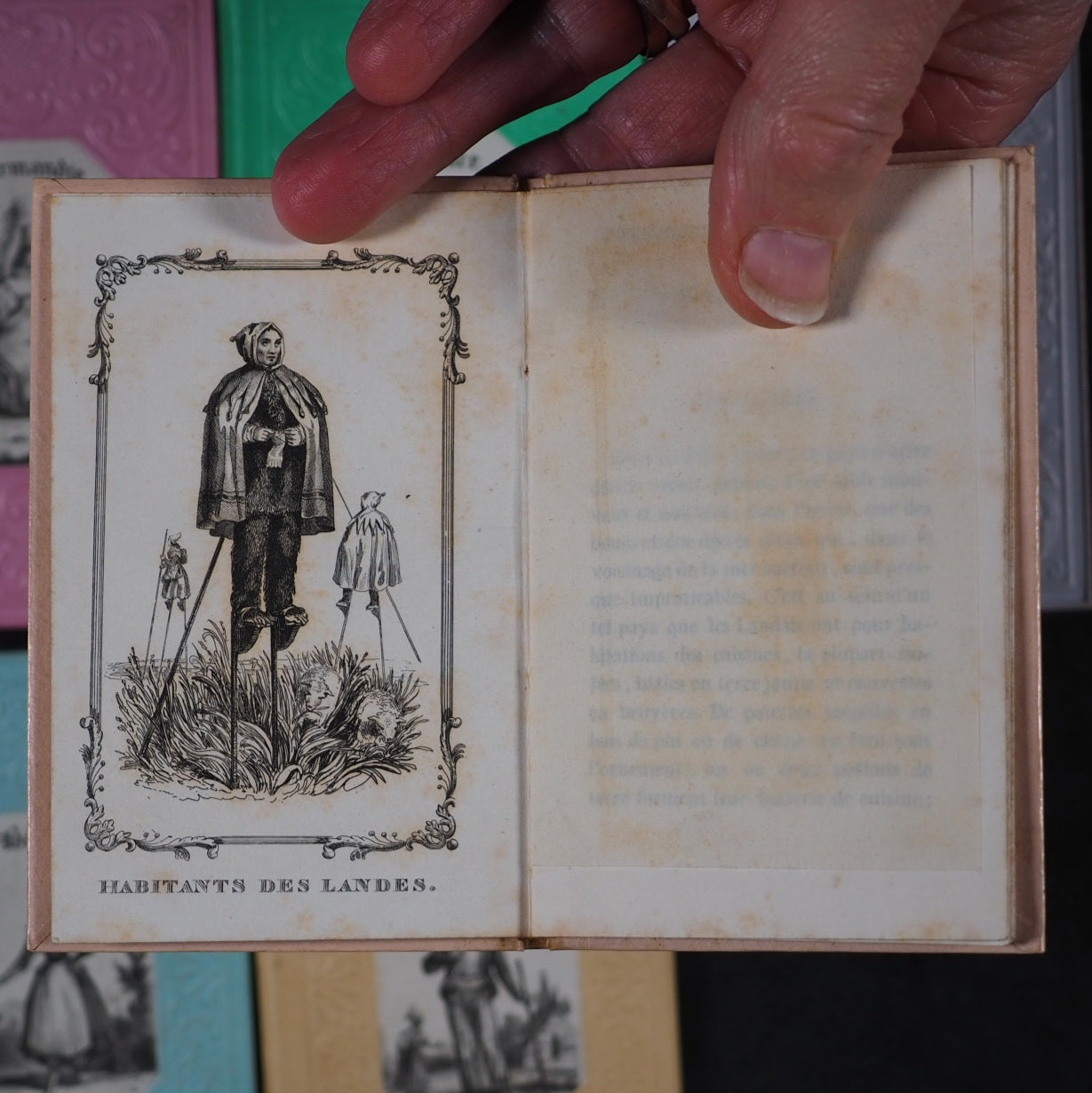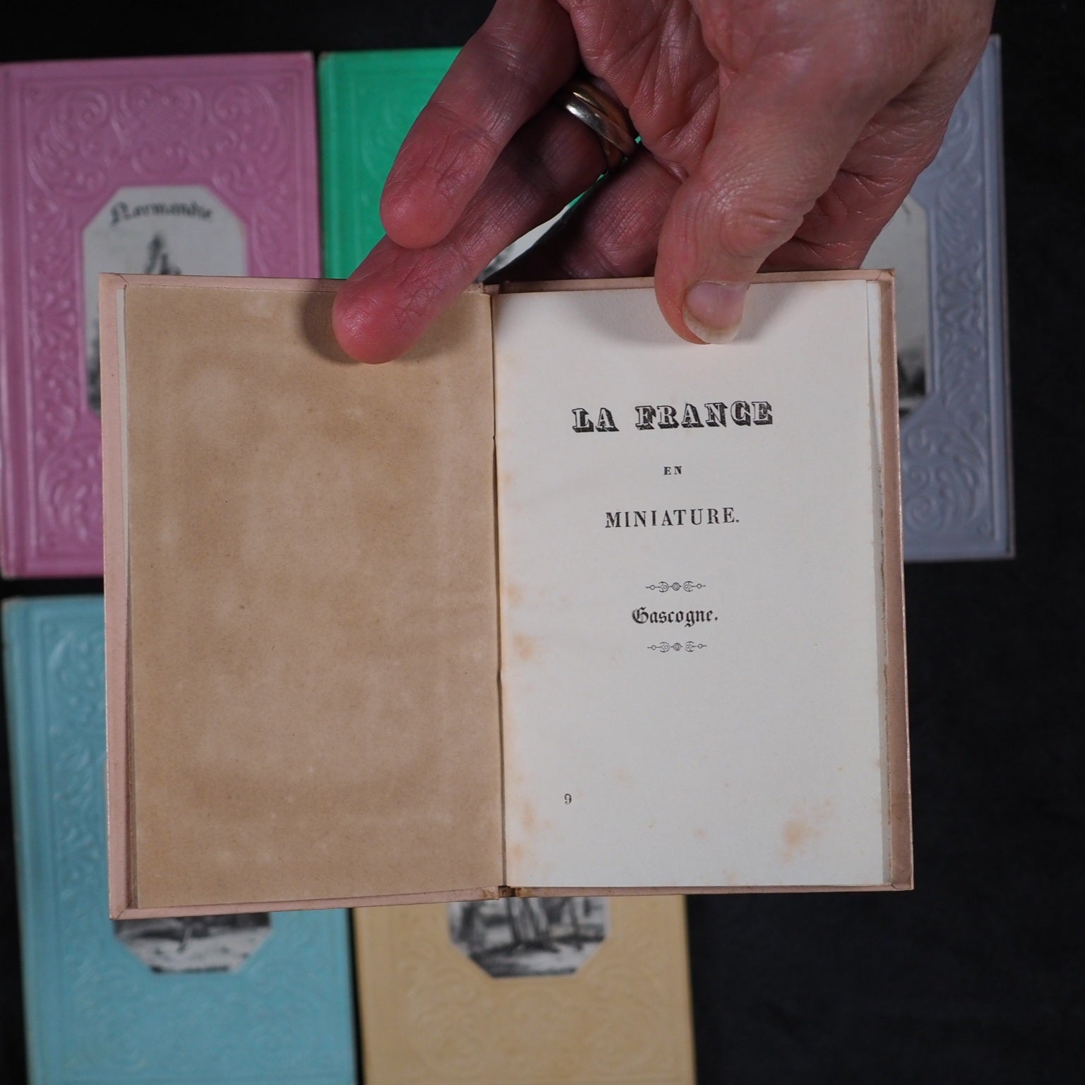 France en Miniature, La. Marcilly, aîné rue Saint Jacques, 10. [Paris]. 1825. "Circa 1825. Printed surface 56 x 96mm. Imprimerie de Rignoux. Six volumes in French in original cartonnage slipcase with costume engraving within elaborate giltborders and cornerpieces and beneath blue printed title. V.1: Normandie v. 2: Alsace et Vendée v. 3: Bretagne v. 4: Auvergne et Cévennes v. 5: Gascogne v. 6: Béarn et Languedoc. Each volume with 32 printed pages and with a vignette engraving pasted onto upper covers. 12 finely engraved regional costume plates. A box containing 6 miniature books. Each volume has 31 pp. and 2 lithographs in colours. The box is composed of a finely decorated and gilt lid bearing an engraved coloured vignette in the center representing a regional costume. This boxed assemblage comprises six thin volumes in embossed cartonnage bindings covered in papier porcelaine, with hand-colored engraved illustrations. Each covering is in a pastel color: rose pink Paris, pale blue St. Petersburg, tan Vienna, lime green Rome, violet Berlin, and buff Constantinople. Each volume is bound in cased boards decorated on the front cover with gilt ornaments and a mounted engraved vignette in colours in the center depicting a woman in traditional costume. Original box. Dimensions of the box: 194 x 139 mm. Dimensions of the volumes: 118 x 77 mm. Superb box containing 6 miniature books dedicated to the several French regions and to their traditional costumes.The 6 volumes describe Normandy, Béarn, Auvergne, Gascony, Brittany and Alsace. Each volume is illustrated with 3 lithographs depicting the traditional costumes of the regions described, one on the front cover of the volume, the other 2 inside the volume. An uncommon example of a precious box complete with its 6 (near) miniature books, in very good condition. 75 x 116 mm. Original harlequin cartonnage. Gumuchian, 2613. OCLC, 1412212345. WorldCat locates 5 copies worldwide. 73 firsts2024