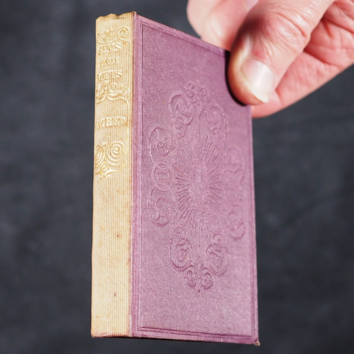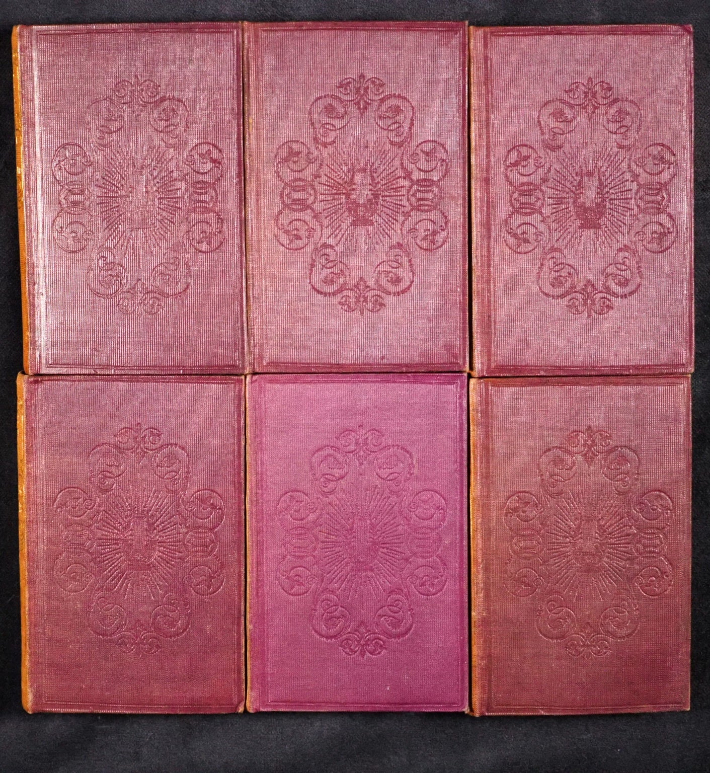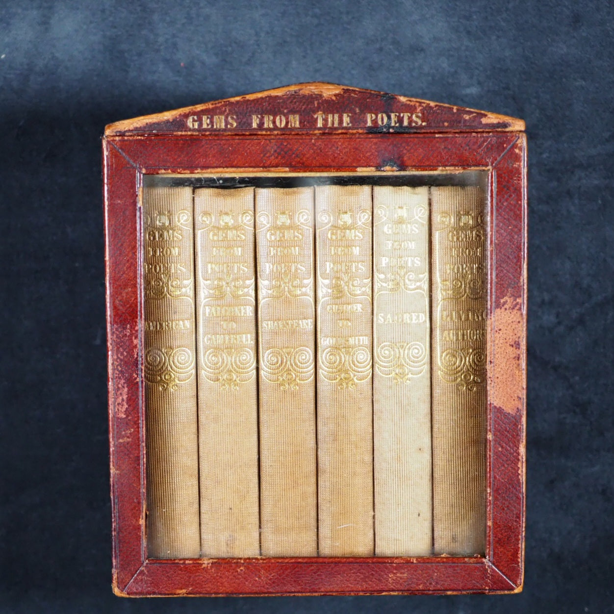 Gems from the Poets. Tyas, Robert. 50 Cheapside : H.T. Warren, 8, Finsbury, London. 1840-1. Complete 6 volume set in original bookcase. Gems from British Poets, Sacred 3rd edition; Gems from British Poets, Falconer to Campbel 2nd edition; Gems from British Poets, Chaucer to Goldsmith 3rd edition; Gems from Shakespeare 5th thousand; Gems from the American Poets 6th edition; Gems from British Poets, Living Authors Chiefly. Engraved frontispieces. Printed by Bradbury & Evans, Whitefriars, London. All edges gilt. Original pale yellow endpapaers. Mixed editions. 64 x 102 mm. Original plum publisher's cloth with gilt titling on spines and blind embossed decorative covers. Complete with publisher's morocco fronted bookcase, glazed door and check red, green and cream patterned paper interior with "Gems from the Poets" in gilt on lintel. Leather hinge sympathetically repaired; corners and edges worn. 150 x 117 x 82 mm. Joffe, 184. OCLC, 932881620, 34060088, 932880549, 78247230, 79079551, 932881615. WorldCat locates generally single didgit numbers of individual titles but no copies of complete sets worldwide. 155 firsts2024