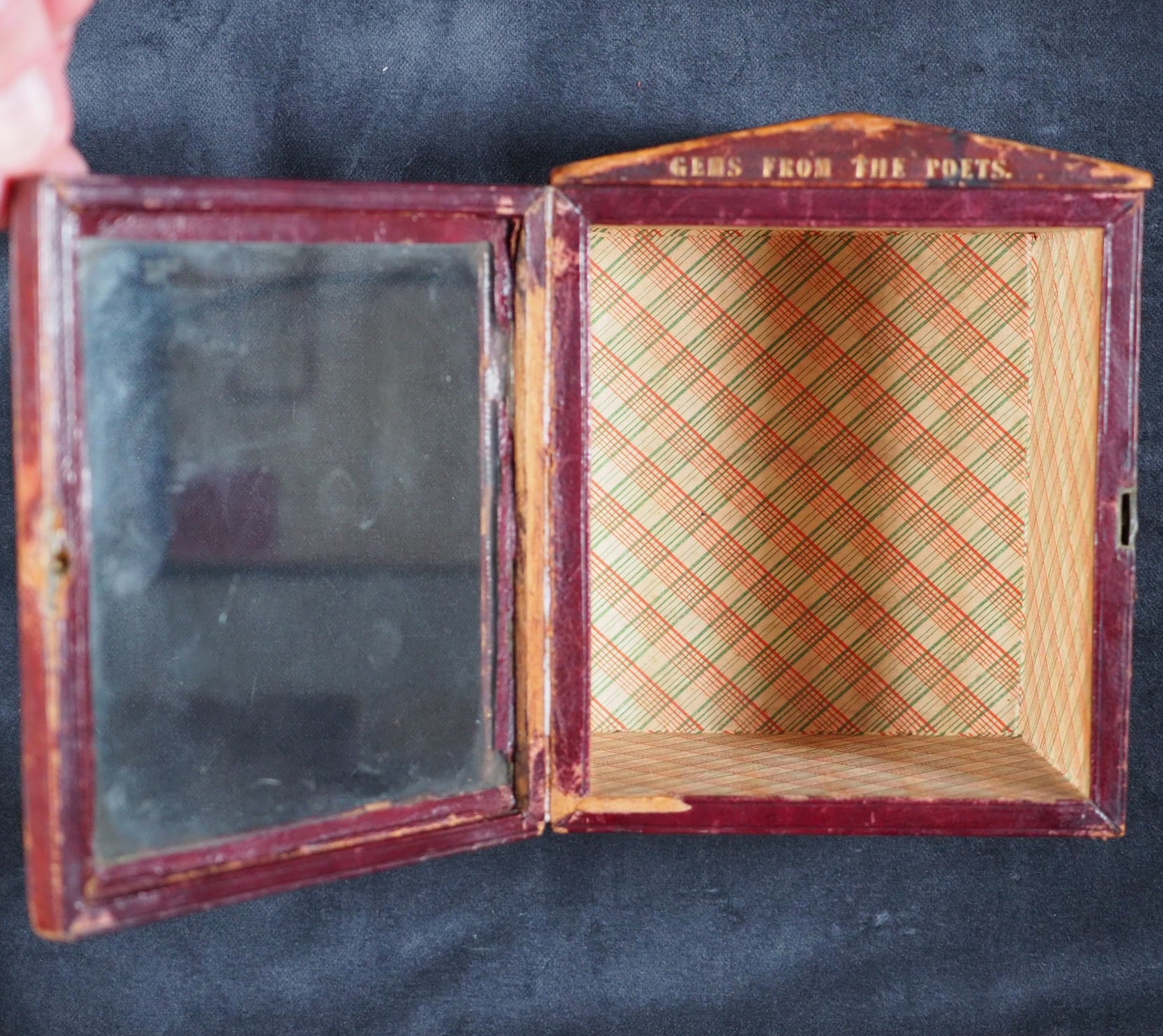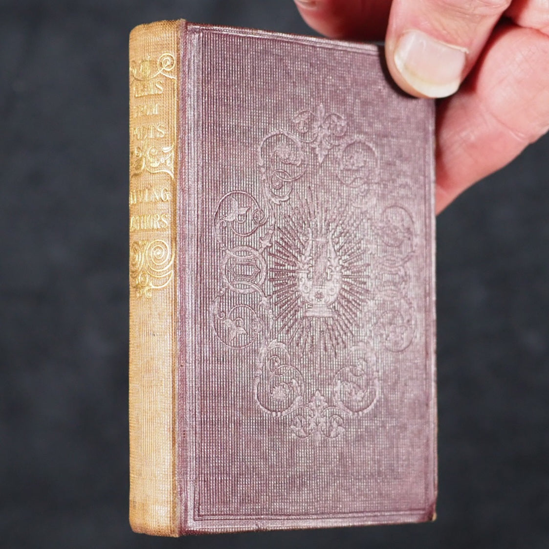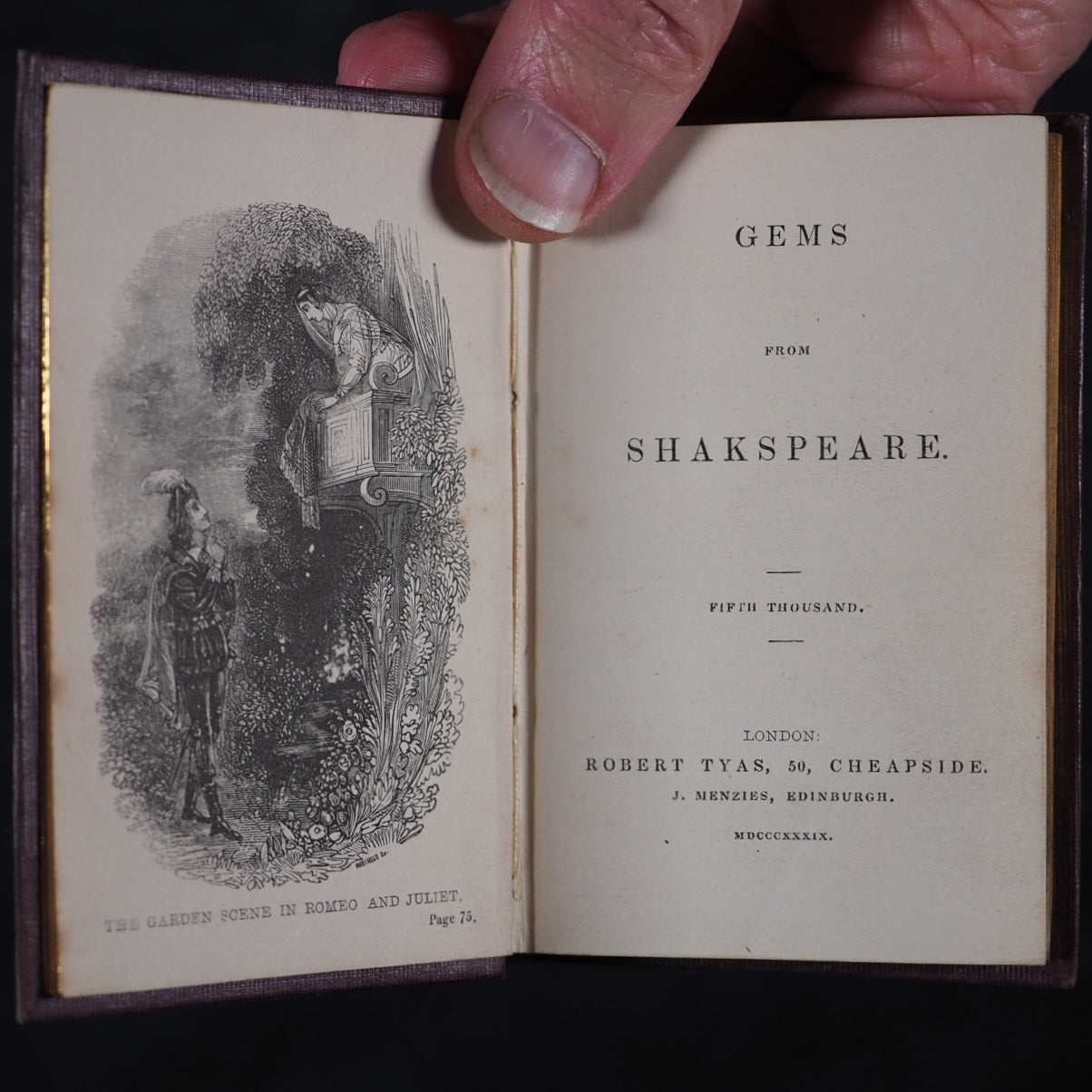 Gems from the Poets. Tyas, Robert. 50 Cheapside : H.T. Warren, 8, Finsbury, London. 1840-1. Complete 6 volume set in original bookcase. Gems from British Poets, Sacred 3rd edition; Gems from British Poets, Falconer to Campbel 2nd edition; Gems from British Poets, Chaucer to Goldsmith 3rd edition; Gems from Shakespeare 5th thousand; Gems from the American Poets 6th edition; Gems from British Poets, Living Authors Chiefly. Engraved frontispieces. Printed by Bradbury & Evans, Whitefriars, London. All edges gilt. Original pale yellow endpapaers. Mixed editions. 64 x 102 mm. Original plum publisher's cloth with gilt titling on spines and blind embossed decorative covers. Complete with publisher's morocco fronted bookcase, glazed door and check red, green and cream patterned paper interior with "Gems from the Poets" in gilt on lintel. Leather hinge sympathetically repaired; corners and edges worn. 150 x 117 x 82 mm. Joffe, 184. OCLC, 932881620, 34060088, 932880549, 78247230, 79079551, 932881615. WorldCat locates generally single didgit numbers of individual titles but no copies of complete sets worldwide. 155 firsts2024