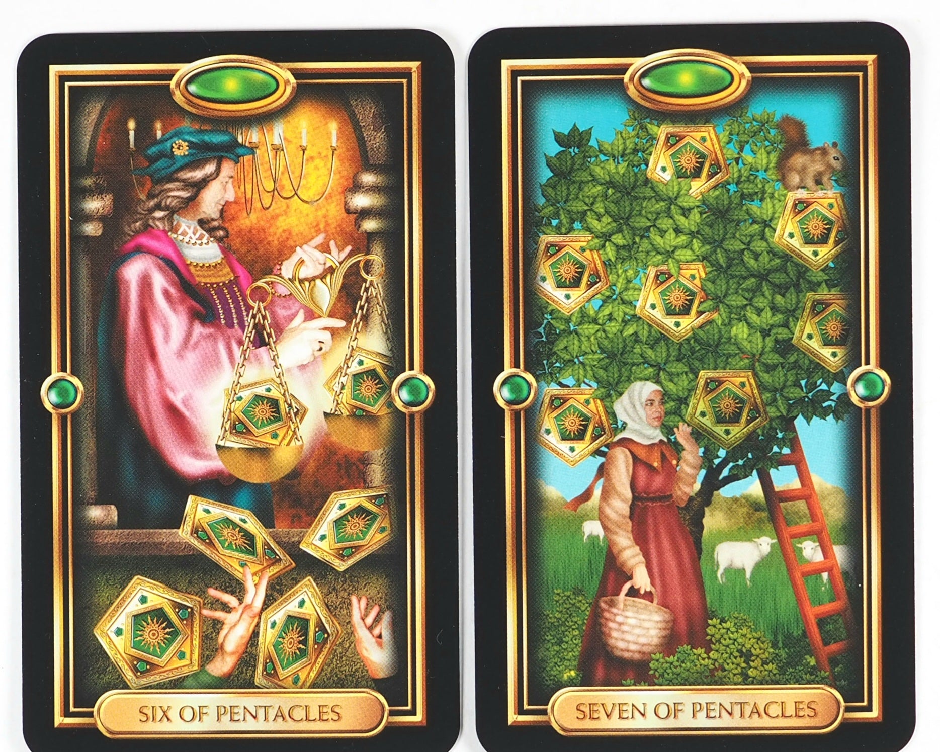 Full-colour cards with rounded corners. 70 x 117 mm. The backs have a ruby bedecked sun design in a gold circular border with further elaborate embellishments.