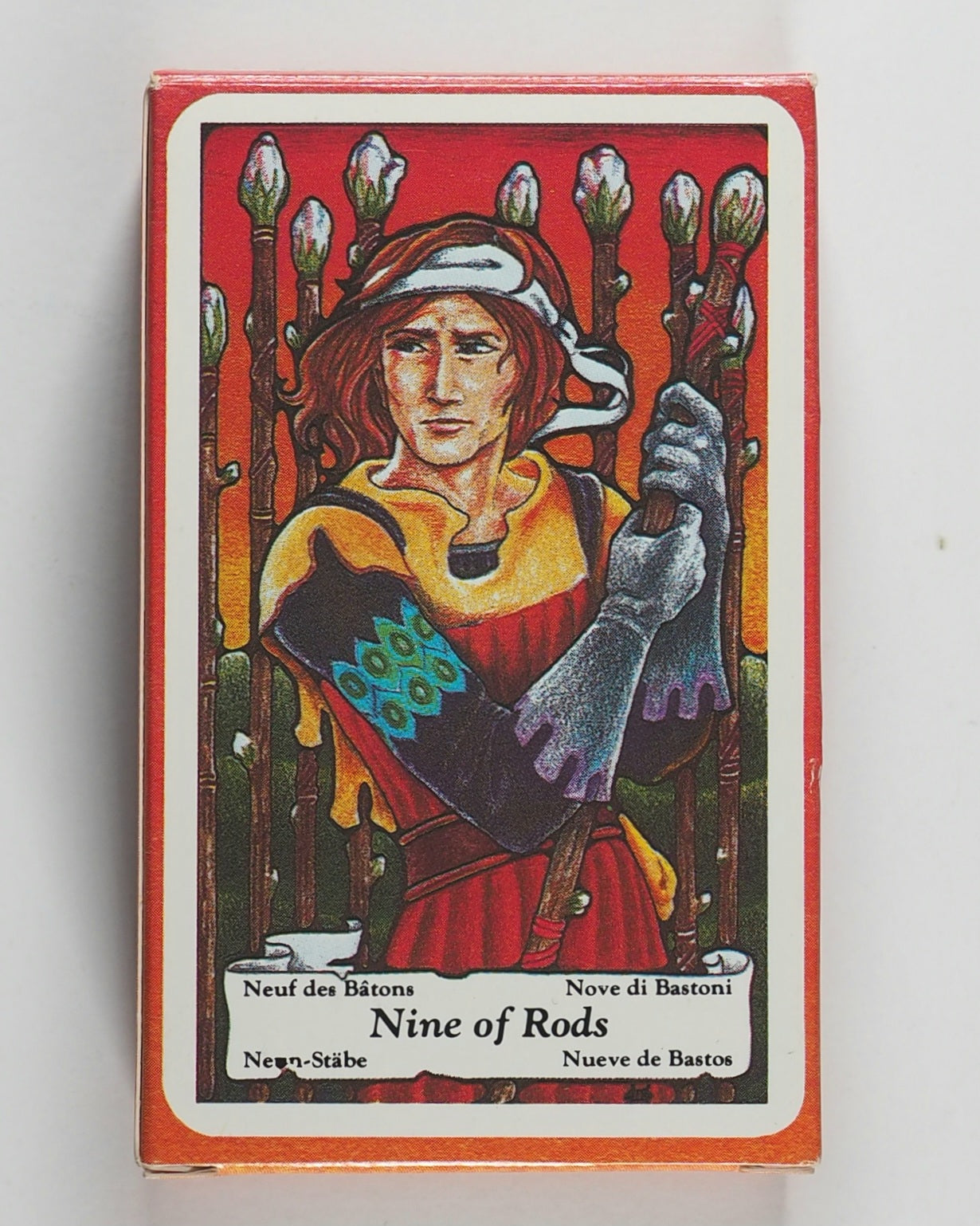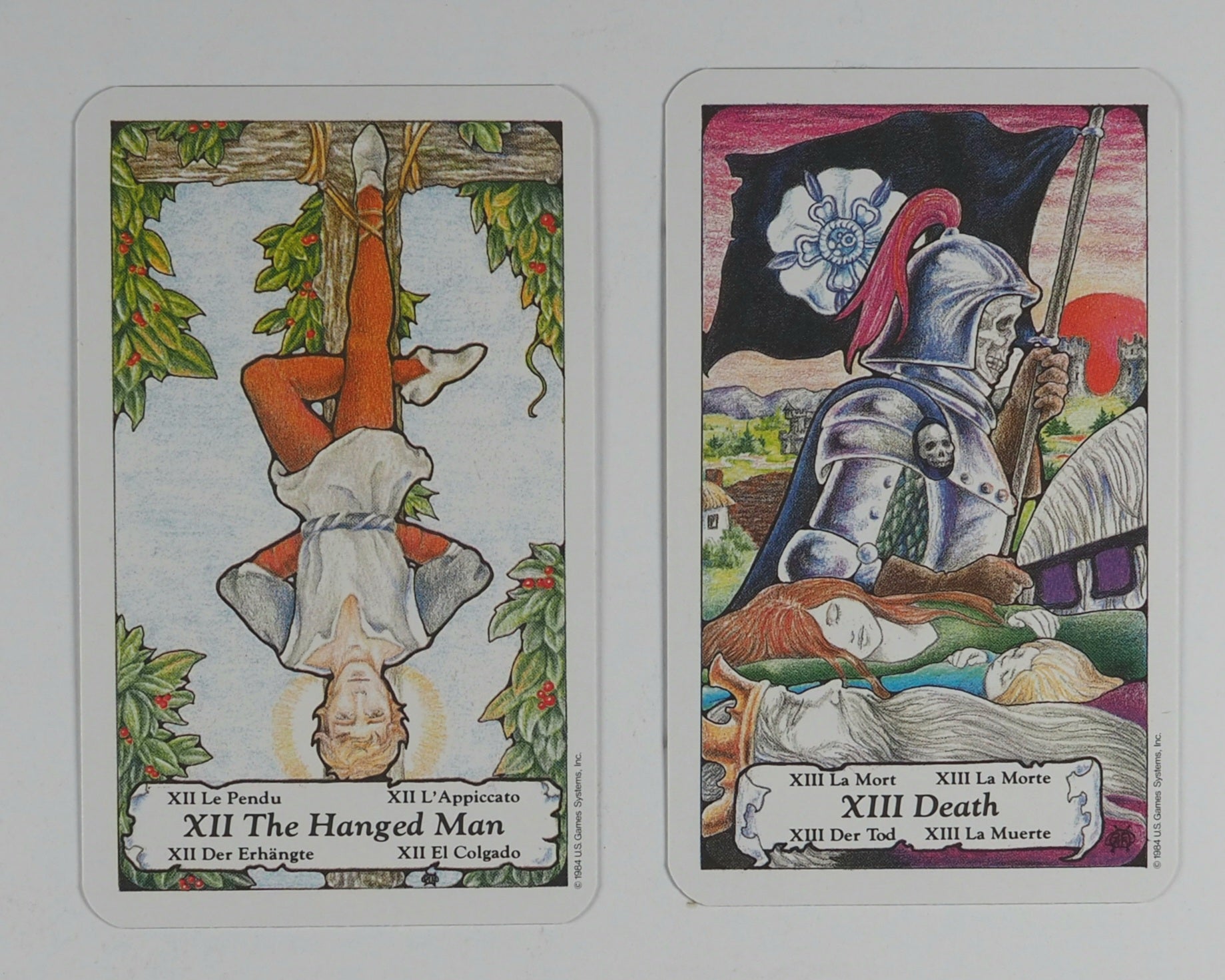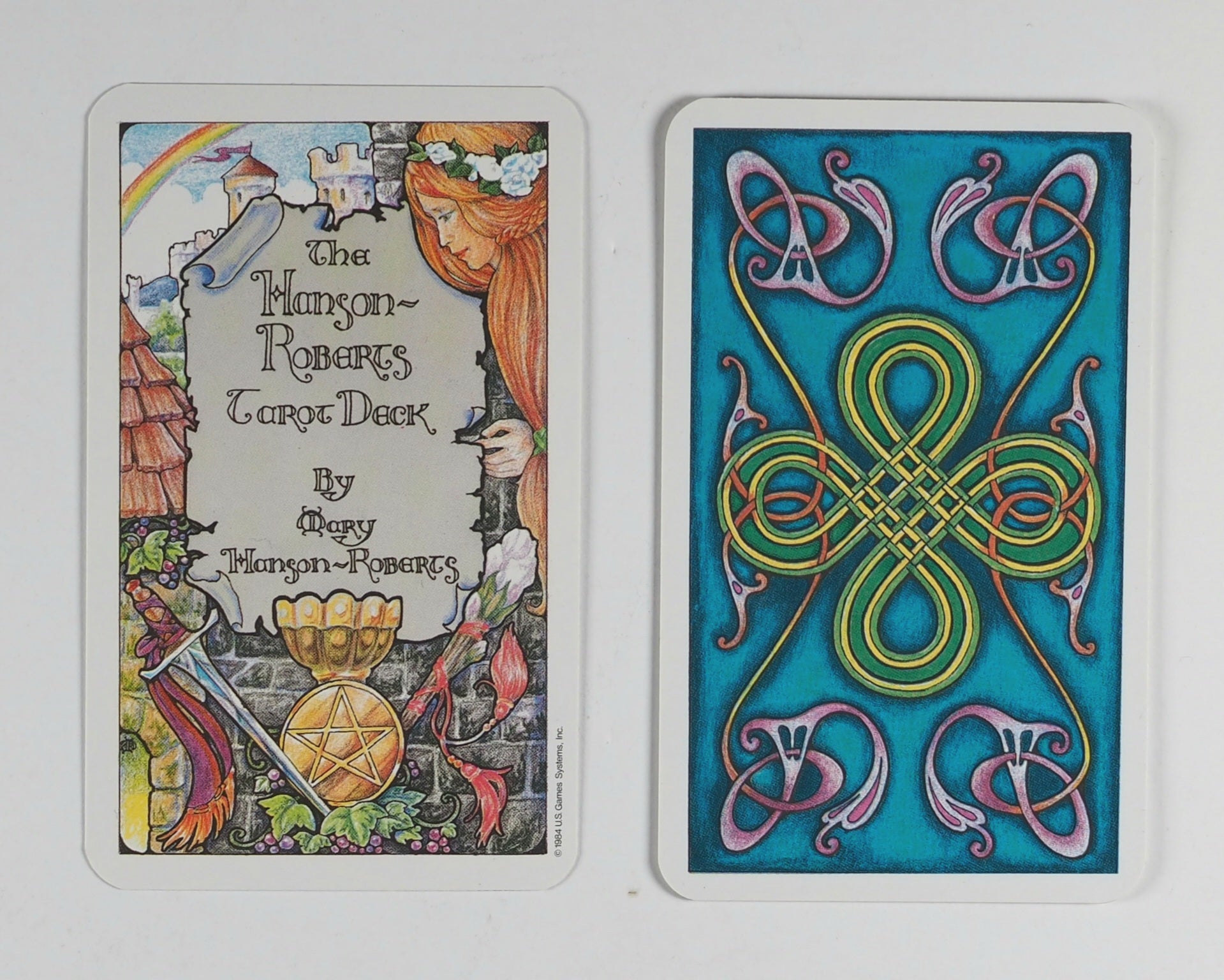 Full-colour cards with rounded corners and copyright '1984 US Games Systems Inc.' on lower right hand side. 60 x 100 mm. The backs have intertwining celtic knot type figure in yellow and green with art nouveau corner pieces in lilac on a light blue ground.