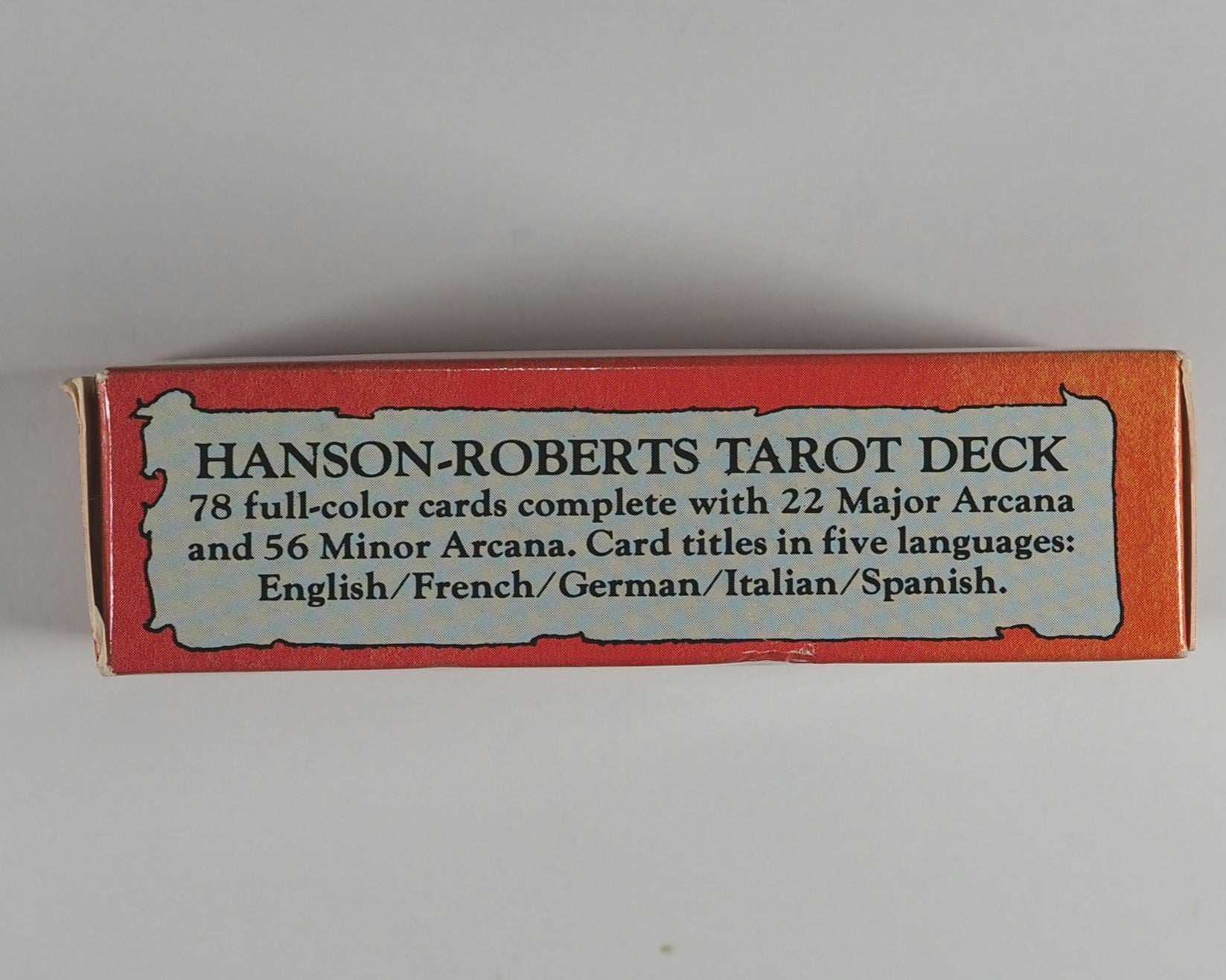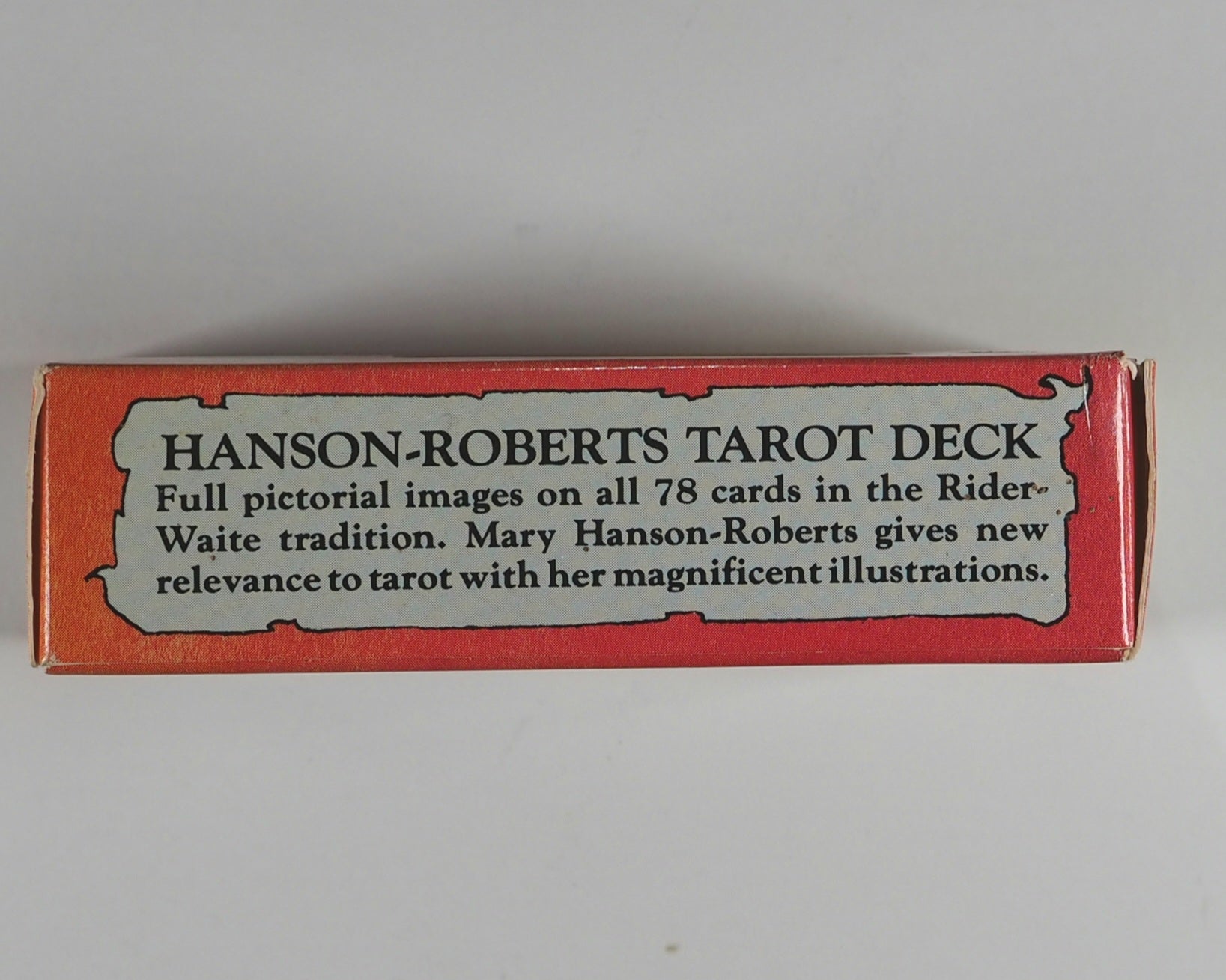 Complete 78 card Hanson-Roberts Tarot Deck, illustrated by Mary Hanson-Roberts. Contains 22 Major Arcana and 56 Minor Arcana cards in the style of traditional Rider-Waite tarot. Printed in Belgium.