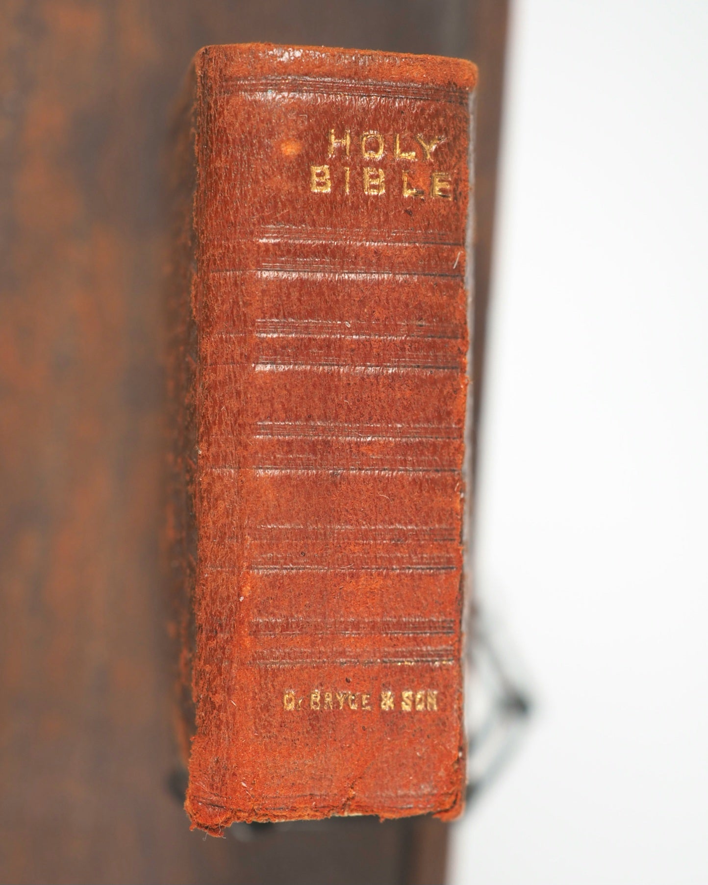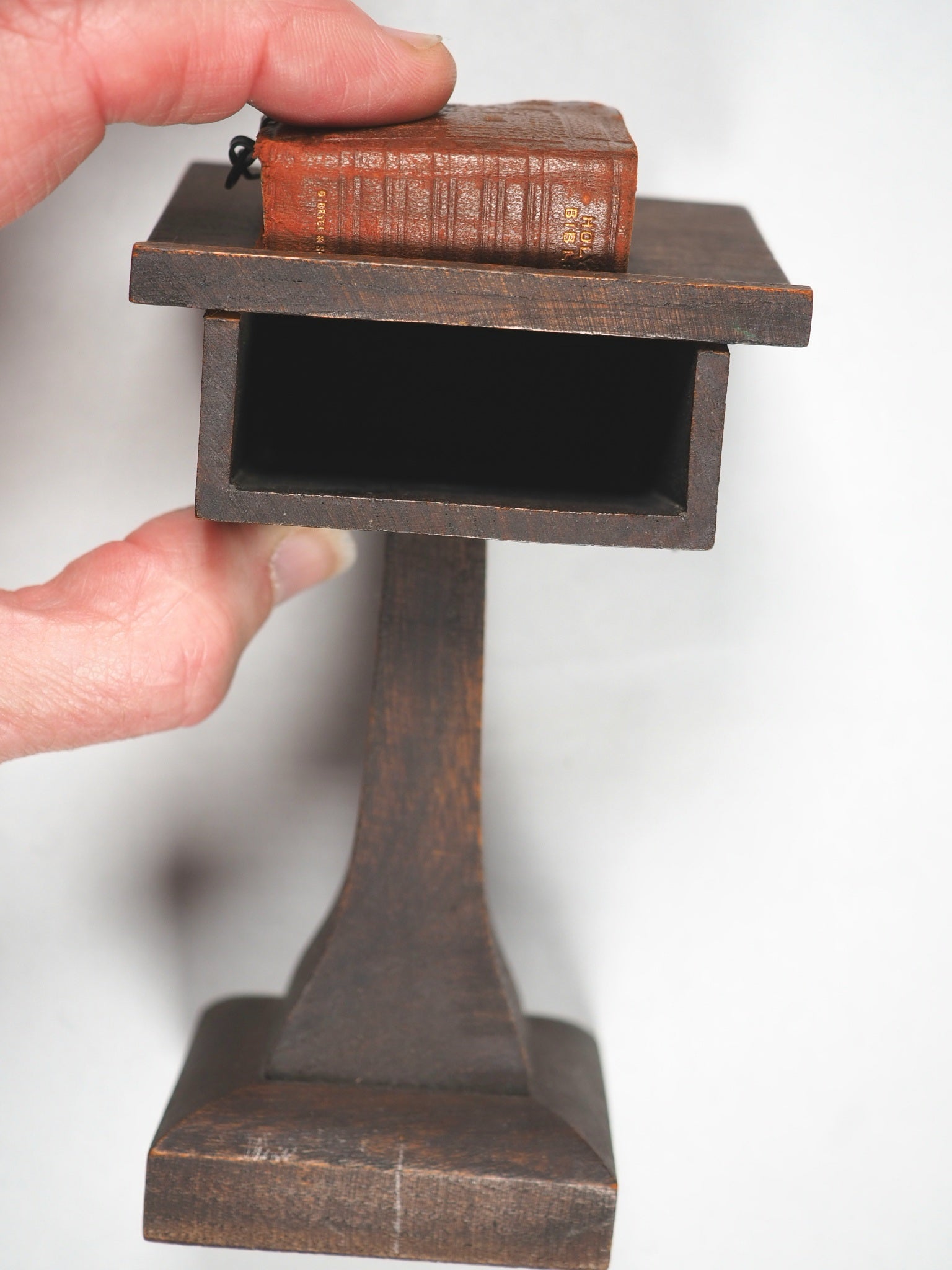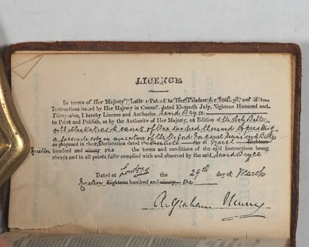 876 pages with 28 full-page illustrations, reduced from designs by Charles Bell Birch, all on finest India paper. License leaf on verso of title-page indicates 1901 as publication date. Title page with tiny closed tear. 30 x 46 mm (book size). Original brown calf in the antique style blind-stamped in imitation of 16th century binding (minuscule wear to foot of spine and short crack along one half of the hinge). Complete with magnifying glass inside the back cover. Original dark metal chain attaching it to the lectern. Lectern height 13.63 cm & width 8.12 cm. Paper printed label on base of pedestal describes it as a facsimile of those chained bibles found in some English Cathedrals (old clear tape repair). This item was originally sold in a red cardboard box with a printed label - but this is rarely found and sadly not present here. Bondy, 109. Spielmann, 25. Welsh, 562. The text is a reduced facsimile of the Oxford Pica 16mo edition, printed by the Glasgow University Press on "very thinnest" paper supplied by Henry Frowde and the Oxford University Press. This item was originally sold in a red cardboard box with a printed label - but this is rarely found and sadly not present here. The text was produced using advanced photolithography techniques, which allowed large volumes to be reduced to a very small size while maintaining a surprising degree of clarity and legibility, though still difficult to read without aid. This design is a charming facsimile of the large, chained Bibles found in some English cathedrals and churches from centuries past, which were chained to prevent theft when books were extremely valuable. This edition represents a fascinating intersection of Victorian craftsmanship, technological innovation in printing, and historical whimsy!