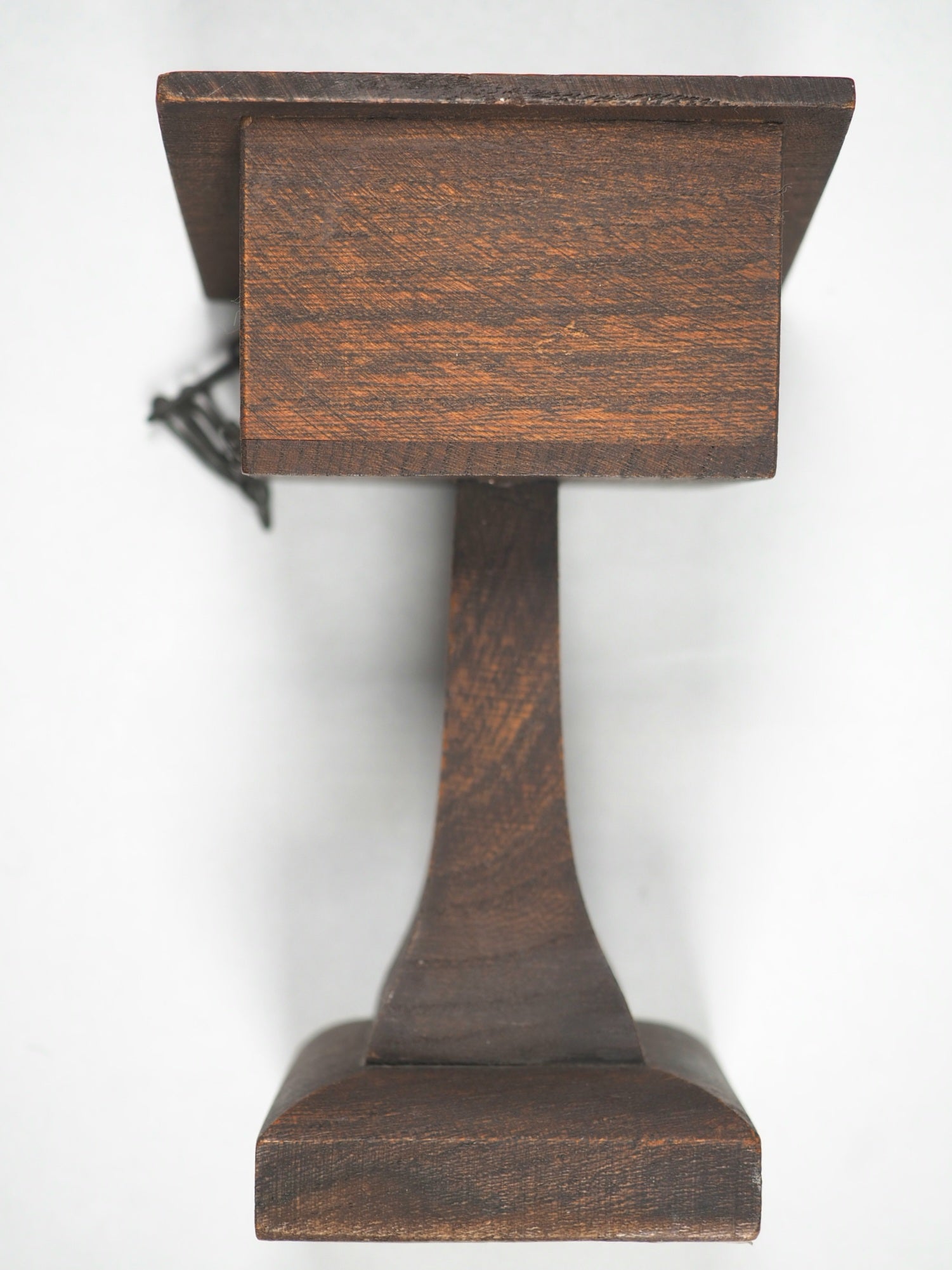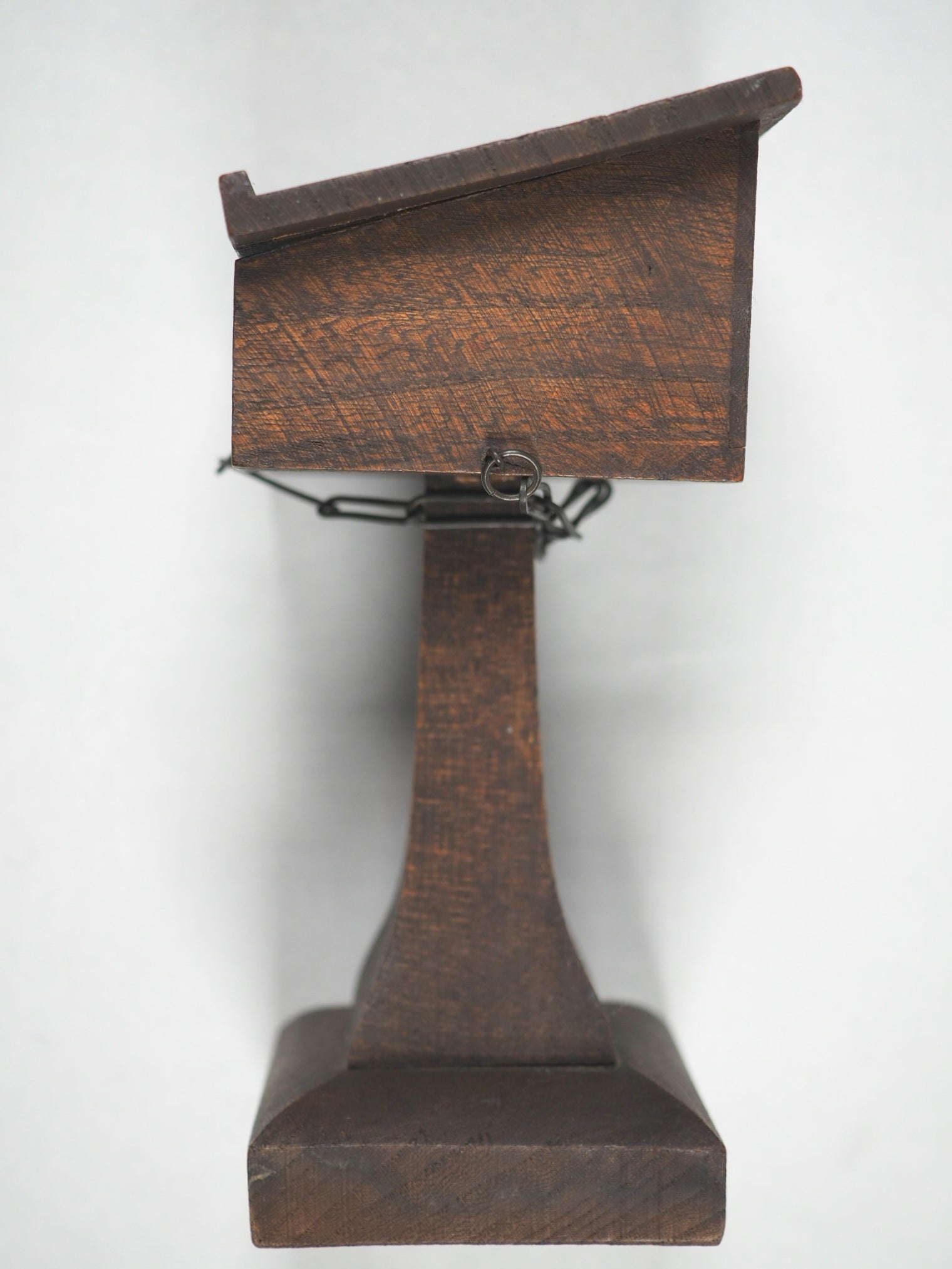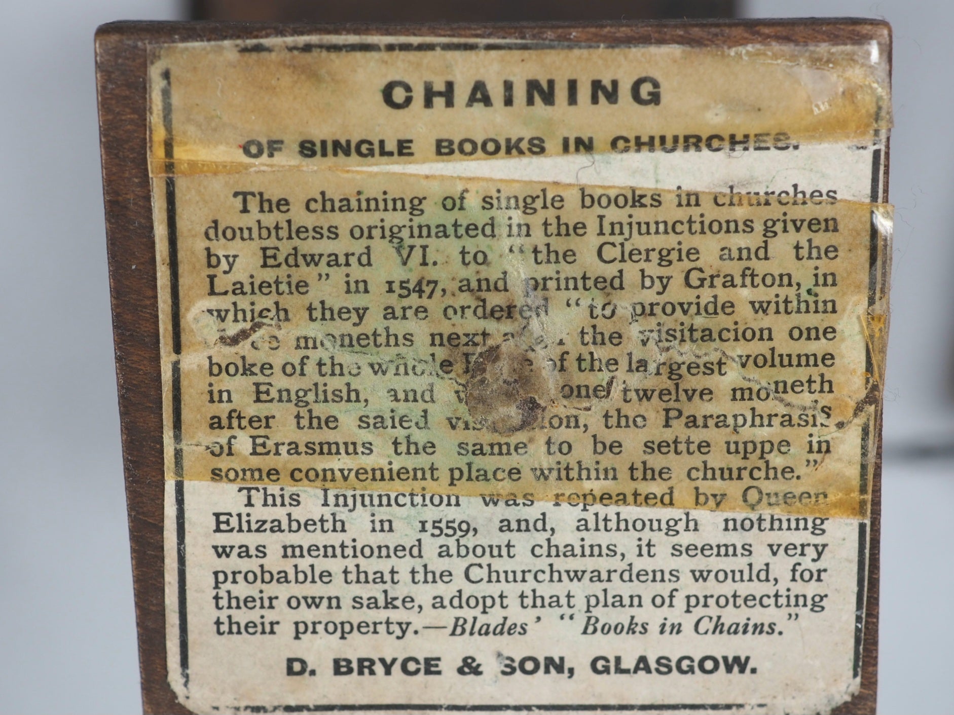 876 pages with 28 full-page illustrations, reduced from designs by Charles Bell Birch, all on finest India paper. License leaf on verso of title-page indicates 1901 as publication date. Title page with tiny closed tear. 30 x 46 mm (book size). Original brown calf in the antique style blind-stamped in imitation of 16th century binding (minuscule wear to foot of spine and short crack along one half of the hinge). Complete with magnifying glass inside the back cover. Original dark metal chain attaching it to the lectern. Lectern height 13.63 cm & width 8.12 cm. Paper printed label on base of pedestal describes it as a facsimile of those chained bibles found in some English Cathedrals (old clear tape repair). This item was originally sold in a red cardboard box with a printed label - but this is rarely found and sadly not present here. Bondy, 109. Spielmann, 25. Welsh, 562. The text is a reduced facsimile of the Oxford Pica 16mo edition, printed by the Glasgow University Press on "very thinnest" paper supplied by Henry Frowde and the Oxford University Press. This item was originally sold in a red cardboard box with a printed label - but this is rarely found and sadly not present here. The text was produced using advanced photolithography techniques, which allowed large volumes to be reduced to a very small size while maintaining a surprising degree of clarity and legibility, though still difficult to read without aid. This design is a charming facsimile of the large, chained Bibles found in some English cathedrals and churches from centuries past, which were chained to prevent theft when books were extremely valuable. This edition represents a fascinating intersection of Victorian craftsmanship, technological innovation in printing, and historical whimsy!