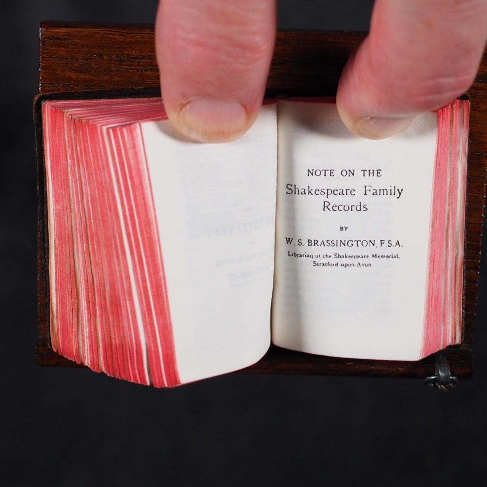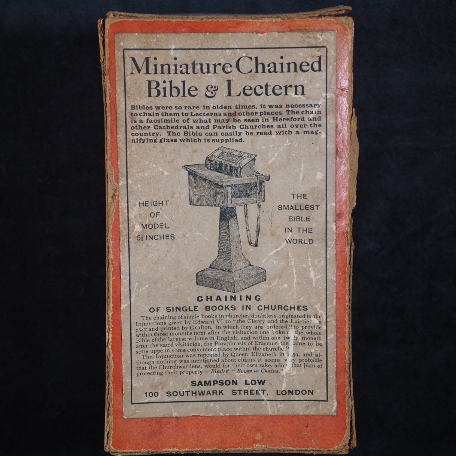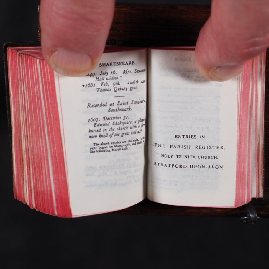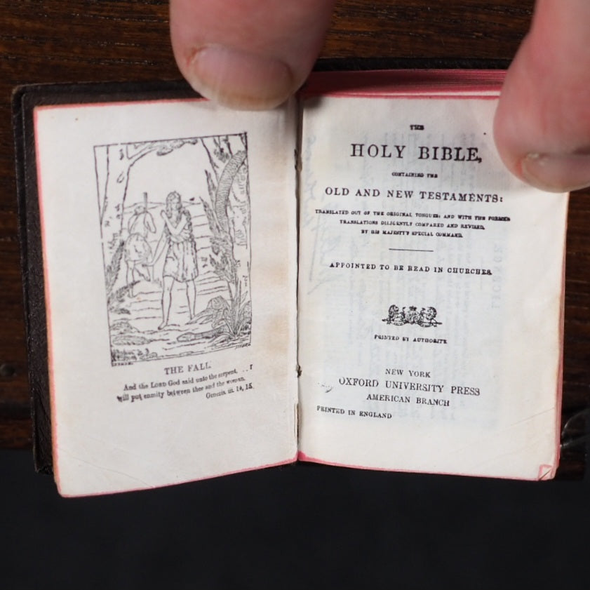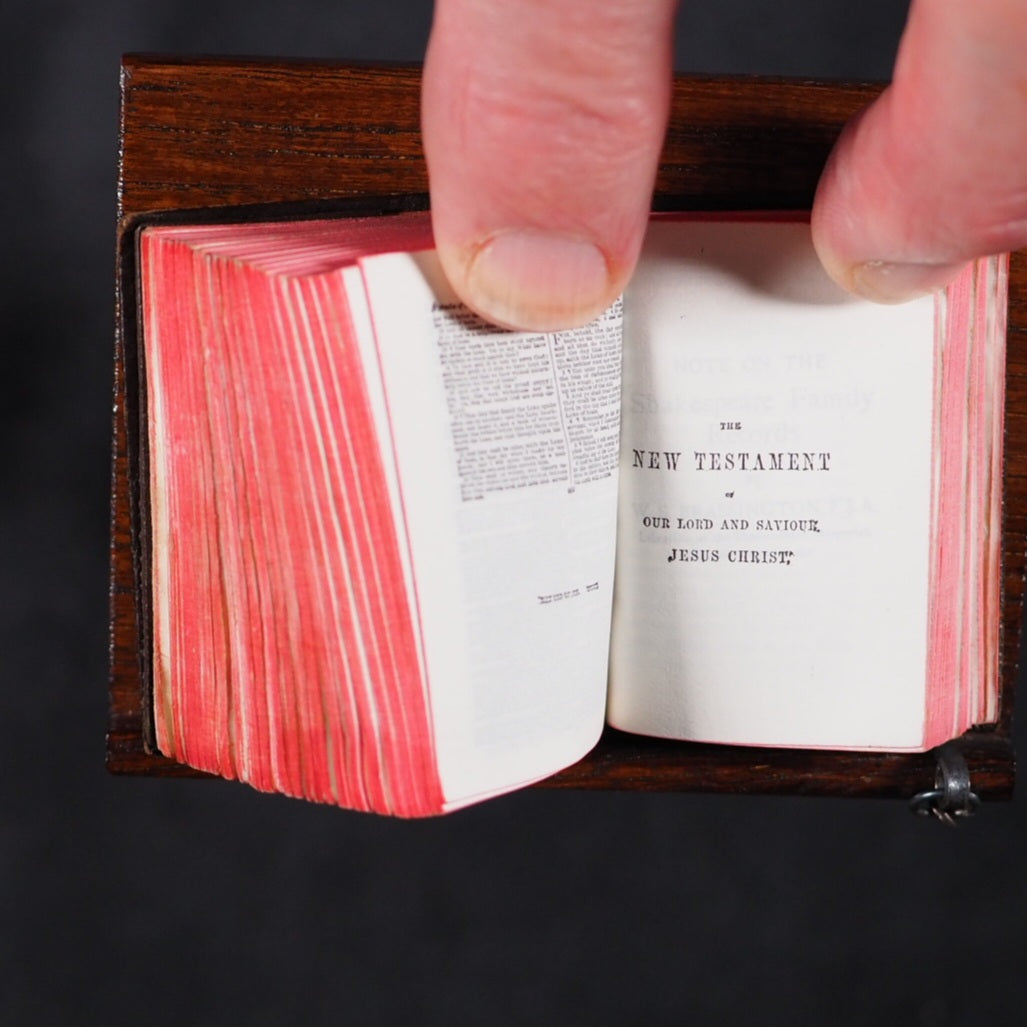 Bible and Lectern in original Sampson Low box. Holy Bible containing the Old and New Testaments. Oxford University Press. American Branch. New York. 1919.[2], 876 printed pages on finest India paper. 28 full-page line illustrations of testament scenes reduced from designs by Charles Bell Birch, A.R.A. (1832-93) with permission of Messrs S. Bagster & Son. 'Printed in England' on verso of title-page. But on colophon, 'Glasgow : printed at the University Press'. It contains notes on the Shakespeare family records and facsimiles of the entries in the parish register, Stratford Upon Avon, included between Old & New Testaments. 'Licence' to Nimmo Hay and Mitchell, 18 Clyde Street, Edinburgh on verso title-page indicates 1919 as publication date; ; also gives permission to print 20,000 copies. Signed J.A. Clyde. All edges red (very slightly marked). 36 x 50 mm. Original brown calf in the antique style, blind-stamped in imitation of 16th century binding (a few mild scuffs). Holy Bible in gilt on spine. Magnifying glass in front cover pocket. Chained with original metal links to wooden Lectern, 8.5 x 15.4 cm. Paper printed label on shelf above pedestal, describes it as a facsimile of those chained bibles found in some English Cathedrals ("Miniature Chained Bible and Lecturn: Bibles were so rare in olden times, it was necessary to chain them to Lecterns and other places. The chain is a facsimile of what may be seen in Hereford and other Cathedralss and Parish Churches all over the country. The Bible can easily be read with a magnifying glass which is supplied"). This particular example is in unusually good condition, more often found rubbed or defective. Presented here as it was originally sold, in a red cardboard box with a printed label - this original packaging rarely survives but fortunately is present here (edge worn; lid slightly faded and one edge of lid partly torn away). Bondy, 109. Bromer/Edison, 77. Spielmann, 25. Welsh, 566. OCLC, 1013974681. WorldCat locates 1 copy worldwide (Iowa University library). Seller Inventory 166 firsts2024