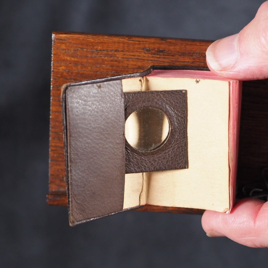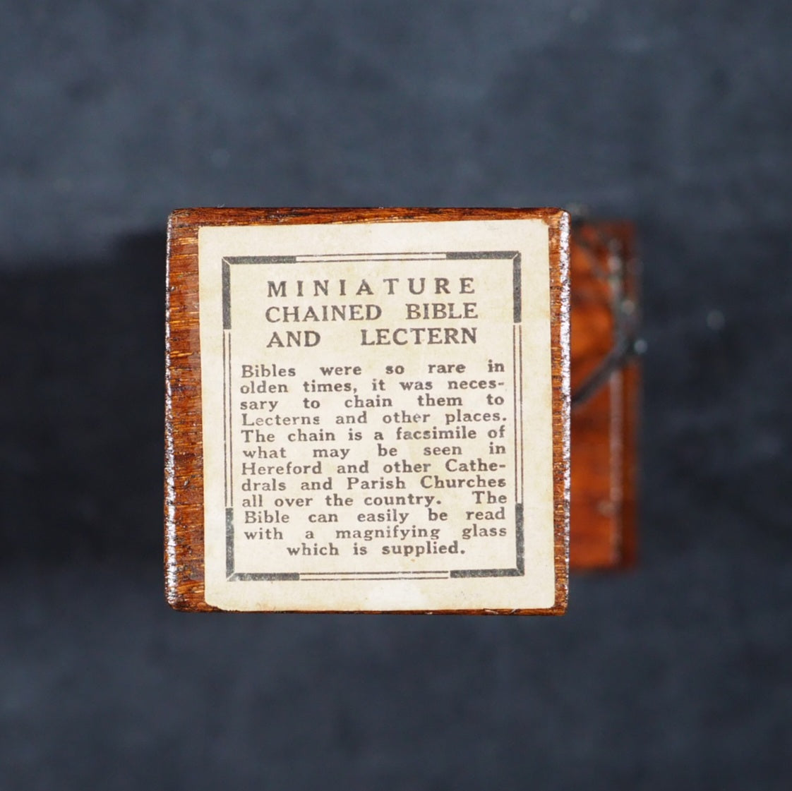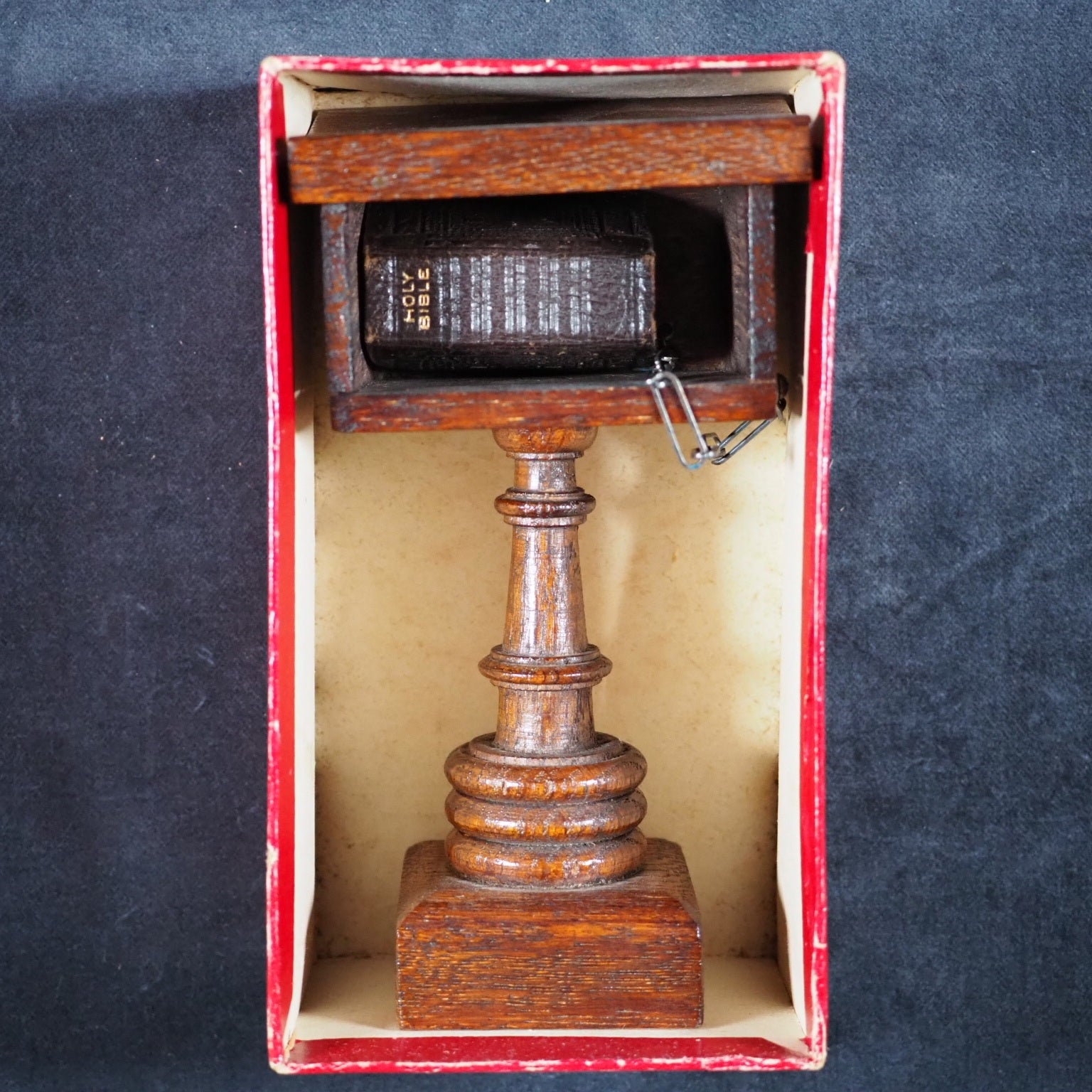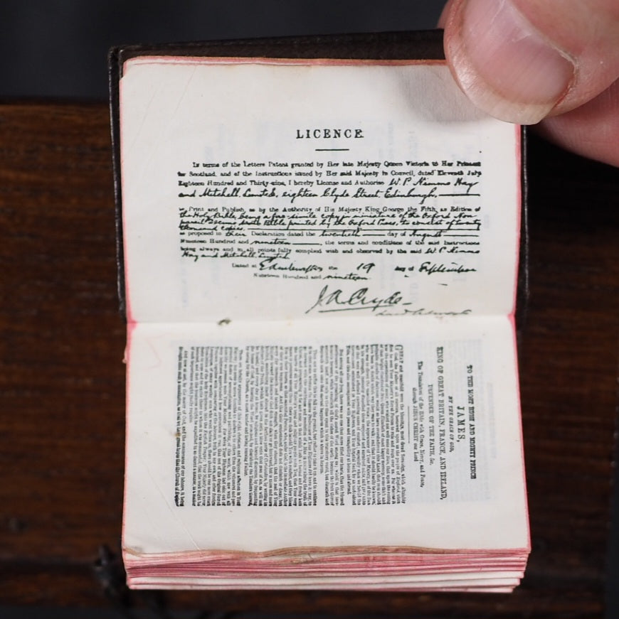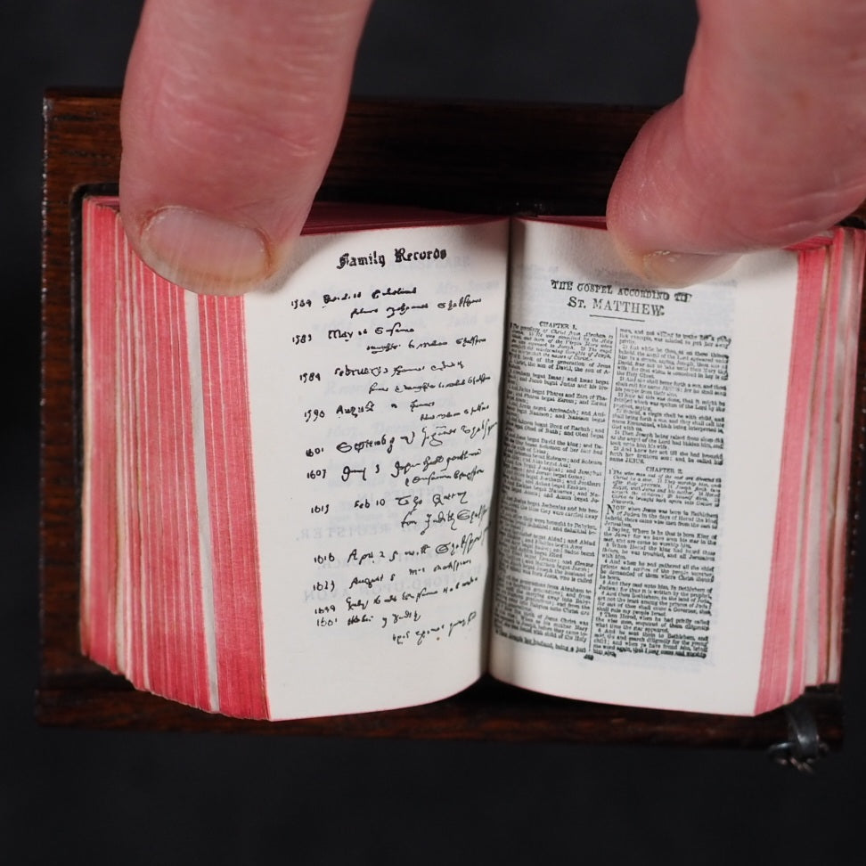 Bible and Lectern in original Sampson Low box. Holy Bible containing the Old and New Testaments. Oxford University Press. American Branch. New York. 1919.[2], 876 printed pages on finest India paper. 28 full-page line illustrations of testament scenes reduced from designs by Charles Bell Birch, A.R.A. (1832-93) with permission of Messrs S. Bagster & Son. 'Printed in England' on verso of title-page. But on colophon, 'Glasgow : printed at the University Press'. It contains notes on the Shakespeare family records and facsimiles of the entries in the parish register, Stratford Upon Avon, included between Old & New Testaments. 'Licence' to Nimmo Hay and Mitchell, 18 Clyde Street, Edinburgh on verso title-page indicates 1919 as publication date; ; also gives permission to print 20,000 copies. Signed J.A. Clyde. All edges red (very slightly marked). 36 x 50 mm. Original brown calf in the antique style, blind-stamped in imitation of 16th century binding (a few mild scuffs). Holy Bible in gilt on spine. Magnifying glass in front cover pocket. Chained with original metal links to wooden Lectern, 8.5 x 15.4 cm. Paper printed label on shelf above pedestal, describes it as a facsimile of those chained bibles found in some English Cathedrals ("Miniature Chained Bible and Lecturn: Bibles were so rare in olden times, it was necessary to chain them to Lecterns and other places. The chain is a facsimile of what may be seen in Hereford and other Cathedralss and Parish Churches all over the country. The Bible can easily be read with a magnifying glass which is supplied"). This particular example is in unusually good condition, more often found rubbed or defective. Presented here as it was originally sold, in a red cardboard box with a printed label - this original packaging rarely survives but fortunately is present here (edge worn; lid slightly faded and one edge of lid partly torn away). Bondy, 109. Bromer/Edison, 77. Spielmann, 25. Welsh, 566. OCLC, 1013974681. WorldCat locates 1 copy worldwide (Iowa University library). Seller Inventory 166 firsts2024