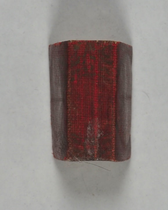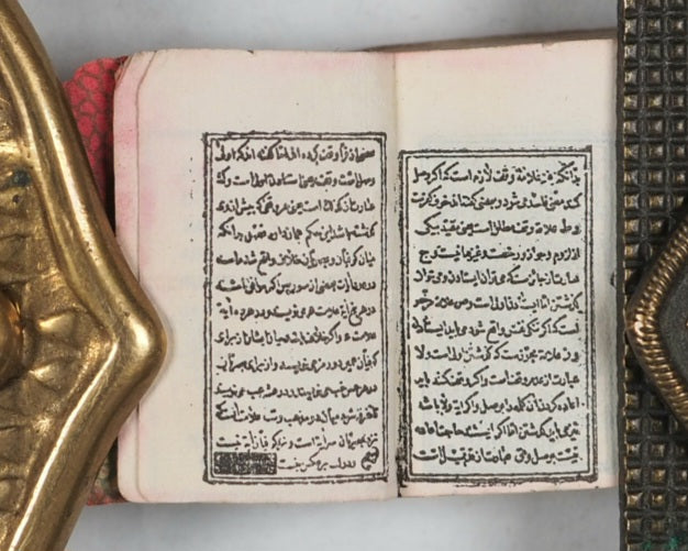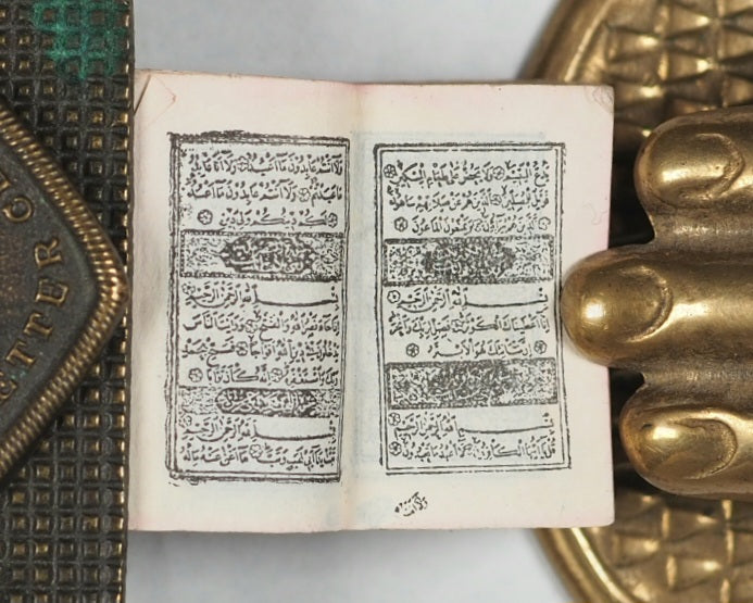 Usually offered by the publisher in oblong tin, brass or silver lockets with hinged door and inset magnifier but this copy did not have a case. Occasionally issued as one of a twelve-volume set in a metal shelved glass case with the heading "Midget Library," accompanied by separate miniature magnifying glass; case then fits into an angled wooden stand. Many copies with lockets were supplied to Indian and other Muslim soldiers fighting for the British in the Second Boer War and later World War I, where they were worn as pendants and objects of fascination that carried talismanic properties, as well as serving as functional Qur'ans for reading with the help of the magnifying glass .