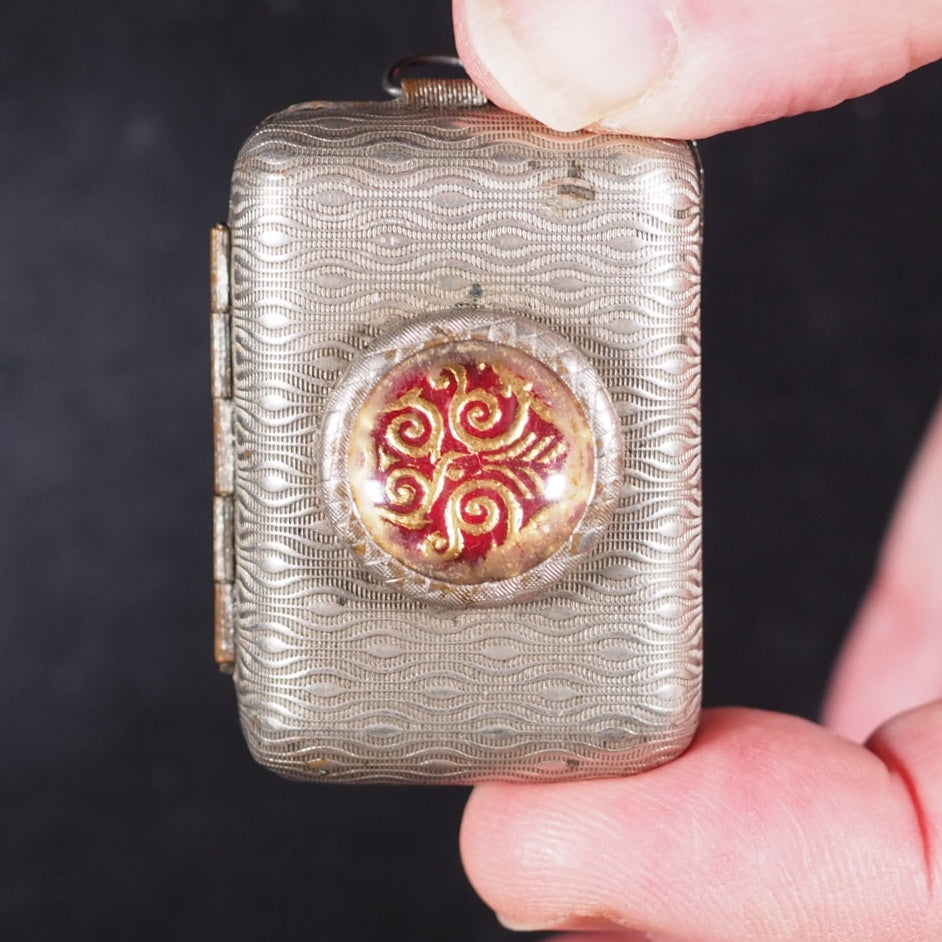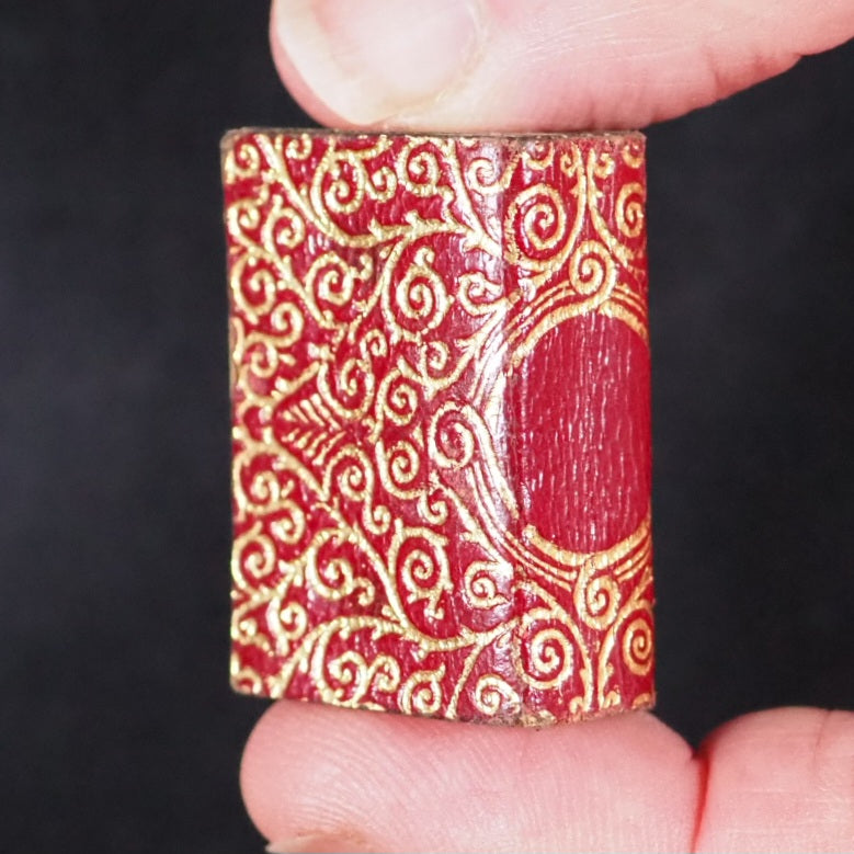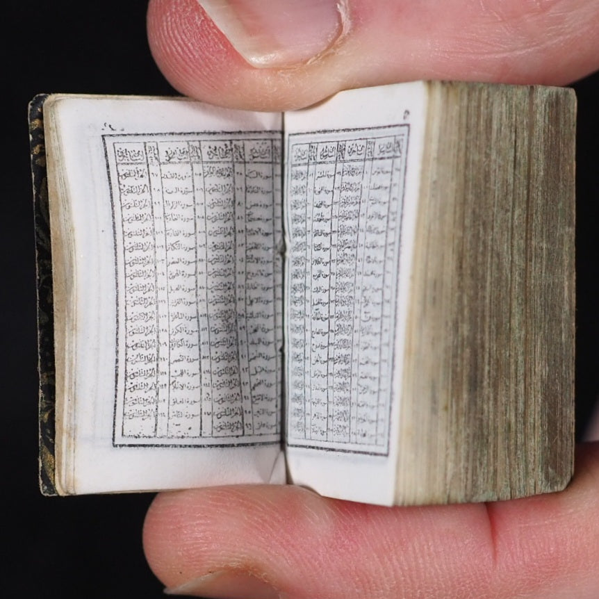 Koran, Qur'an Qur'an Steinbrener, Hans. Vimperk (or Winterberg), Czech Republic. Circa 1900. About 800 printed pages in Arabic. Fine India paper. Lithographed text and marginal decoration, printed in Arabic within ruled borders. Original patterned endpapers; flower and leaf pattern in gilt on black ground. An early Steinbrener edition, following on from the success of Bryce's 1896 edition that was reprinted in 1899 and 1907. Hans Steinbrener was established in 1855, and held a Royal warrant to publish almanacs and religious texts in different European languages. Taking advantage of the new technique of photo-reduction Steinbrenner printed these qu'rans from the late 1890s-1960s in Vimperk, or Winterberg, Czech Republic. The text, endpapers and bindings differ from the equivalent Bryce Koran. They became widely distributed across America and Europe but the early examples are far less common. 22 x 34 mm. Original red and elaborately stamped gilt morocco with lotus motifs, and scrolling curlicue decoration. Larger than the Bryce Koran (20 x 28 mm.) Original engine turned, un-hallmarked silver metal locket incorporating magnifying glass on the front and loop at the top (in base metal); tarnished inside. 82 firsts2024