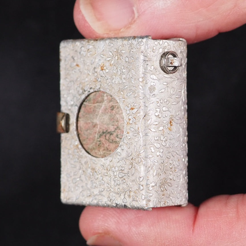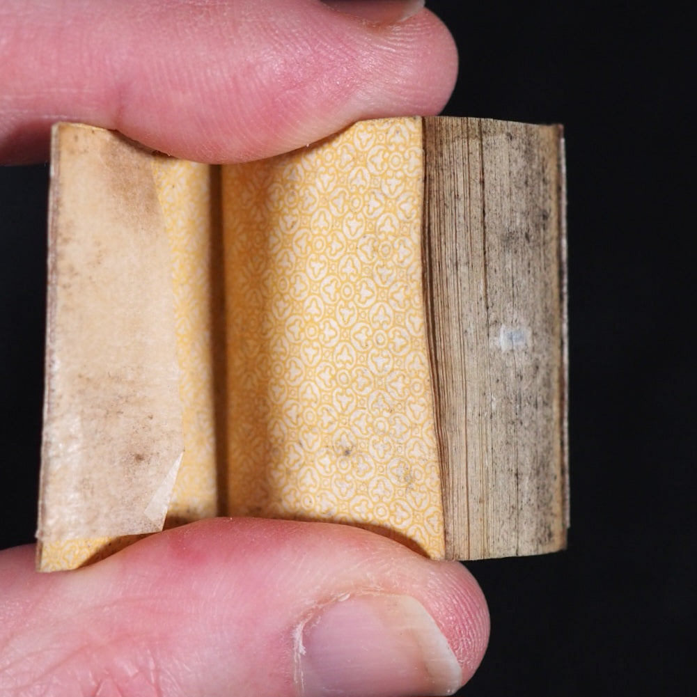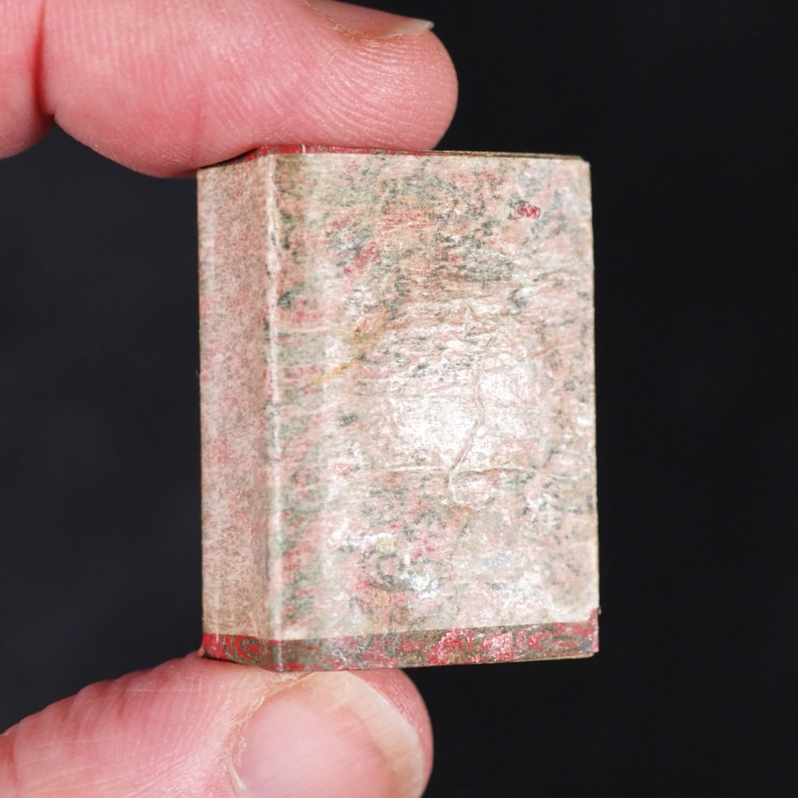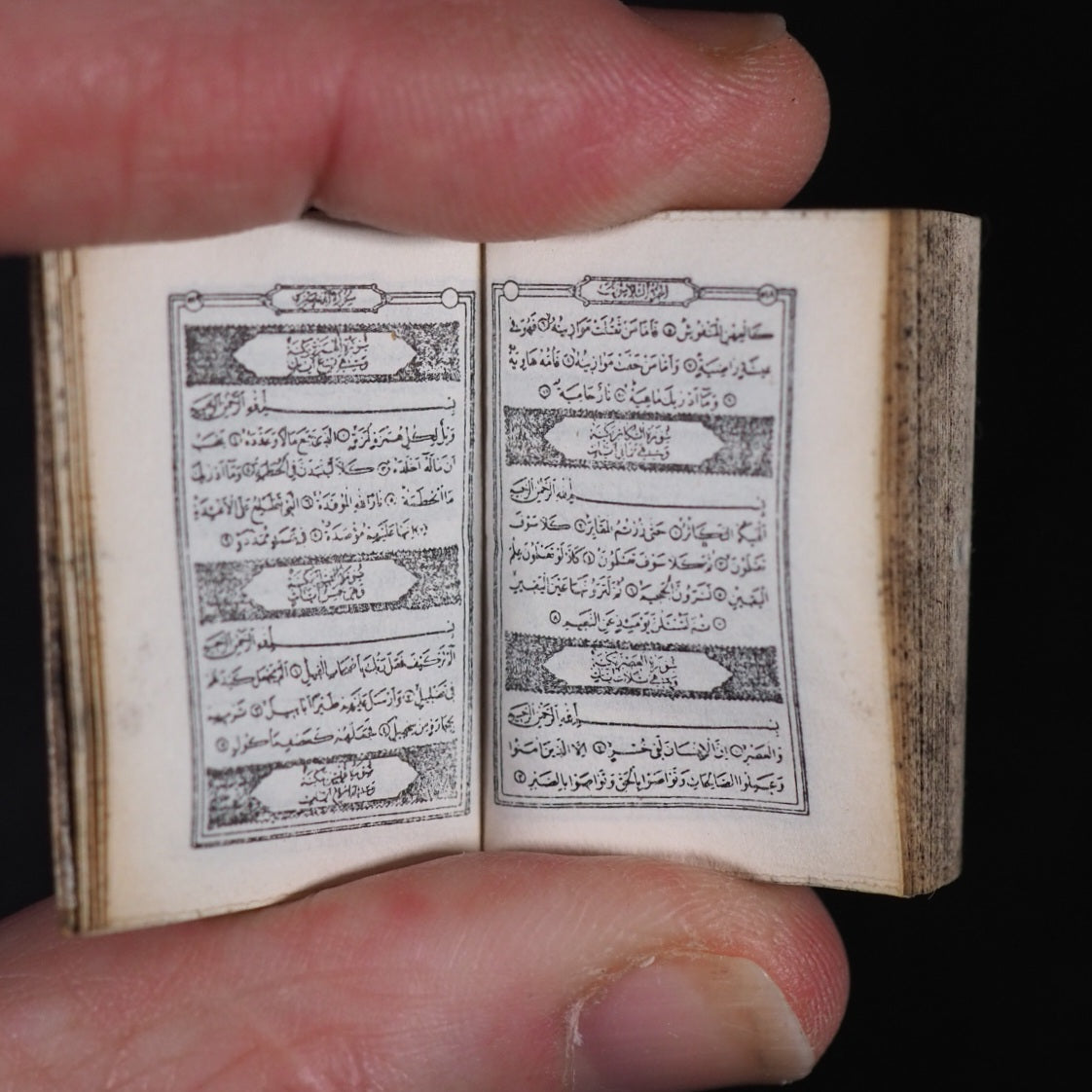 Koran, Qur'an. Steinbrener, Hans. Vimperk, or Winterberg, Czech Republic. Circa 1930. About 800 printed pages in Arabic. Fine India paper. Lithographed text and marginal decoration, printed in Arabic within ruled borders. Original patterned endpapers; white flower pattern on a yellow ground (slightly damp marked). Text block has some dark mould spotting. An early twentieth century Steinbrener edition, following on from the success of Bryce's 1896 edition that was reprinted in 1899 and 1907. Hans Steinbrener was established in 1855, and held a Royal warrant to publish almanacs and religious texts in different European languages. Taking advantage of the new technique of photo-reduction Steinbrenner printed these qu'rans from the late 1890s-1960s in Vimperk, or Winterberg, Czech Republic. The text, endpapers and bindings differ from the equivalent Bryce Koran. They became widely distributed across America and Europe but the earlier examples are less common. 24 x 34 mm. Original red leatherette decorated with gilt curlicue design. Complete with original protective transparent paper covering. Historic damp has rendered large parts of the semi-transparent paper covering attached to the binding underneath. It is quite unusual to see a copy in such original and unread state, but there are a few condition considerations. Original book-shaped, embossed aluminium metal locket incorporating magnifying glass at the front, circular 'window' at the back and loop (unusually) on the side. With removable locking piece that is manufactured to resemble the edges of a book - this is not of a type typically found. 80 firsts2024